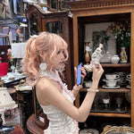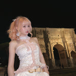 With its delicate ruffles, soft pink florals, and dreamy silhouette, it feels like wandering through an ancient city filled with whispered legends and timeless charm.