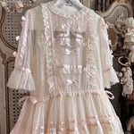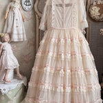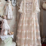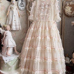 This gown set pairs a sheer tulle overlay adorned with pastel ribbons and lace, layered over an ivory slip dress. Crafted from Japanese tulle, silk ribbons, and delicate lace, it evokes the innocence of antique gowns while offering graceful modern wearability. The cascading ruffles and ribbon detailing create a silhouette that feels both ethereal and nostalgic.