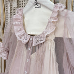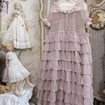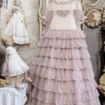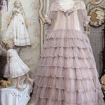 This gown set features a misty lilac sheer gown layered over an antique white slip dress, creating a delicate play of light and shadow. Crafted from silk cotton, French lace, and natural shell buttons, it embodies the grace of Victorian romance with modern comfort. The tiered ruffles and smocked details give it a floating, ethereal silhouette.