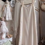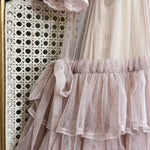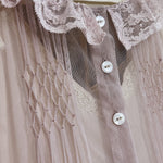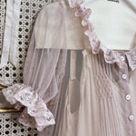 アンティークホワイトのスリップドレスに、淡いライラック色のシアーガウンを重ねた二点セット。シルクコットンとフランス製レース、天然シェルボタンで仕立てられ、ヴィクトリア時代のロマンティックな雰囲気を漂わせながら、軽やかな着心地を叶えています。幾重にも重なるフリルとスモッキングのディテールが、夢のように浮遊感のあるシルエットを生み出します。