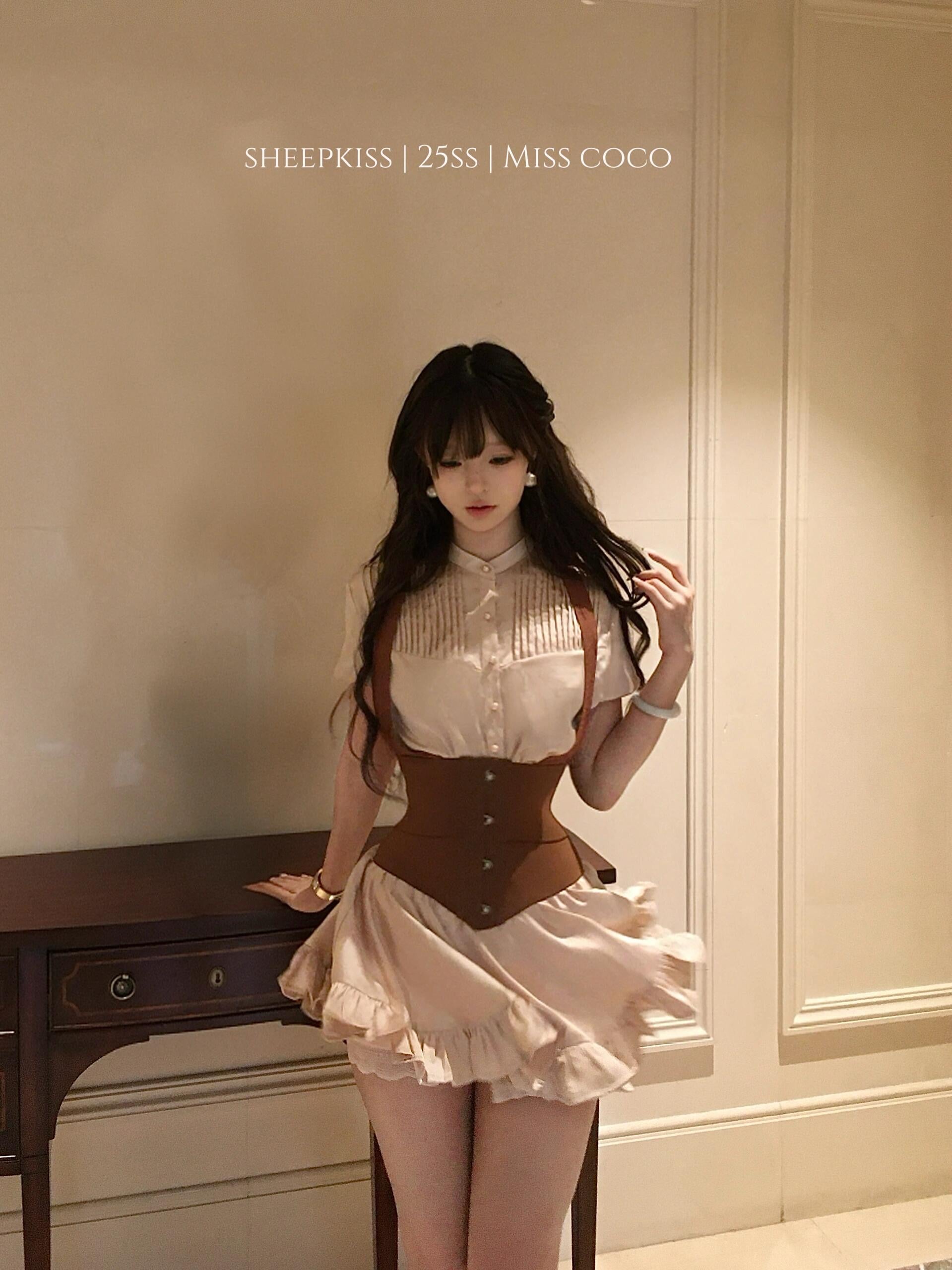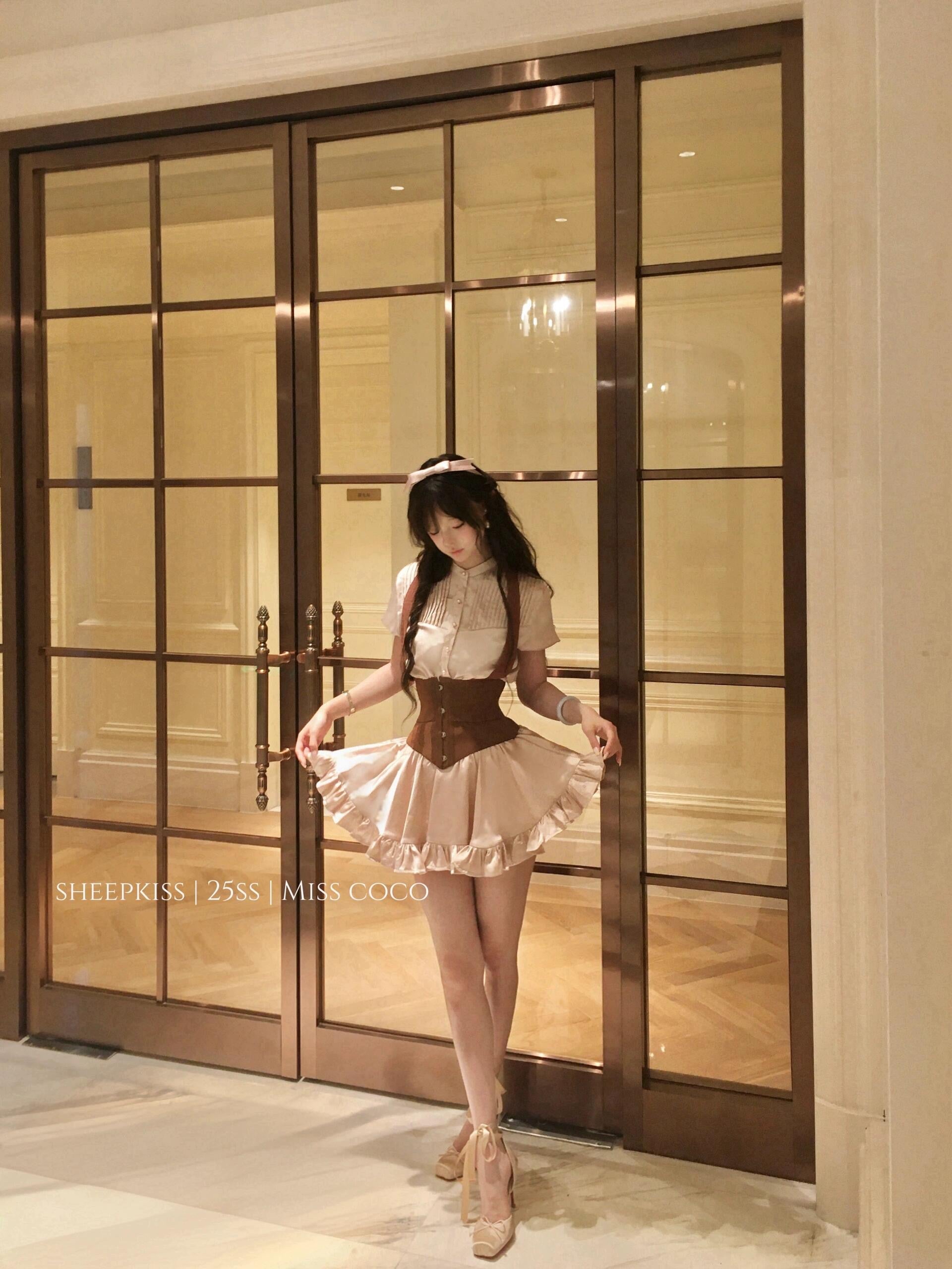 The top features delicate pleating and a refined mandarin collar, paired with pearl buttons for a touch of noble charm. The peplum waistline gently flares, enhancing the silhouette with a playful yet polished feel. The skirt’s built-in lace-trimmed safety shorts add both security and sweetness, blooming out like a little cupcake when you twirl.