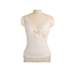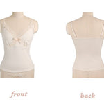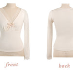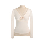 This is a versatile and soft knit top with a very supple fabric that is stretchy. The V-neck design nicely accentuates the neckline and collarbones. The lace bow embellishment at the chest adds a touch of playful and agile charm.
