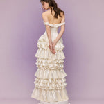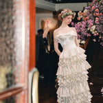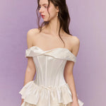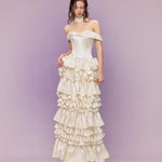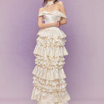 Introducing the Bourrée Cream Ruffle Gown, a poetic creation from SONGE ATELIER 25SS. This off-shoulder design softly grazes the collarbone like a whisper of moonlight, gently revealing the warmth of a secret daydream.