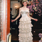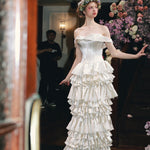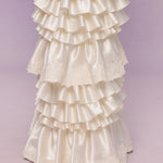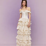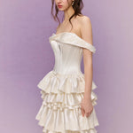 The bodice is exquisitely corseted to shape a delicate hourglass figure, blending vintage romance with modern charm. Cascading down the skirt, layers upon layers of satin ruffles ripple like whipped cream — each tier stitched with care, echoing the silhouette of a baroque dessert fantasy.