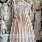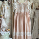 霞がかったローズカラーのシルクコットンに繊細なコットンレースを重ね、静謐で詩的な雰囲気を纏う River Poetry ドレス。柔らかなプリーツとレースの装飾が、ヴィクトリア時代の上品さとロマンティックな表情を映し出します。