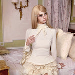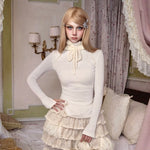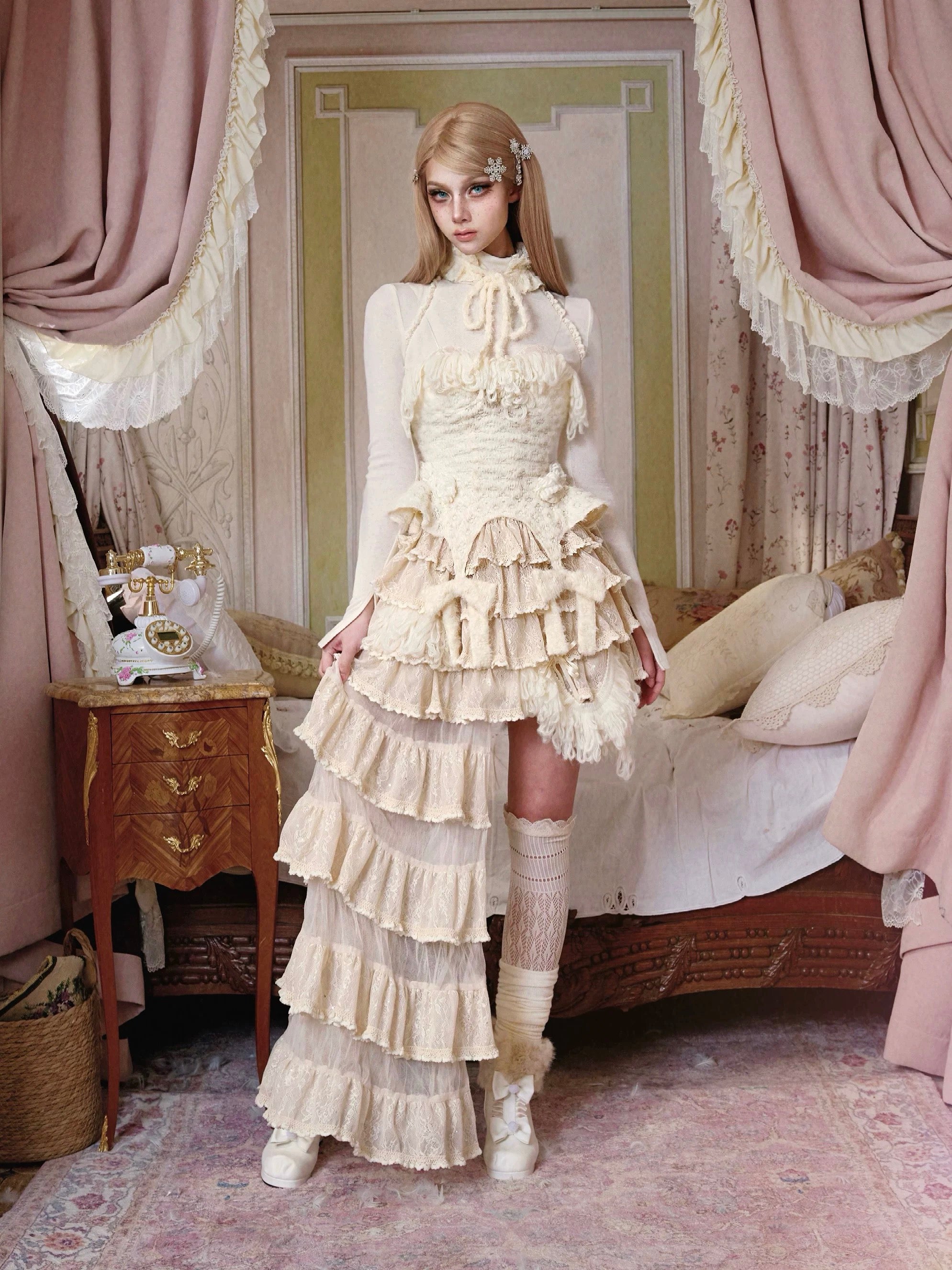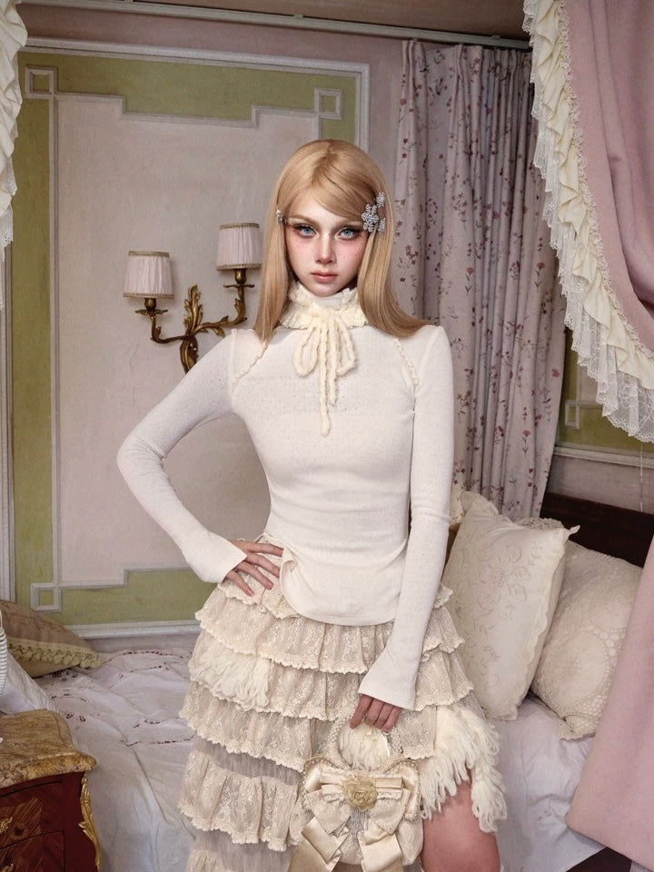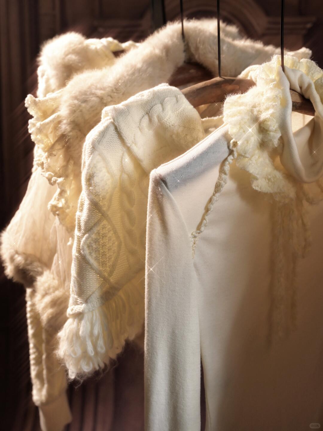 Inspired by classic winter heirloom fashion, blending soft milk-ivory tones with delicate knitted textures. The rib-knit fabric provides a light, breathable fit while maintaining warmth, and adds a romantic decorative element reminiscent of vintage aristocratic attire.