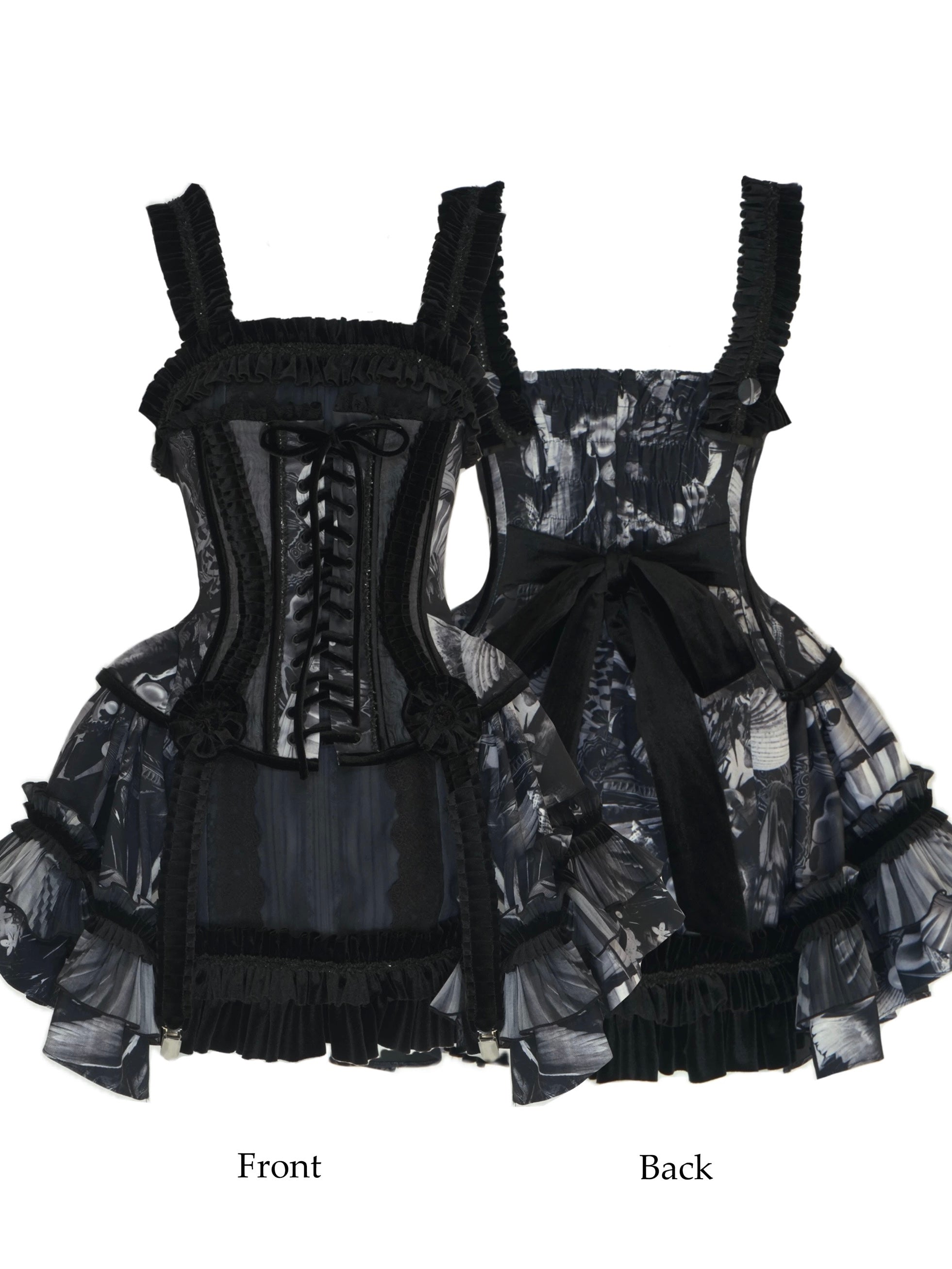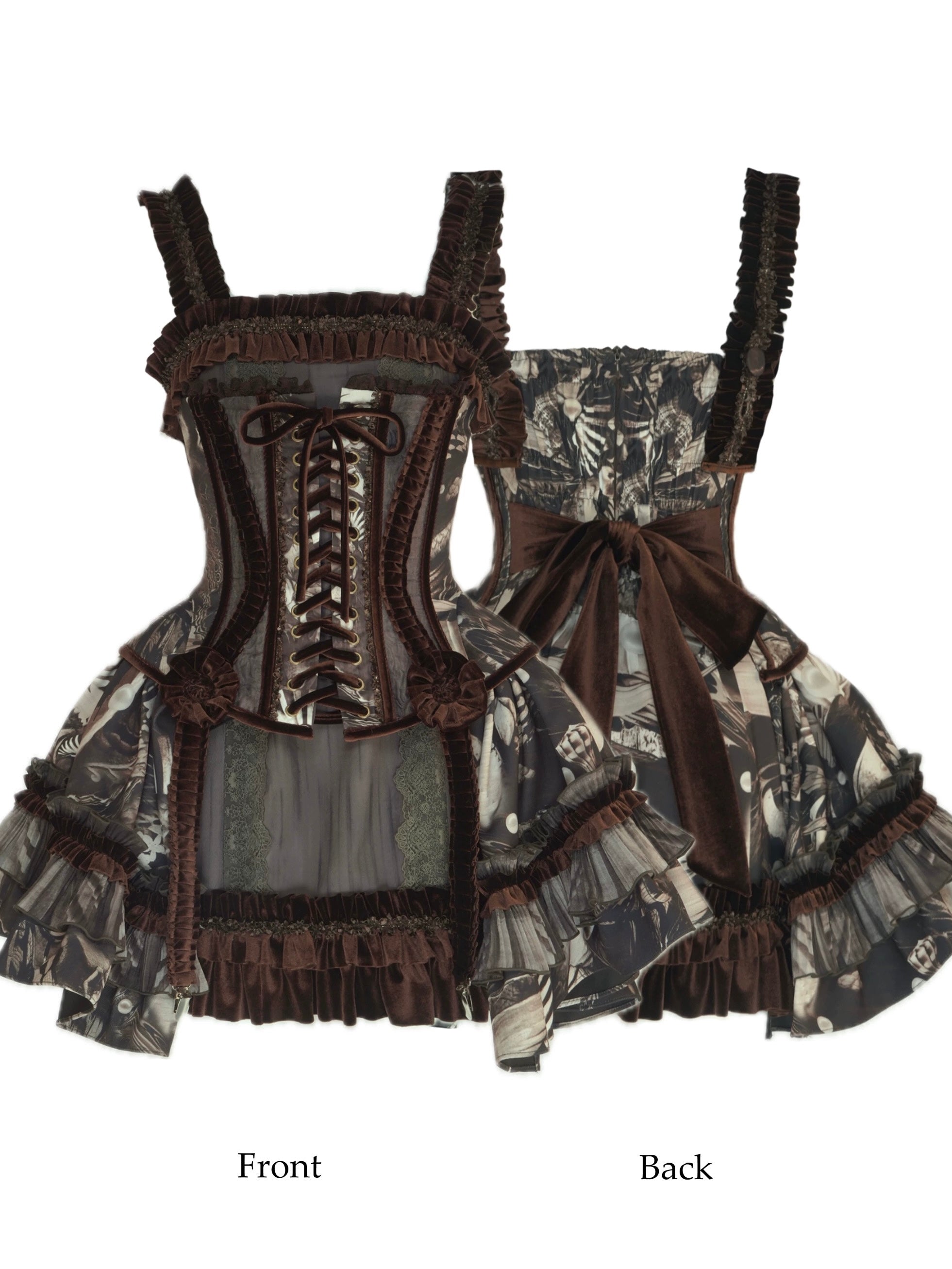 Designed with a faux two-piece structure, it combines structured Korean brocade with printed fabric for a voluminous silhouette. The bodice features waist boning for shaping, back corset lacing for adjustability, and delicate hand-pleated trims for a luxurious touch. The side waist decorations are handcrafted European-style rosettes, enhancing the cinched waist effect.