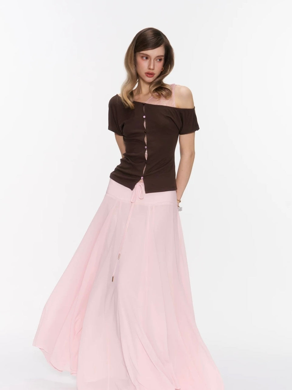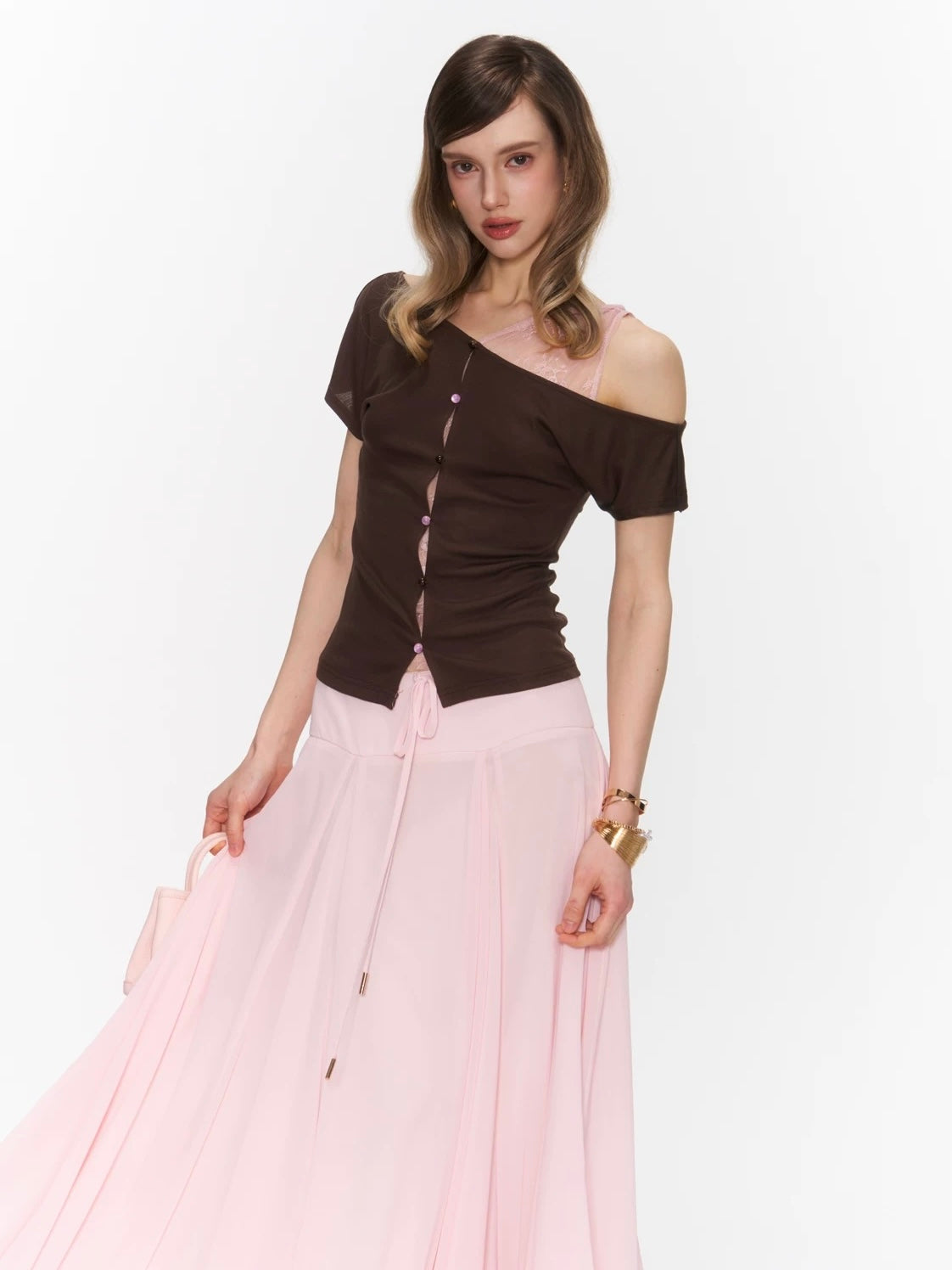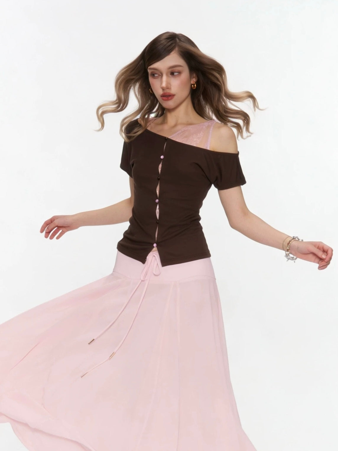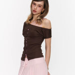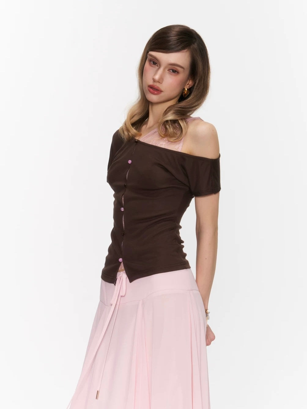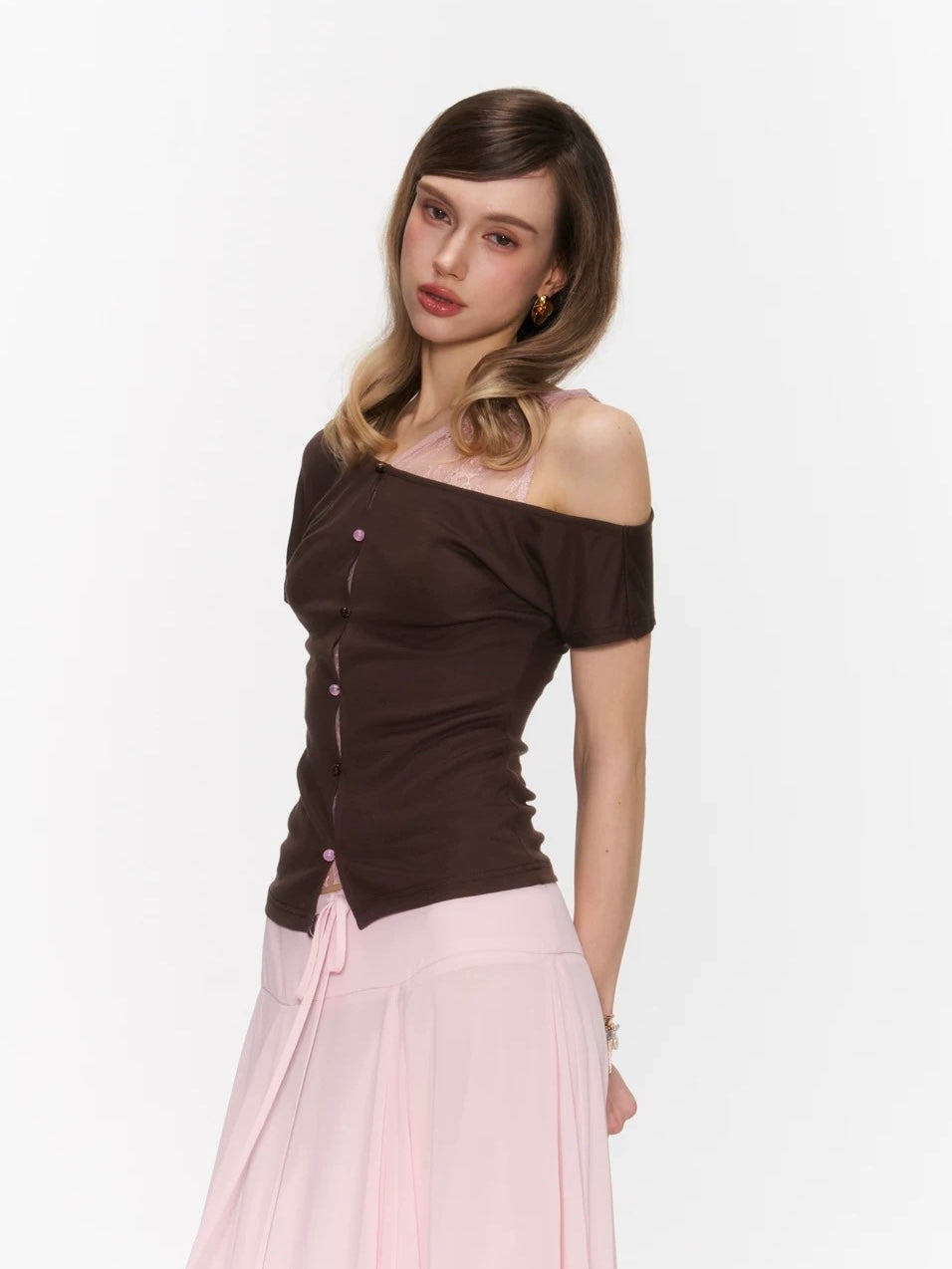 The Rosy Whisper Top features an asymmetric off-shoulder cut layered with delicate lace, creating a gentle contrast between structure and softness.
