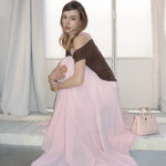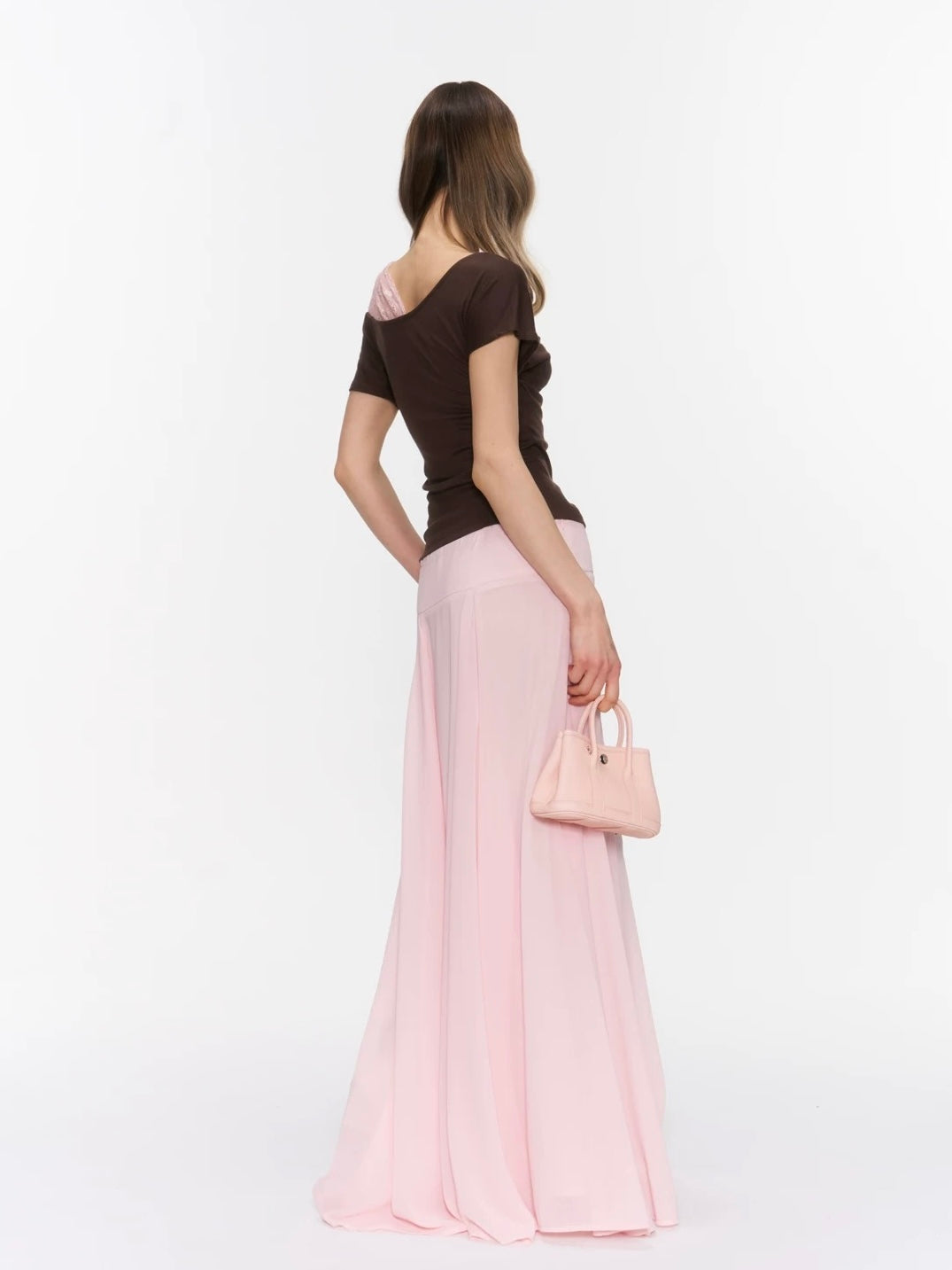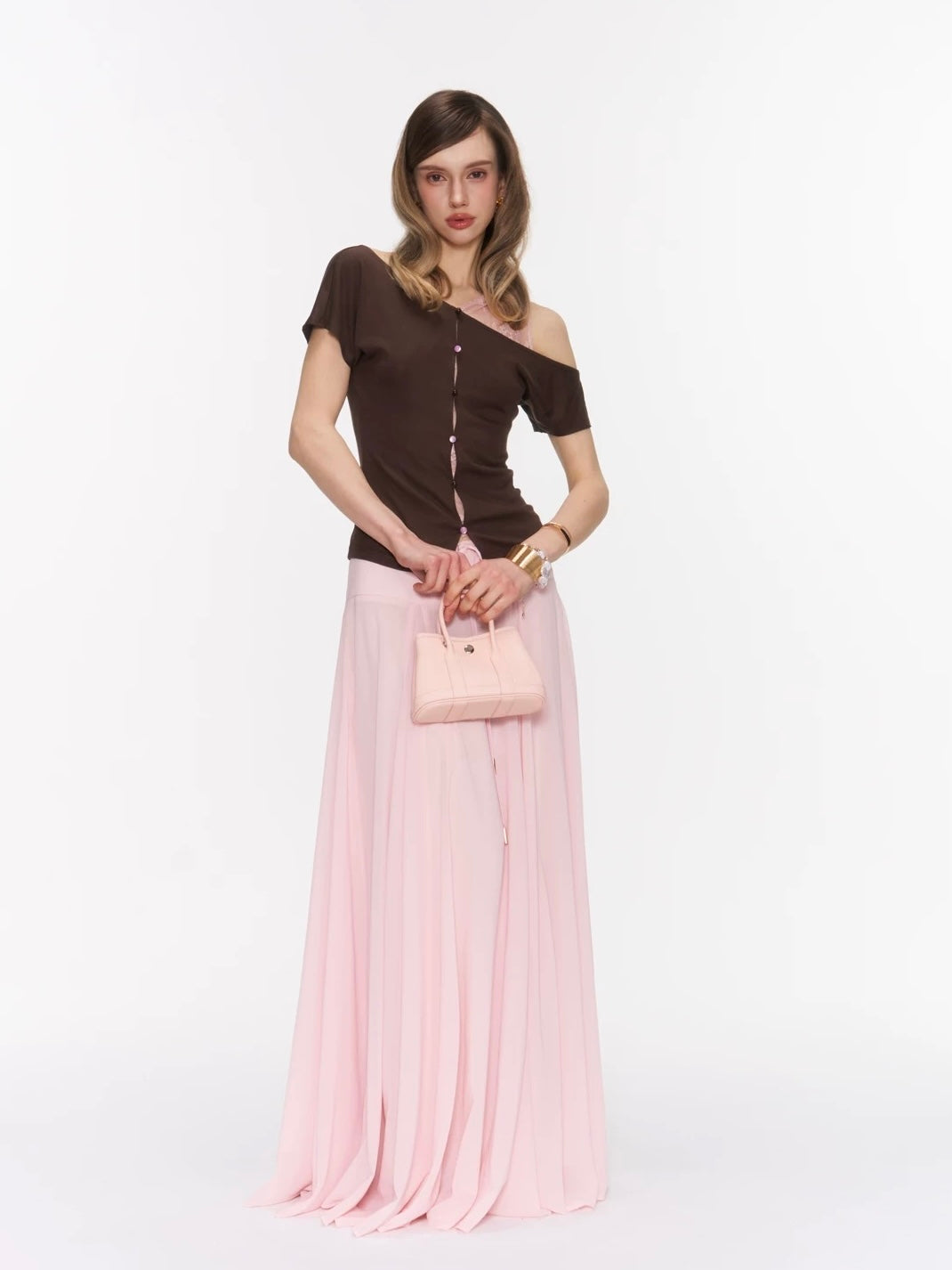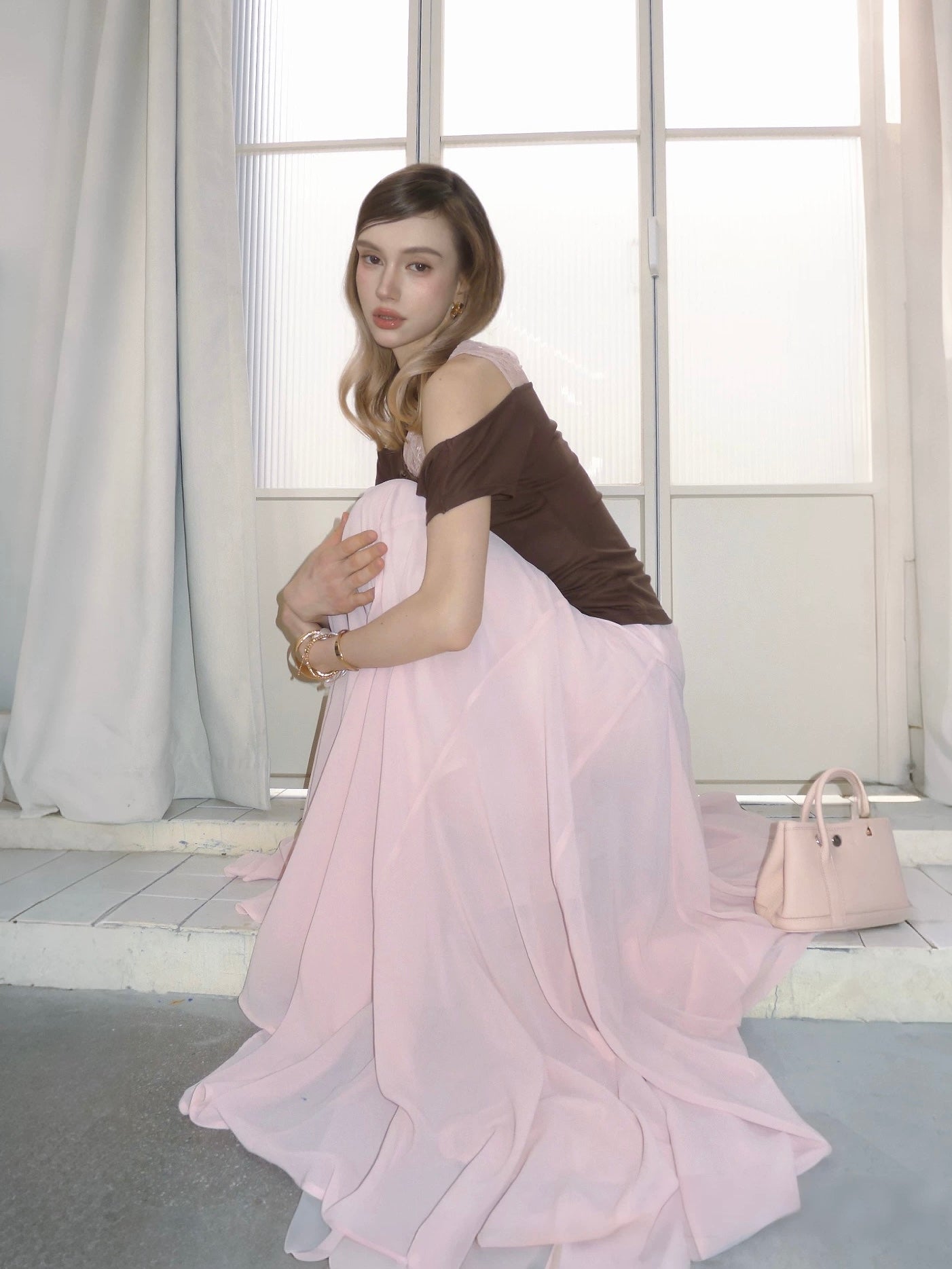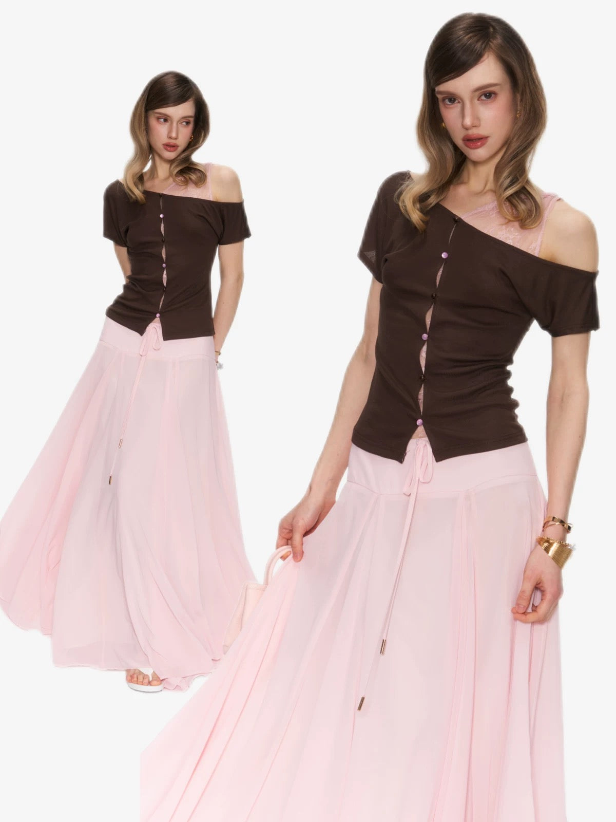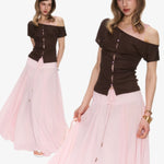 The Rosy Whisper Top features an asymmetric off-shoulder cut layered with delicate lace, creating a gentle contrast between structure and softness.