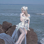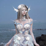 At the bust, pleated pearl lace connects to the sheer cutout like soft waves at the water’s edge. The abdomen is layered with shimmer organza and chiffon, flowing like scattered mermaid scales with every step. On the sides, iridescent pleats spiral like fins, decorated with tiny shell details—like treasures from under the sea.