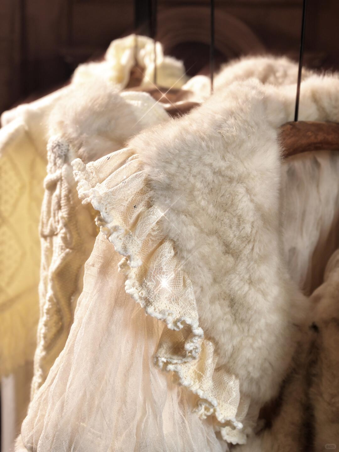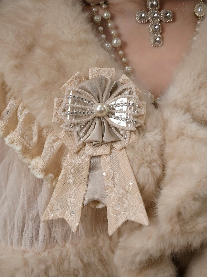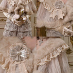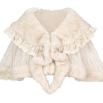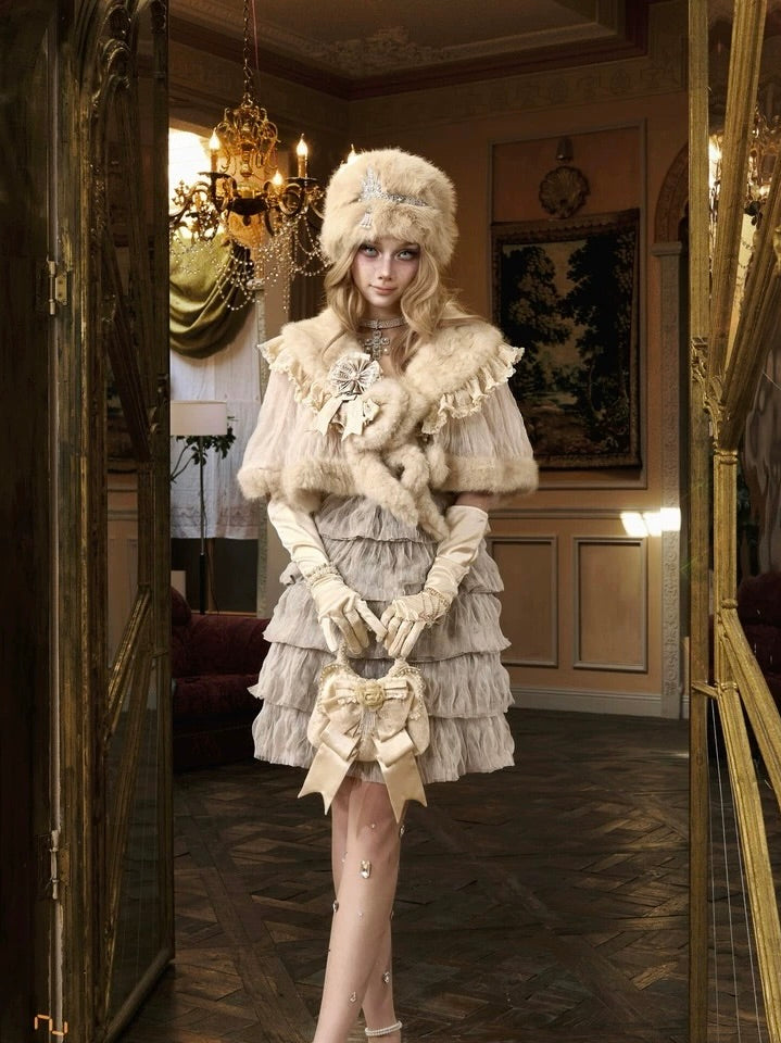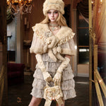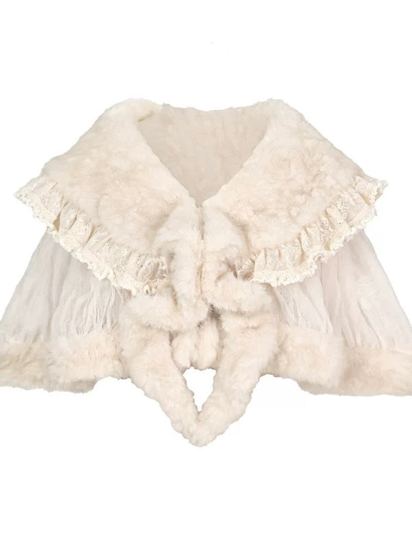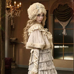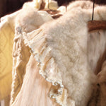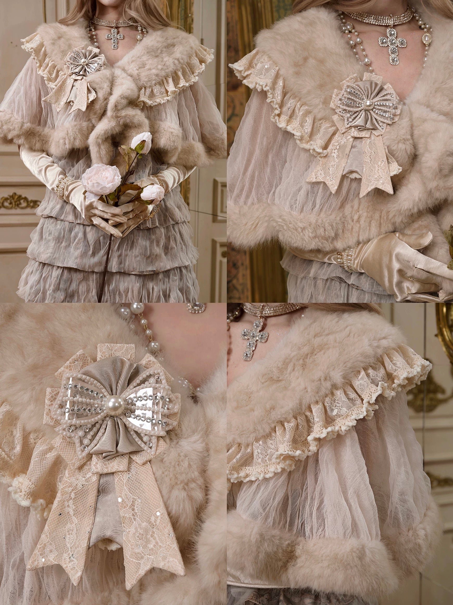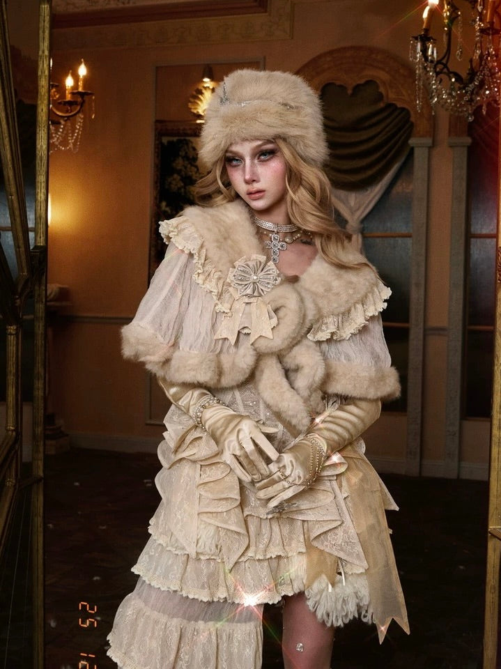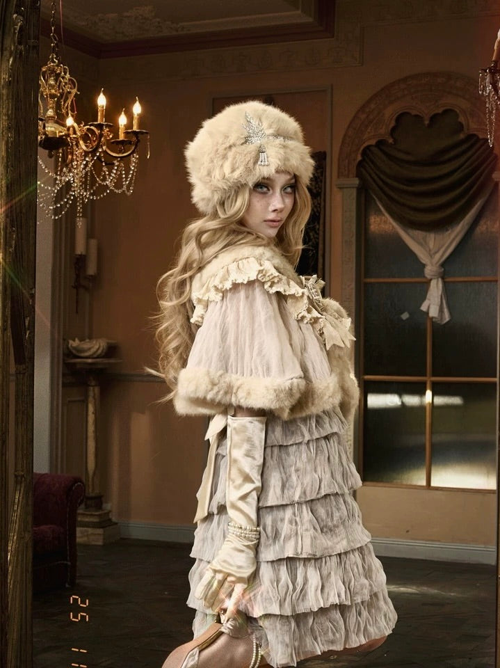 A Winter Gala faux-fur cape crafted in a warm apricot-ivory tone, blending aristocratic elegance with soft winter fantasy. The cape features faux fur paired with lace, forming a gentle, glowing silhouette that feels both vintage and ethereal for winter wear.