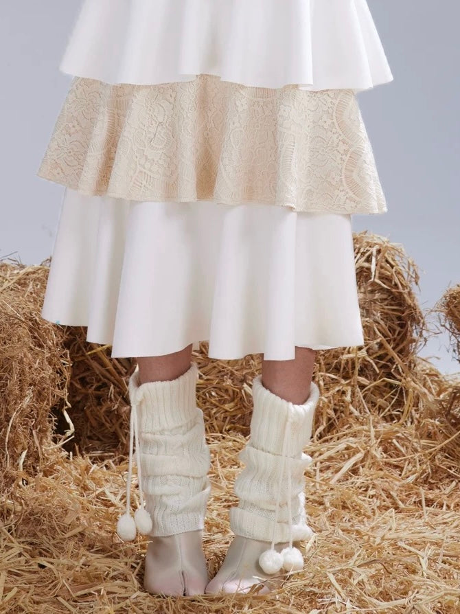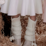 Wrap your autumn days in soft, coquette-core charm. These ivory-white knit leg warmers are made from 100% polyester, designed with a cozy ribbed texture and finished with delicate ribbon ties and fluffy pom-poms. Perfect for layering over your favorite Mary Janes, ballet flats, or sneakers, they bring a sweet vanilla girl vibe to every outfit.