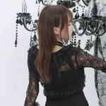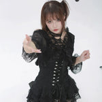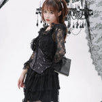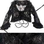 Crafted from intricate spiderweb-pattern lace, this sheer black cardigan features ruffled trims, flared sleeves, and a tie-front closure that frames the silhouette with graceful detail. Perfect for layering over corset dresses, camisoles, or gothic streetwear, it adds instant Harajuku sweet-goth charm to any outfit. Perfect add on for any Halloween costumes.