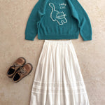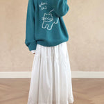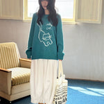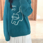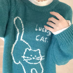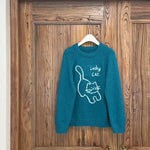 A cozy knit with a playful charm — this teal sweater features a cheerful “Lucky Cat” motif, blending comfort with a lighthearted touch of whimsy. Perfect for layering over dresses, shirts, or simply wearing on its own for a relaxed, casual look.