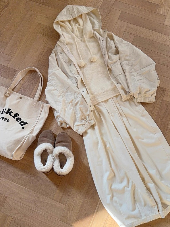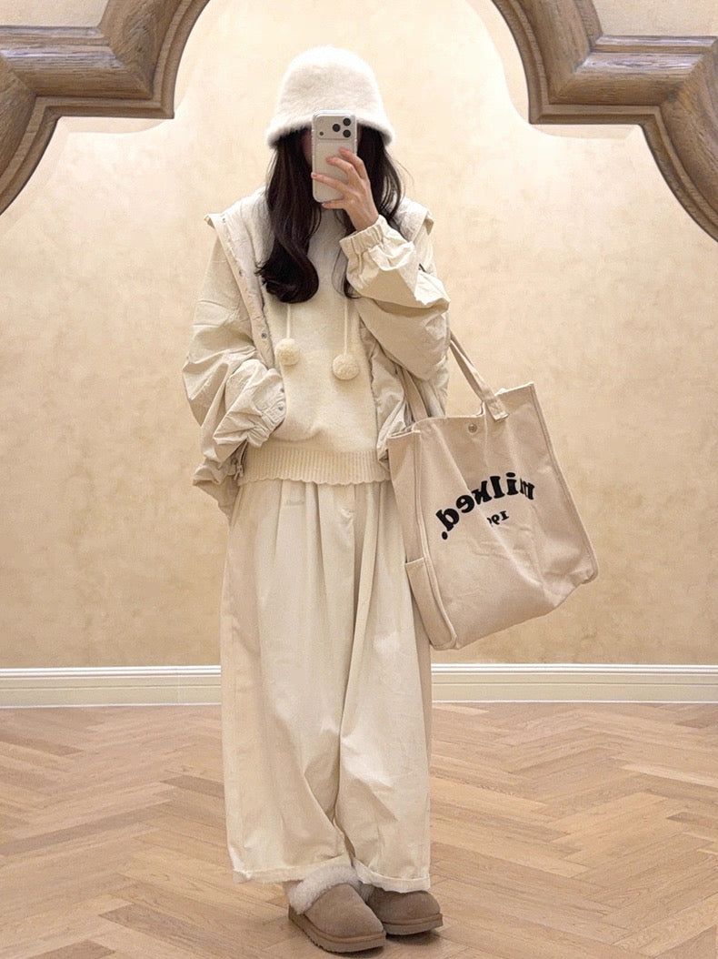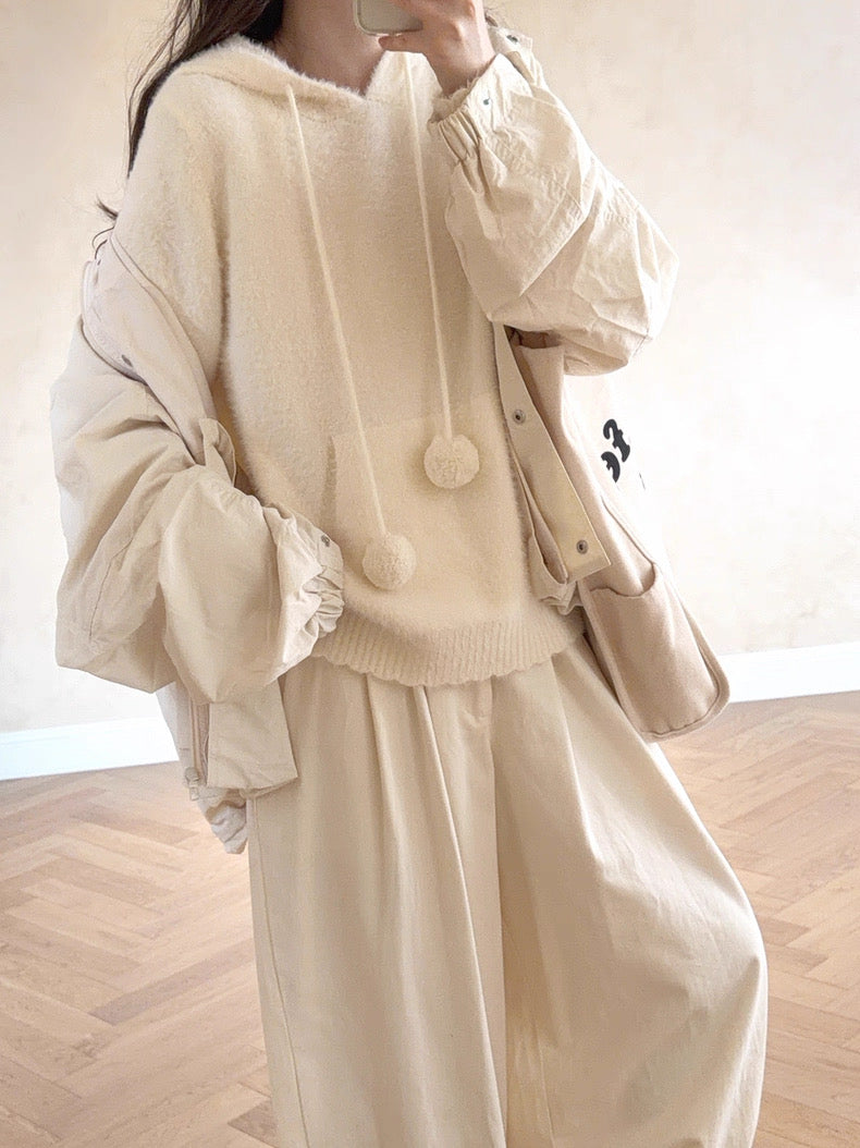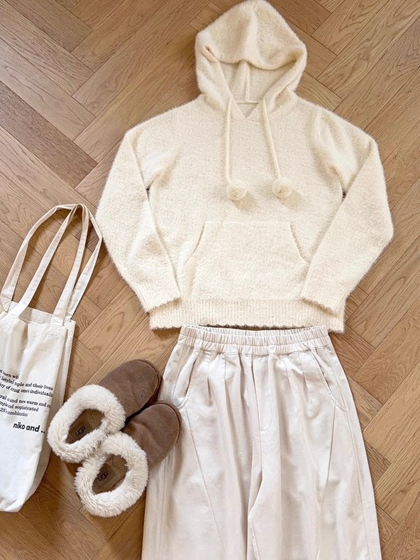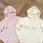 • Soft, fluffy knit with pom-pom drawstrings