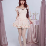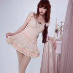 model wearing pastel pink coquette-style mini dress outdoors