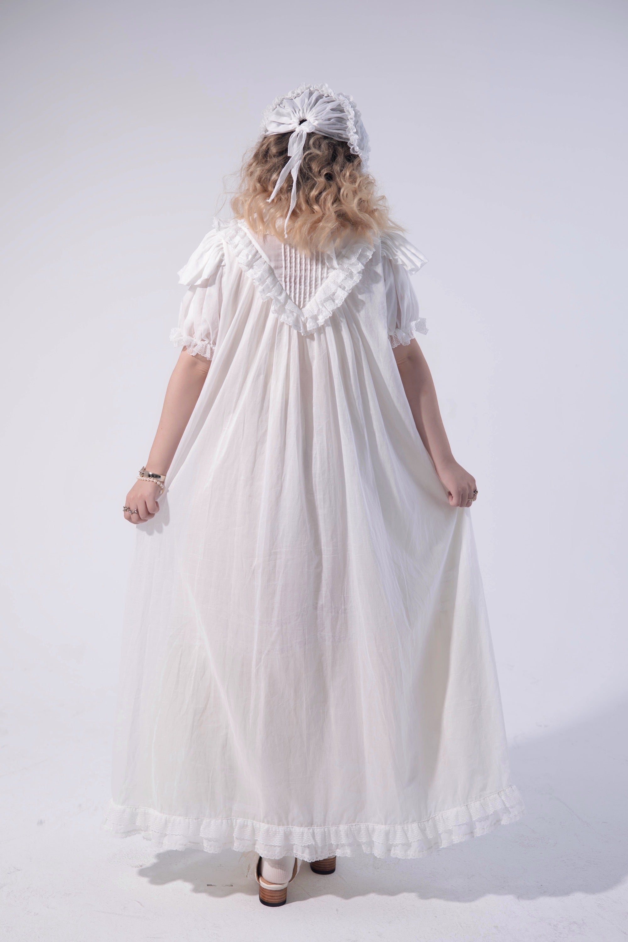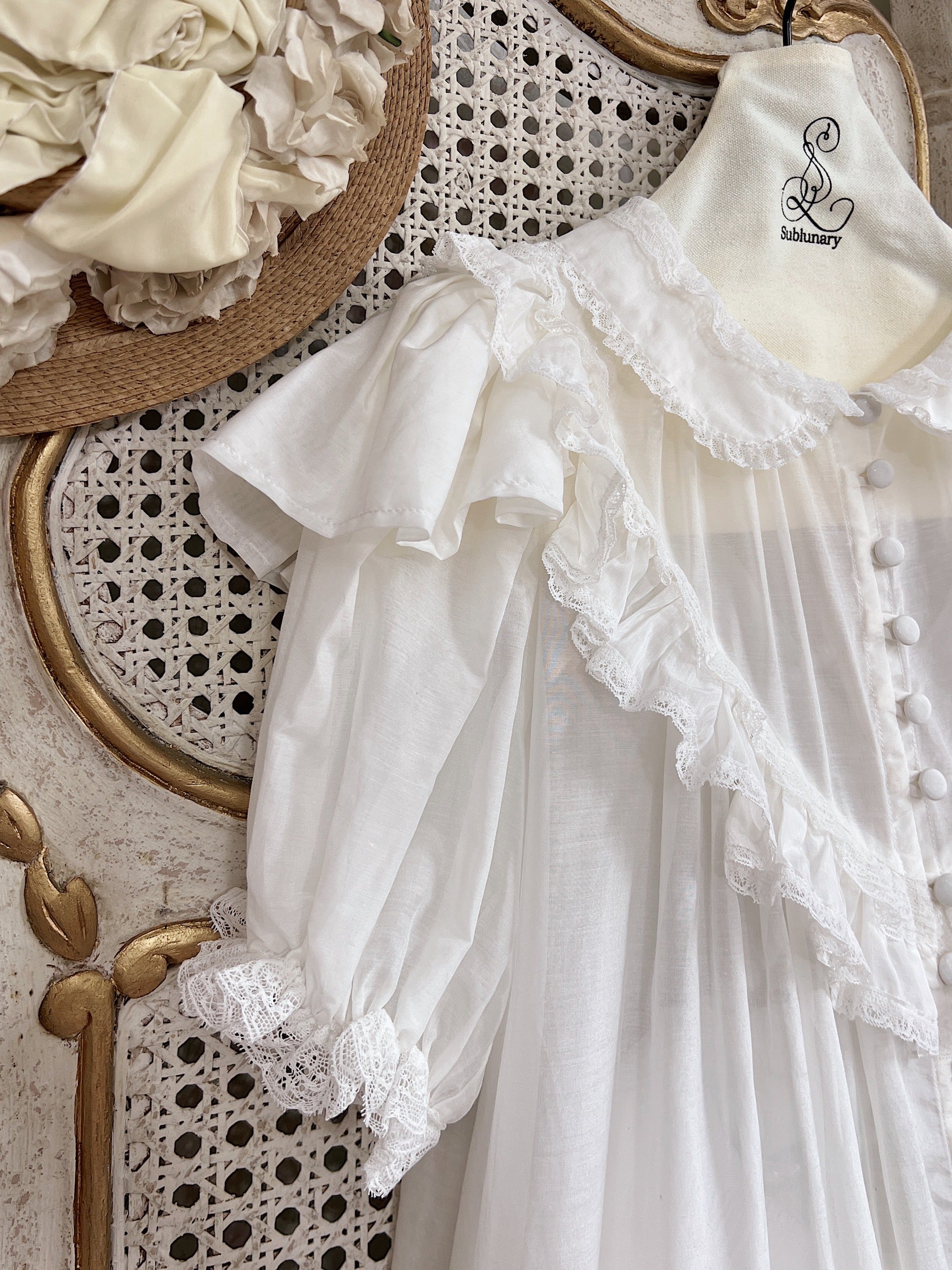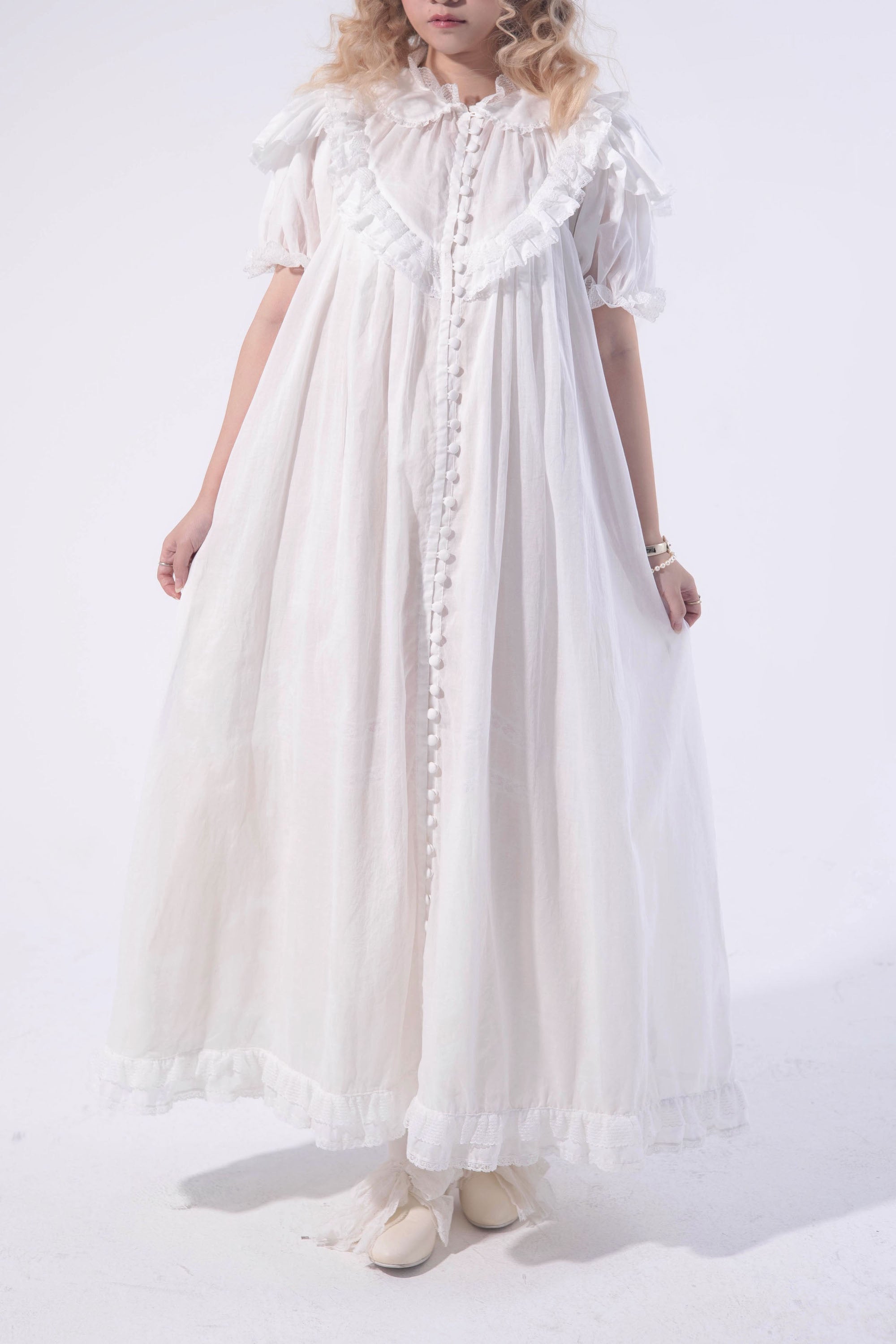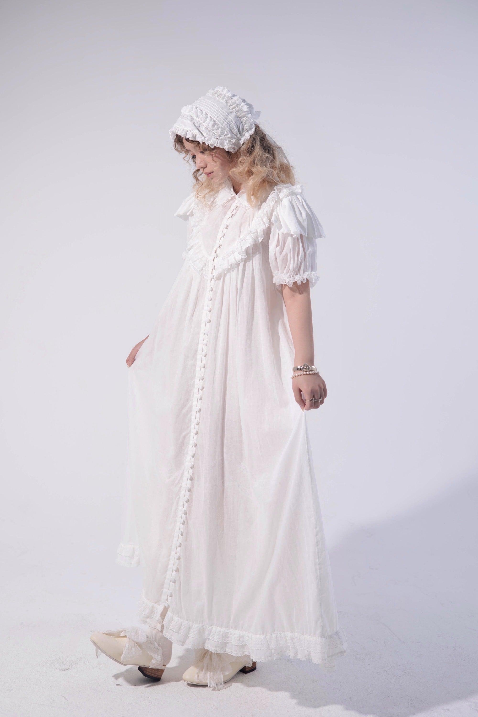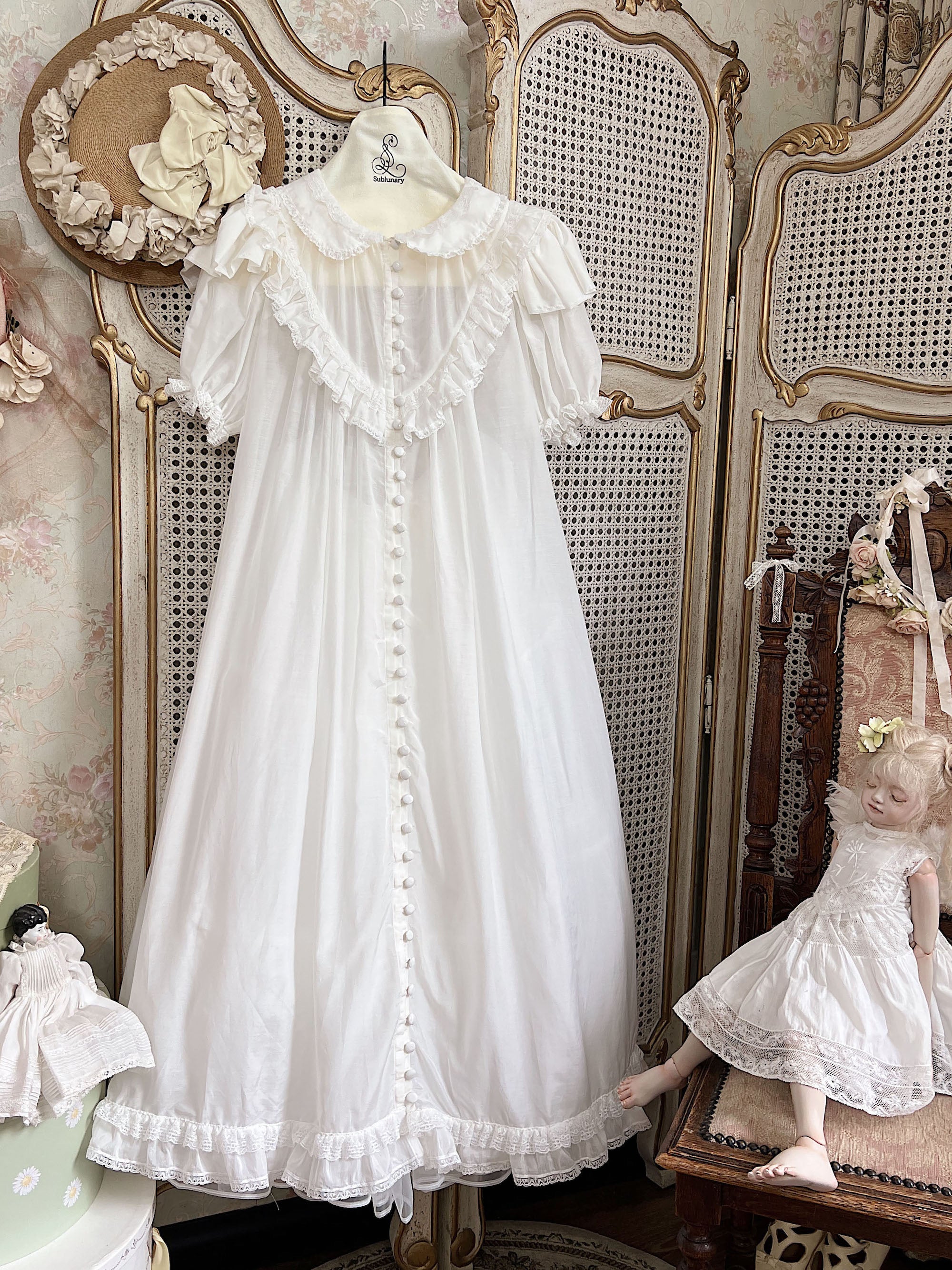 Like a faint morning mist with birds gliding across the water — solitude and serenity linger within a peaceful dream. Inspired by antique Victorian nightdresses, Brumaire preserves the era’s signature button design, intricate and beautiful. Though detailed in appearance, only 3–4 buttons need to be undone when worn, making it both graceful and convenient.