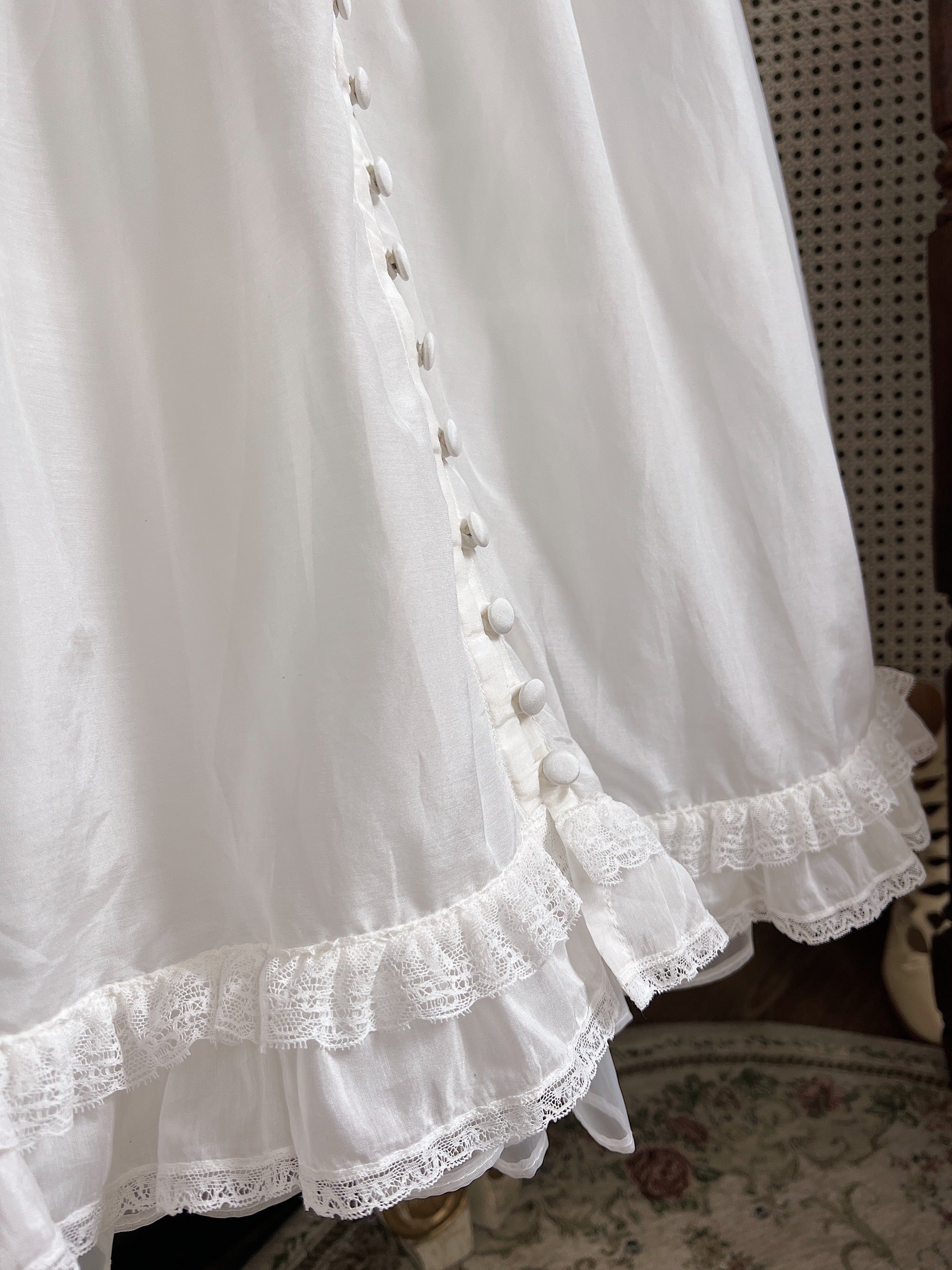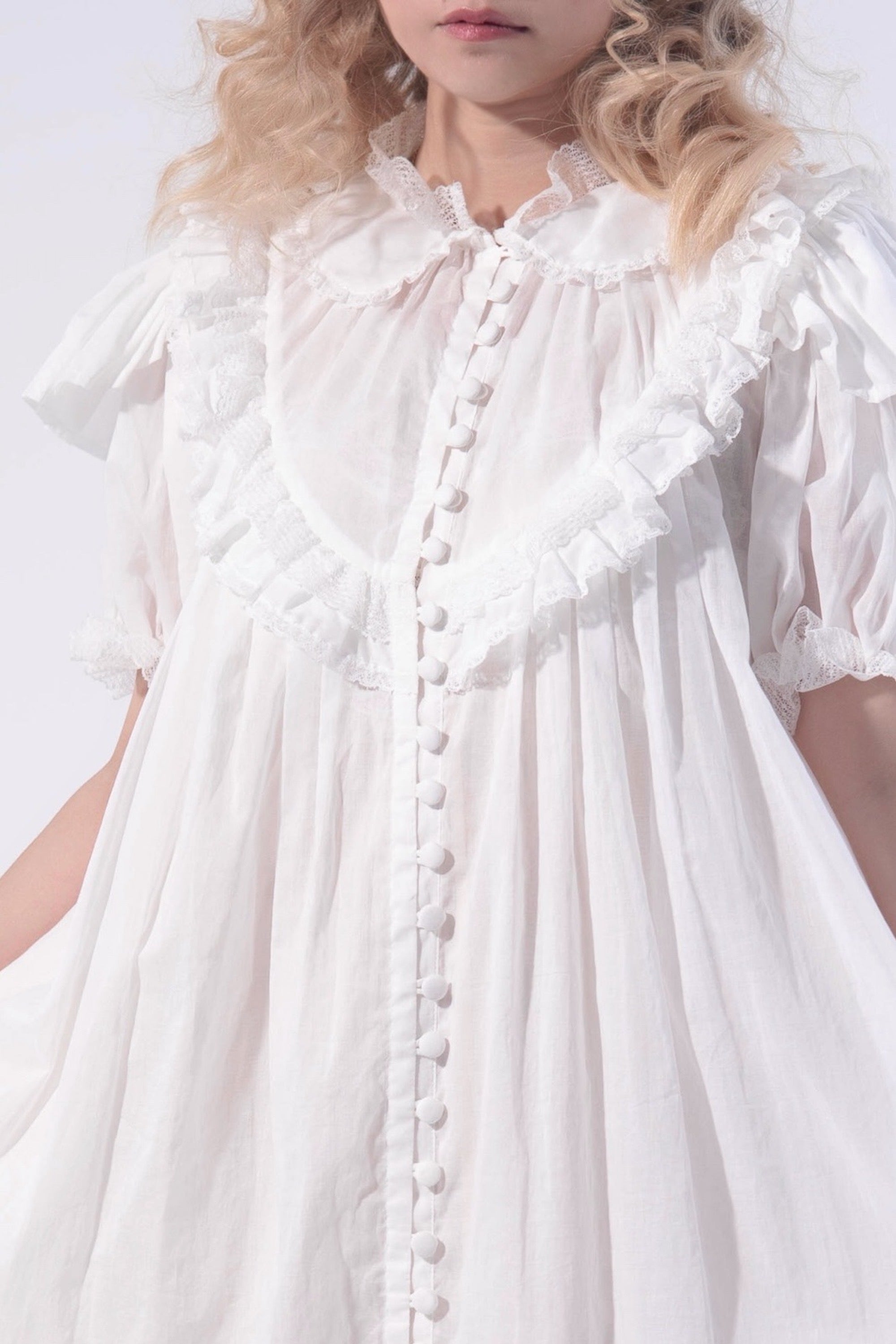 アンティークのヴィクトリア時代の少女用モーニングドレスに着想を得たデザインで、当時特有の美しいボタン仕様をそのまま残しています。複雑に見えますが、実際の着用では3~4個のボタンを外すだけで十分。優美さと便利さを兼ね備えています。