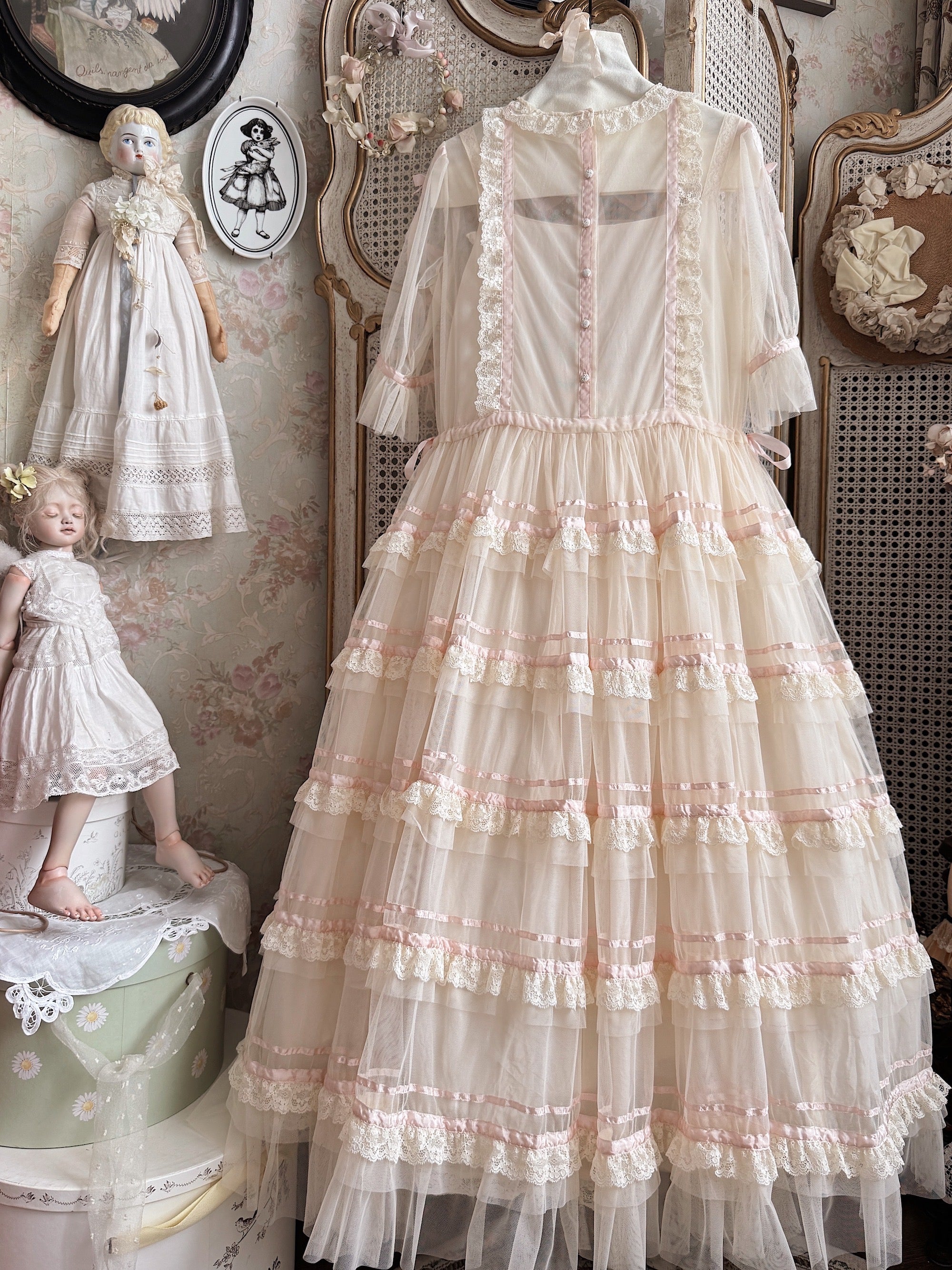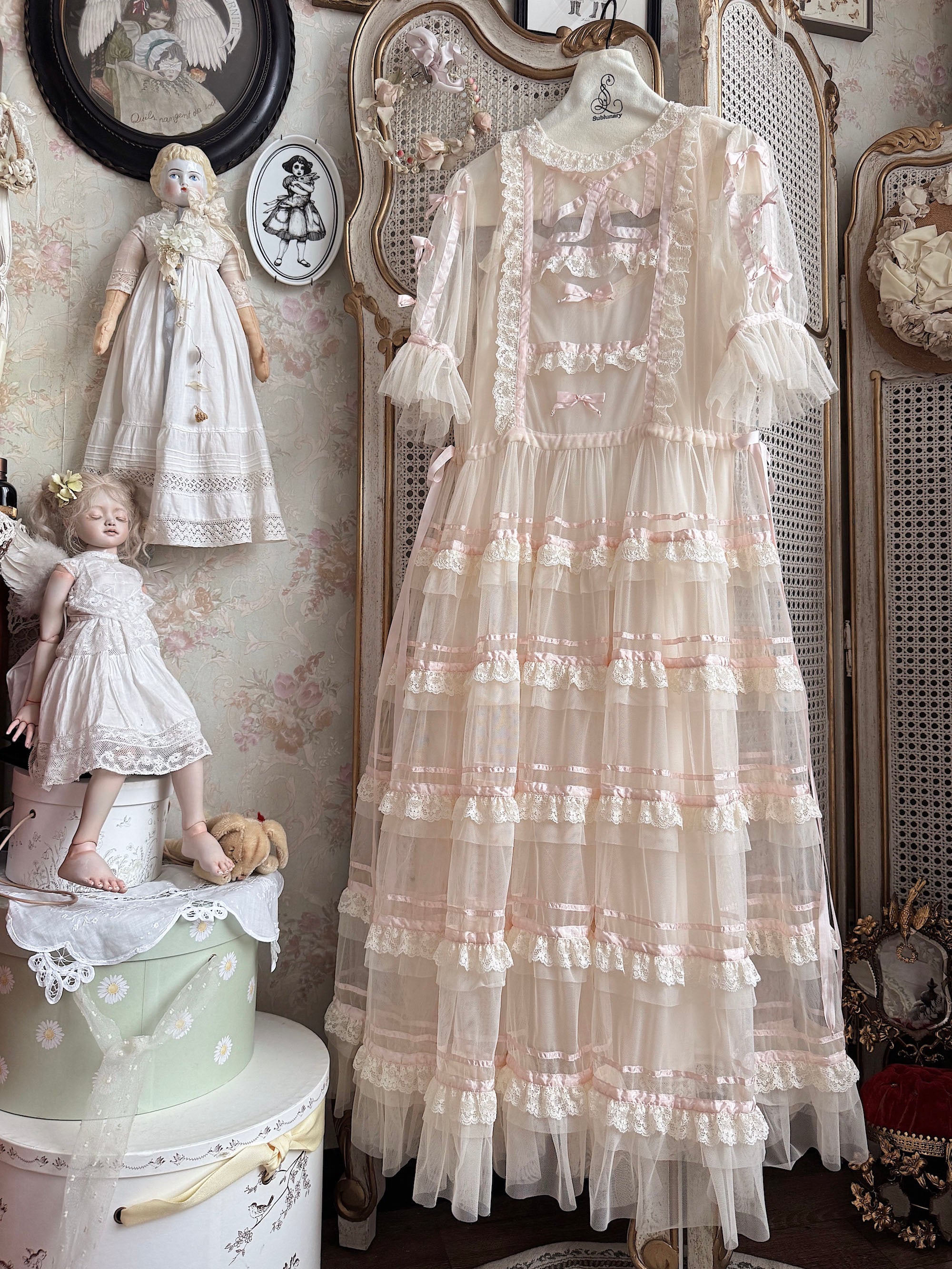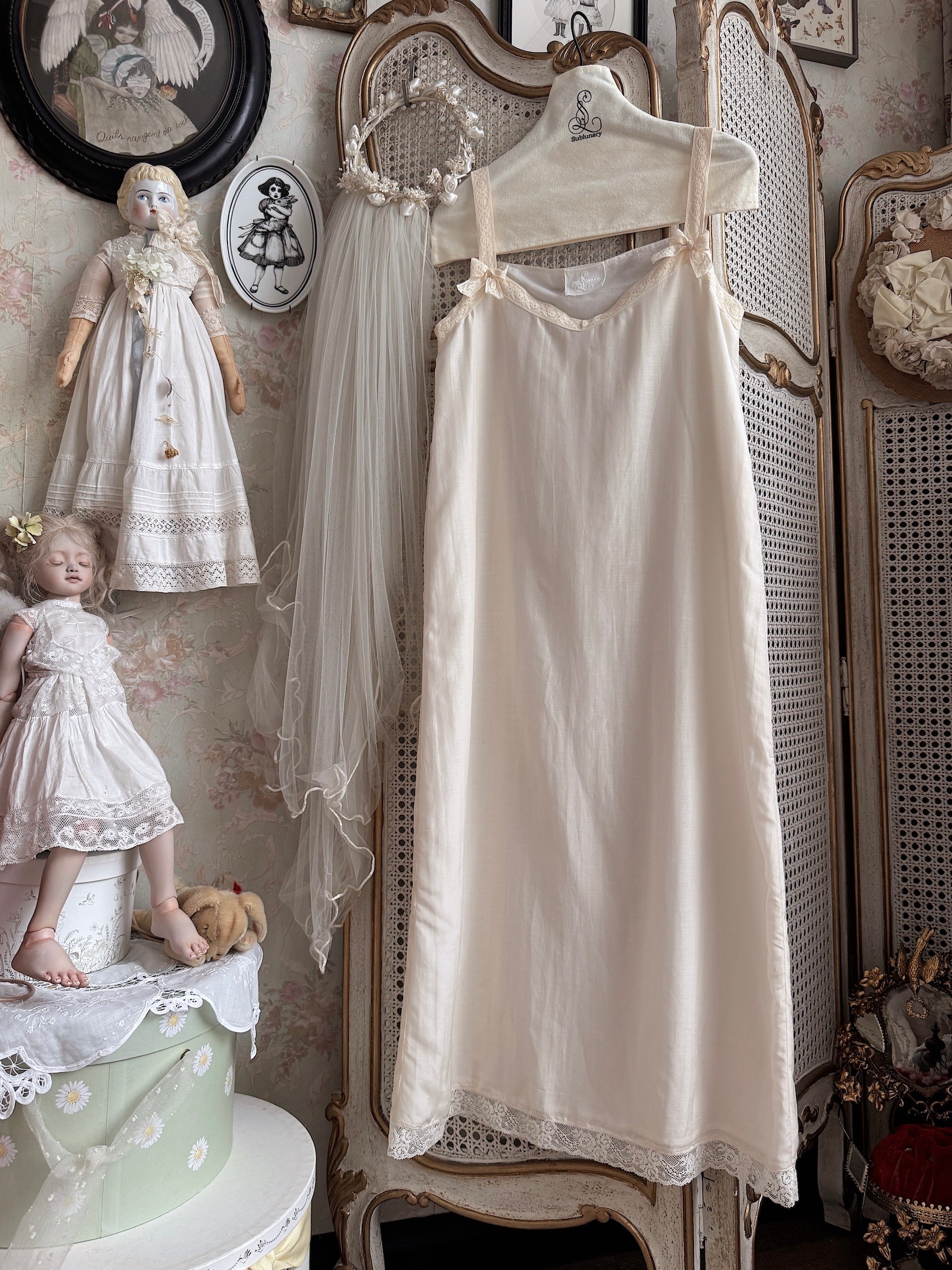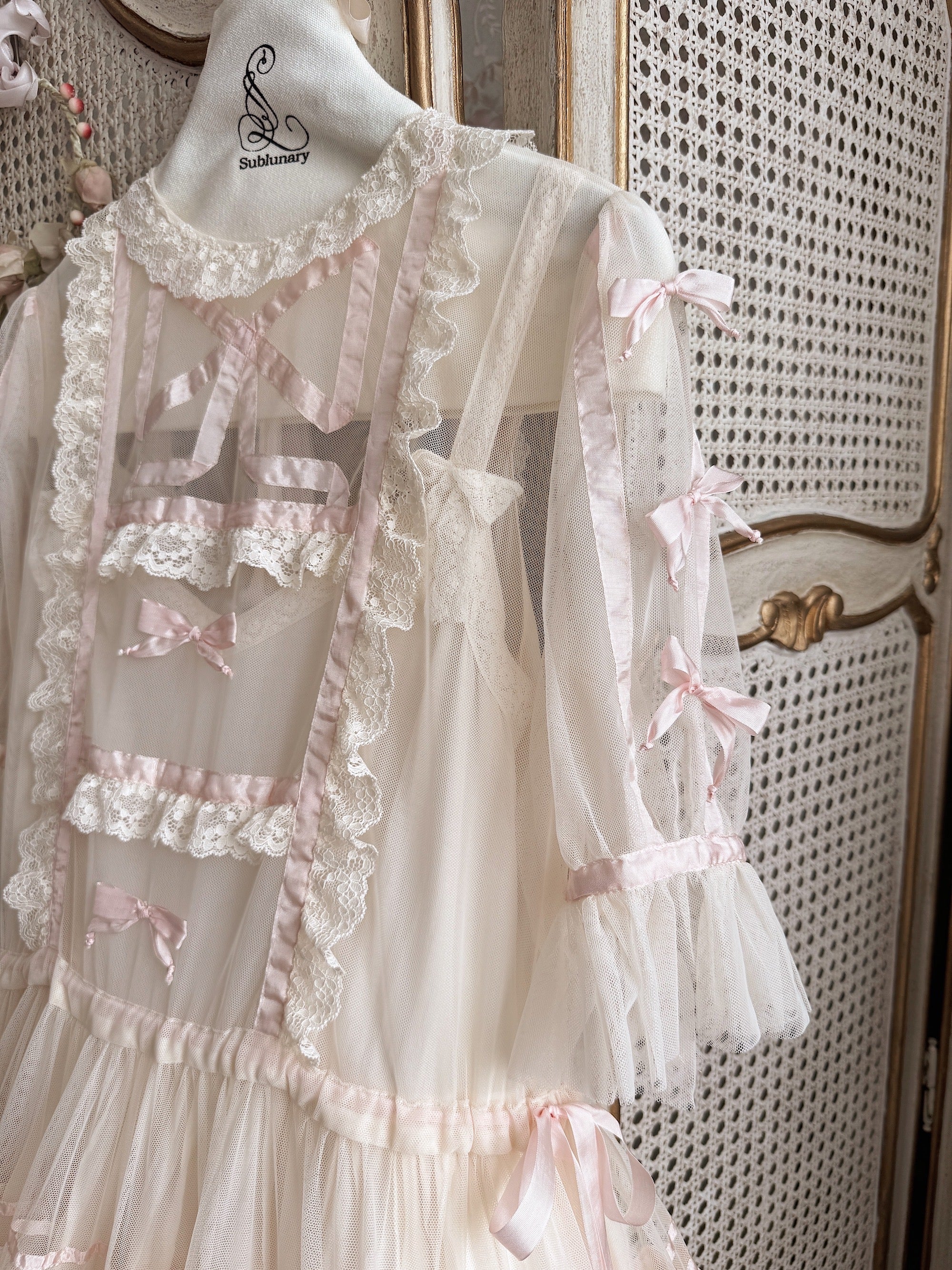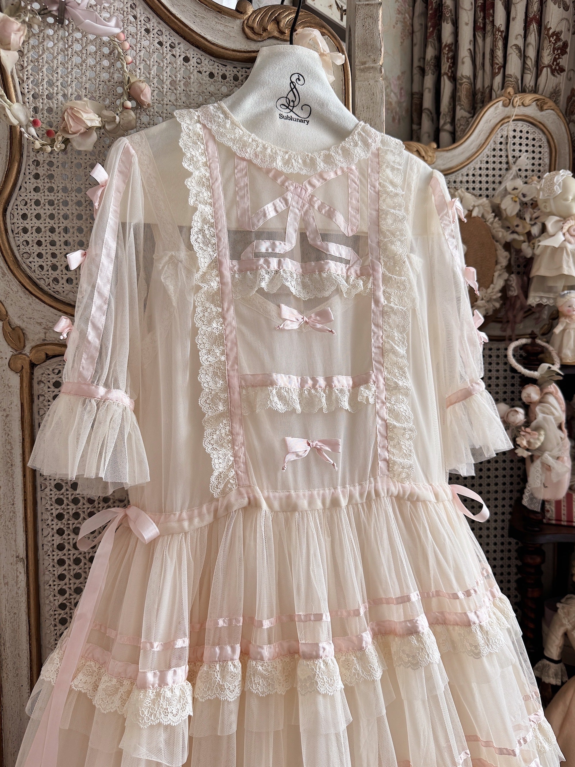 アイボリースリップドレスの上に、リボンとレースで飾られた繊細なチュールガウンを重ねた二点セット。日本製チュール、シルクリボン、レースで仕立てられ、アンティークドレスの無垢な雰囲気を纏いながら、現代的な着やすさも兼ね備えています。幾重にも重なるフリルとリボン装飾が、夢のようにノスタルジックなシルエットを生み出します。
