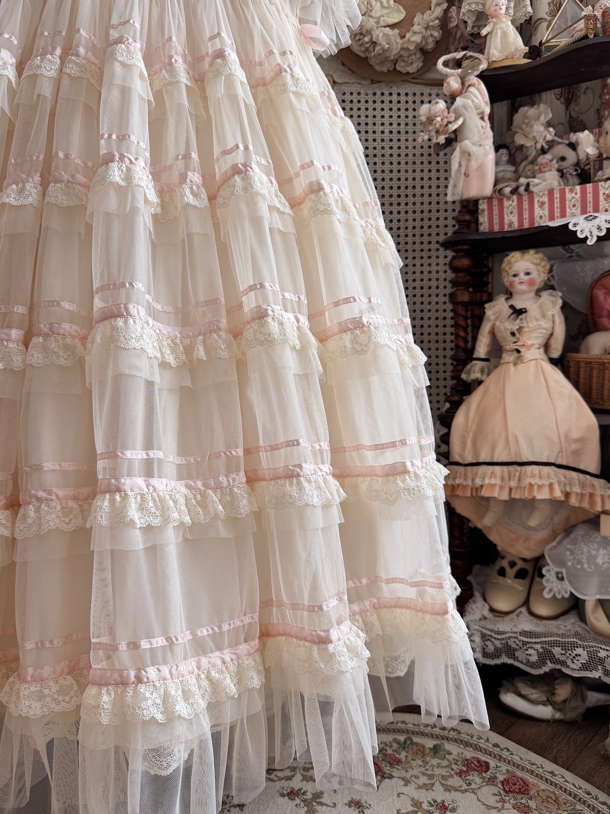 This gown set pairs a sheer tulle overlay adorned with pastel ribbons and lace, layered over an ivory slip dress. Crafted from Japanese tulle, silk ribbons, and delicate lace, it evokes the innocence of antique gowns while offering graceful modern wearability. The cascading ruffles and ribbon detailing create a silhouette that feels both ethereal and nostalgic.