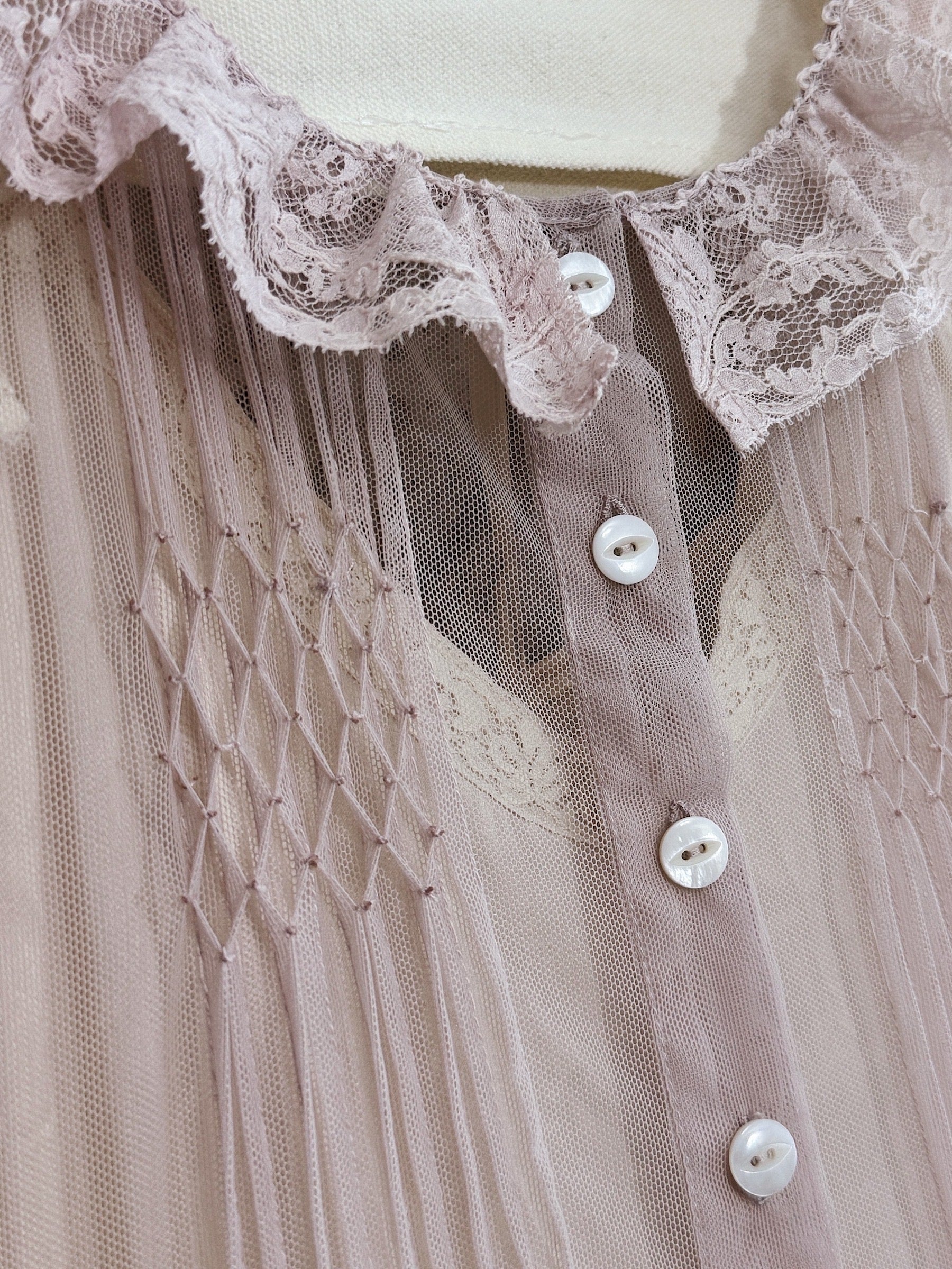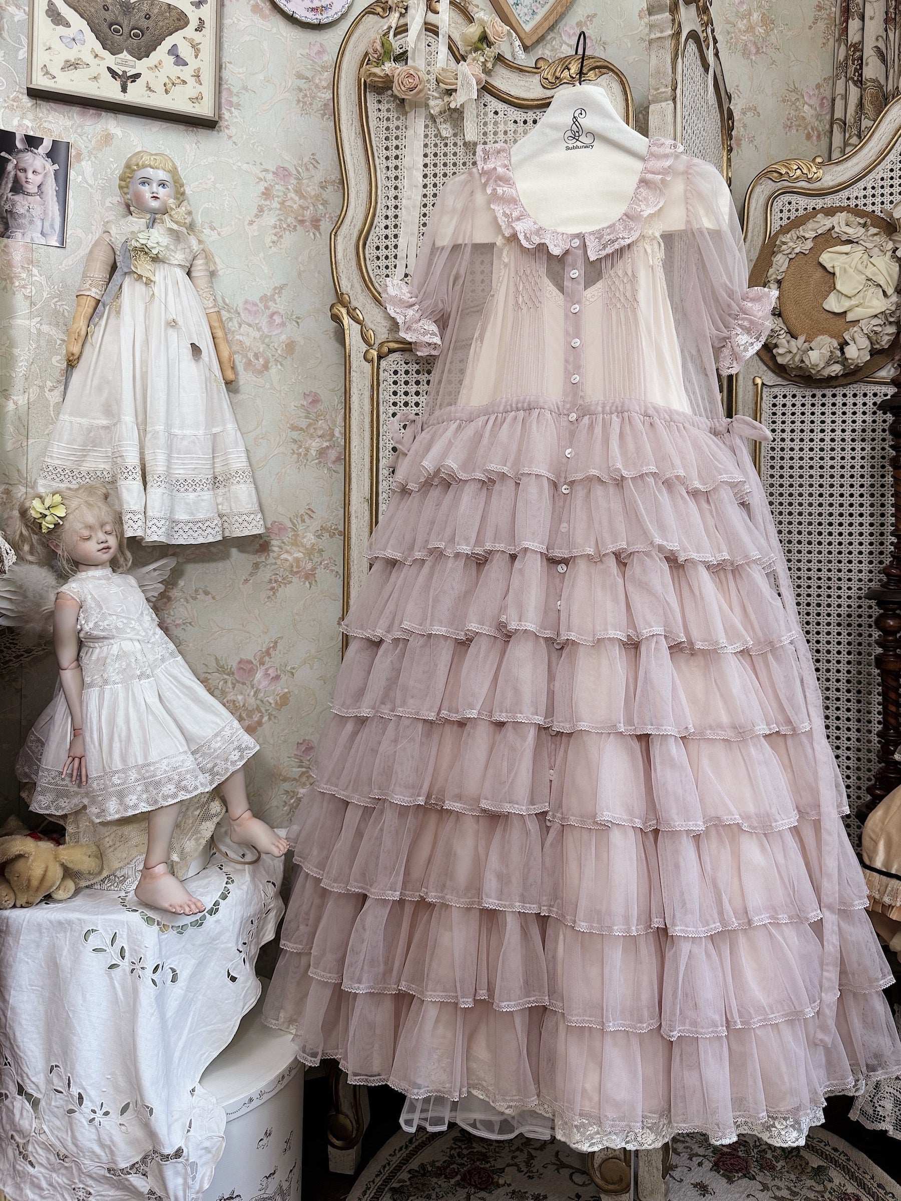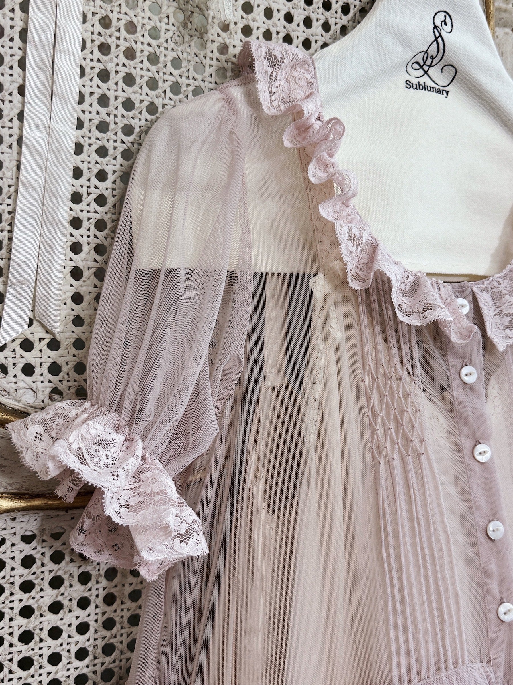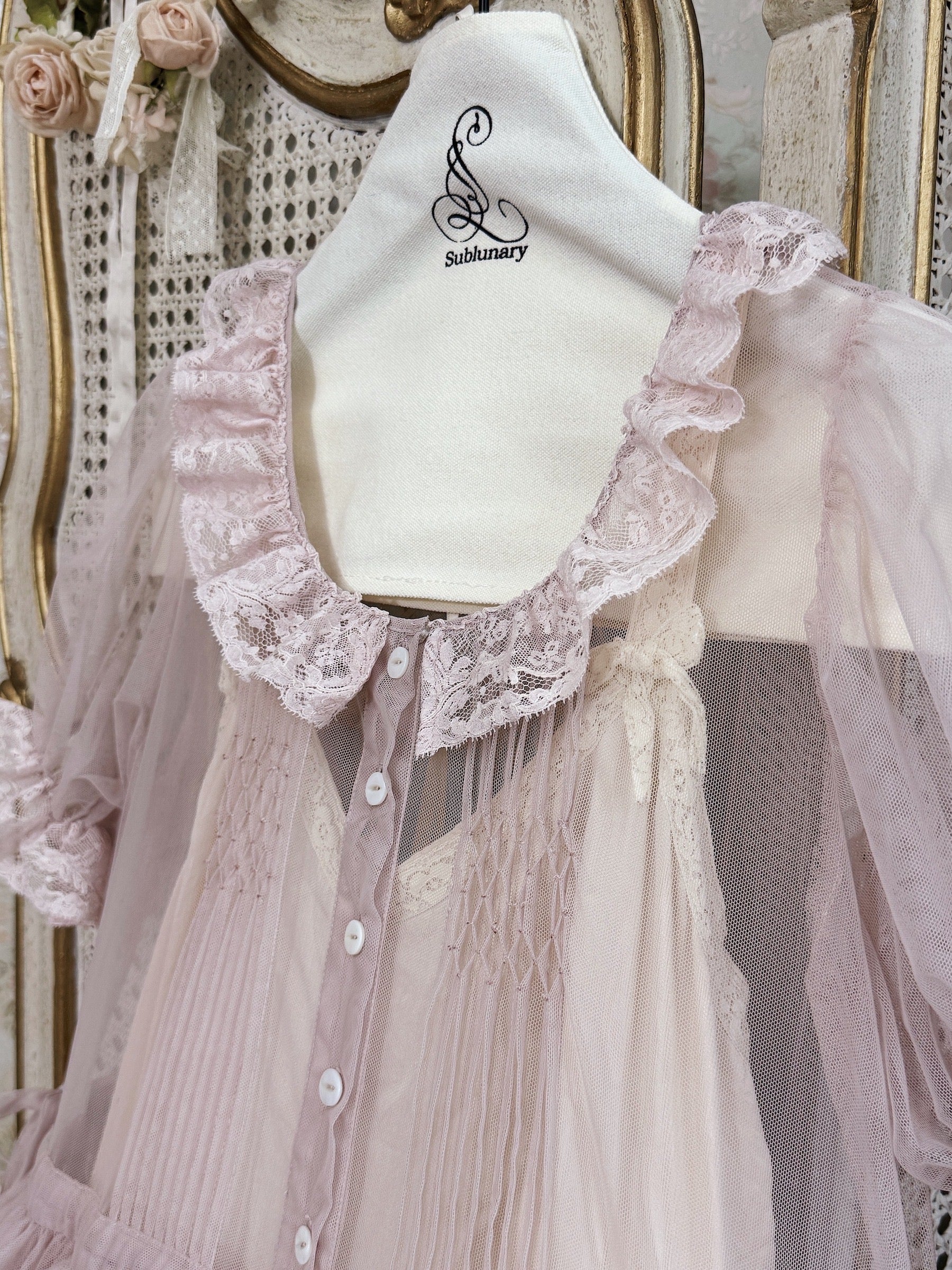 アンティークホワイトのスリップドレスに、淡いライラック色のシアーガウンを重ねた二点セット。シルクコットンとフランス製レース、天然シェルボタンで仕立てられ、ヴィクトリア時代のロマンティックな雰囲気を漂わせながら、軽やかな着心地を叶えています。幾重にも重なるフリルとスモッキングのディテールが、夢のように浮遊感のあるシルエットを生み出します。