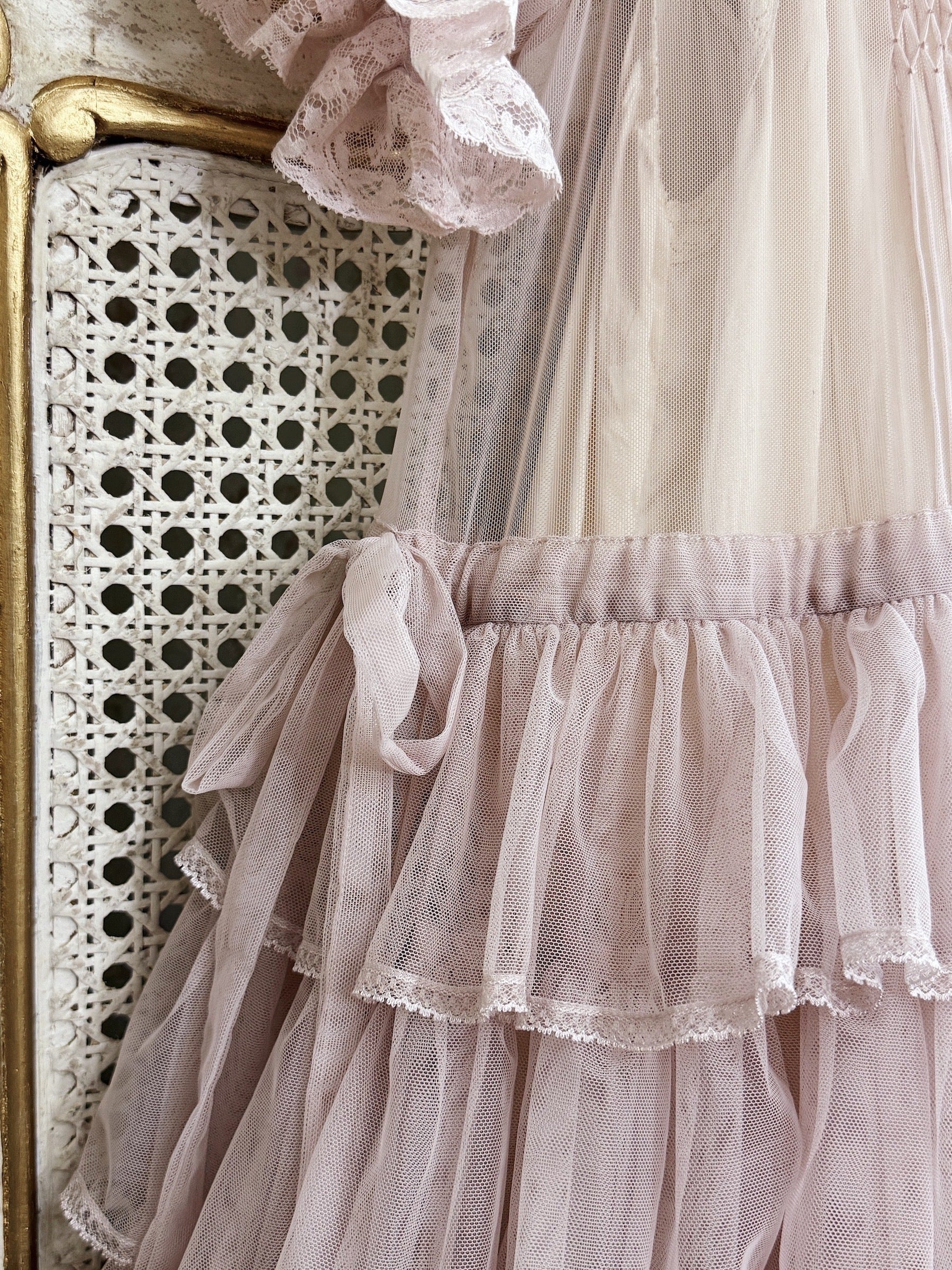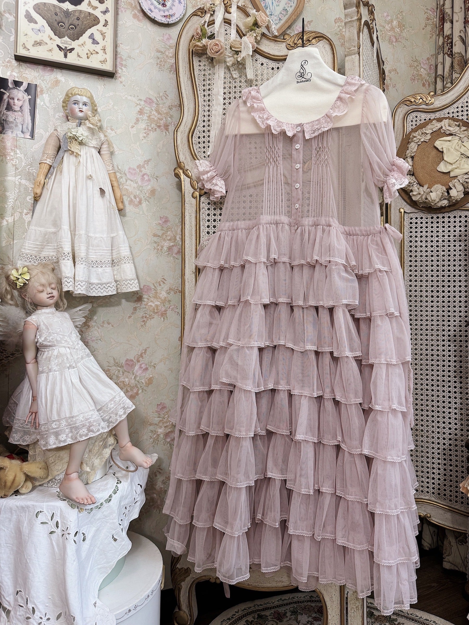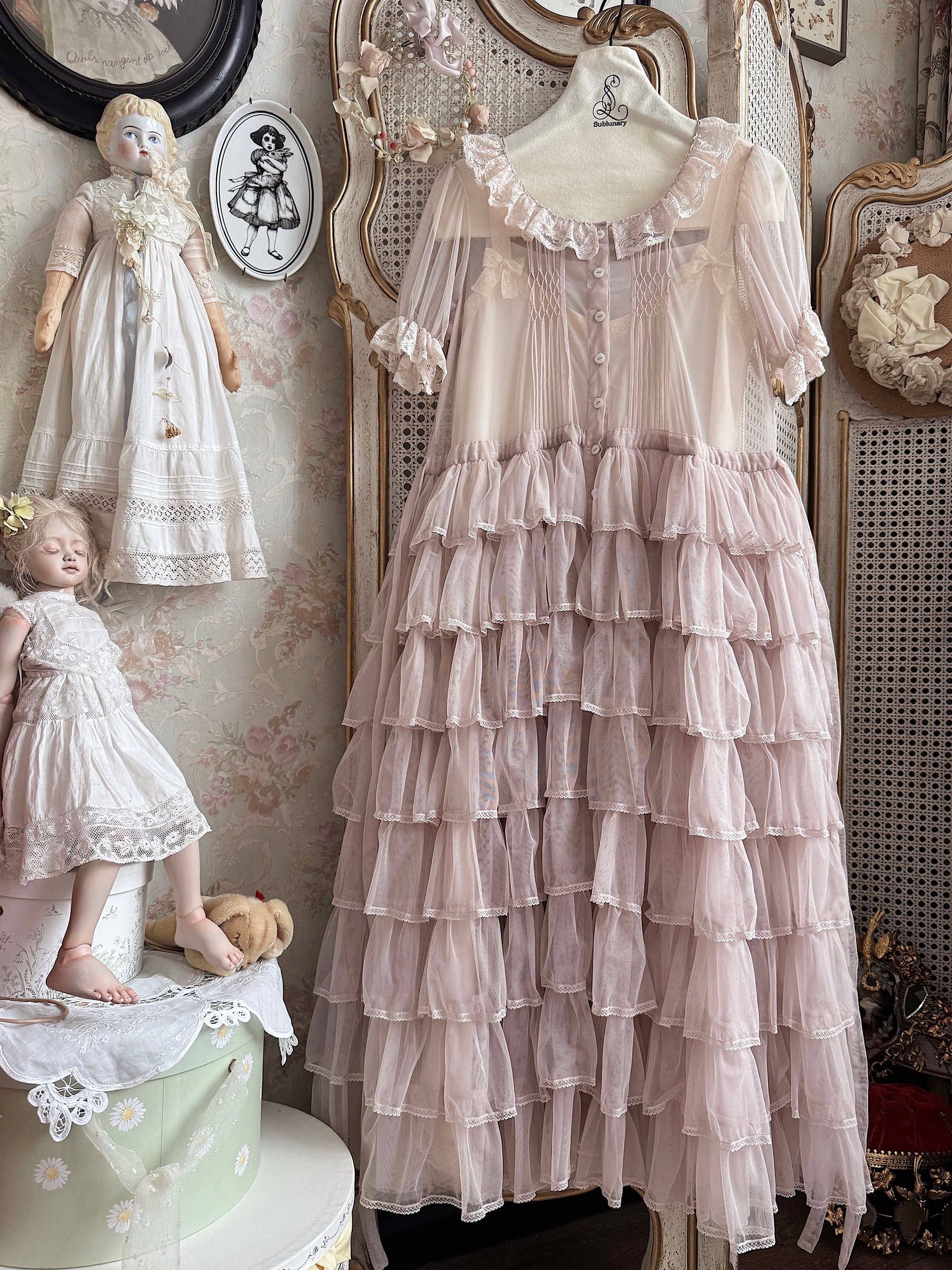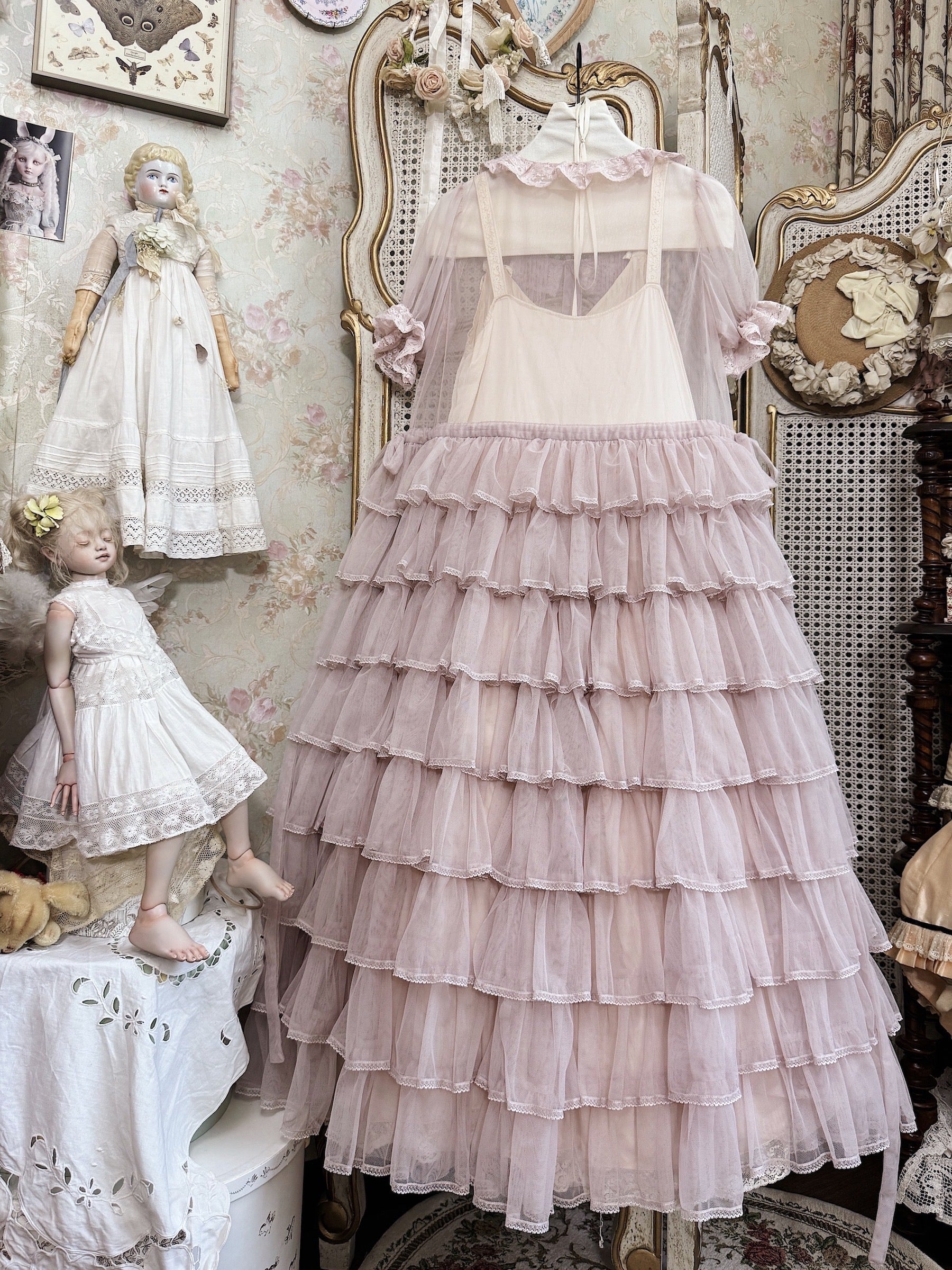 アンティークホワイトのスリップドレスに、淡いライラック色のシアーガウンを重ねた二点セット。シルクコットンとフランス製レース、天然シェルボタンで仕立てられ、ヴィクトリア時代のロマンティックな雰囲気を漂わせながら、軽やかな着心地を叶えています。幾重にも重なるフリルとスモッキングのディテールが、夢のように浮遊感のあるシルエットを生み出します。