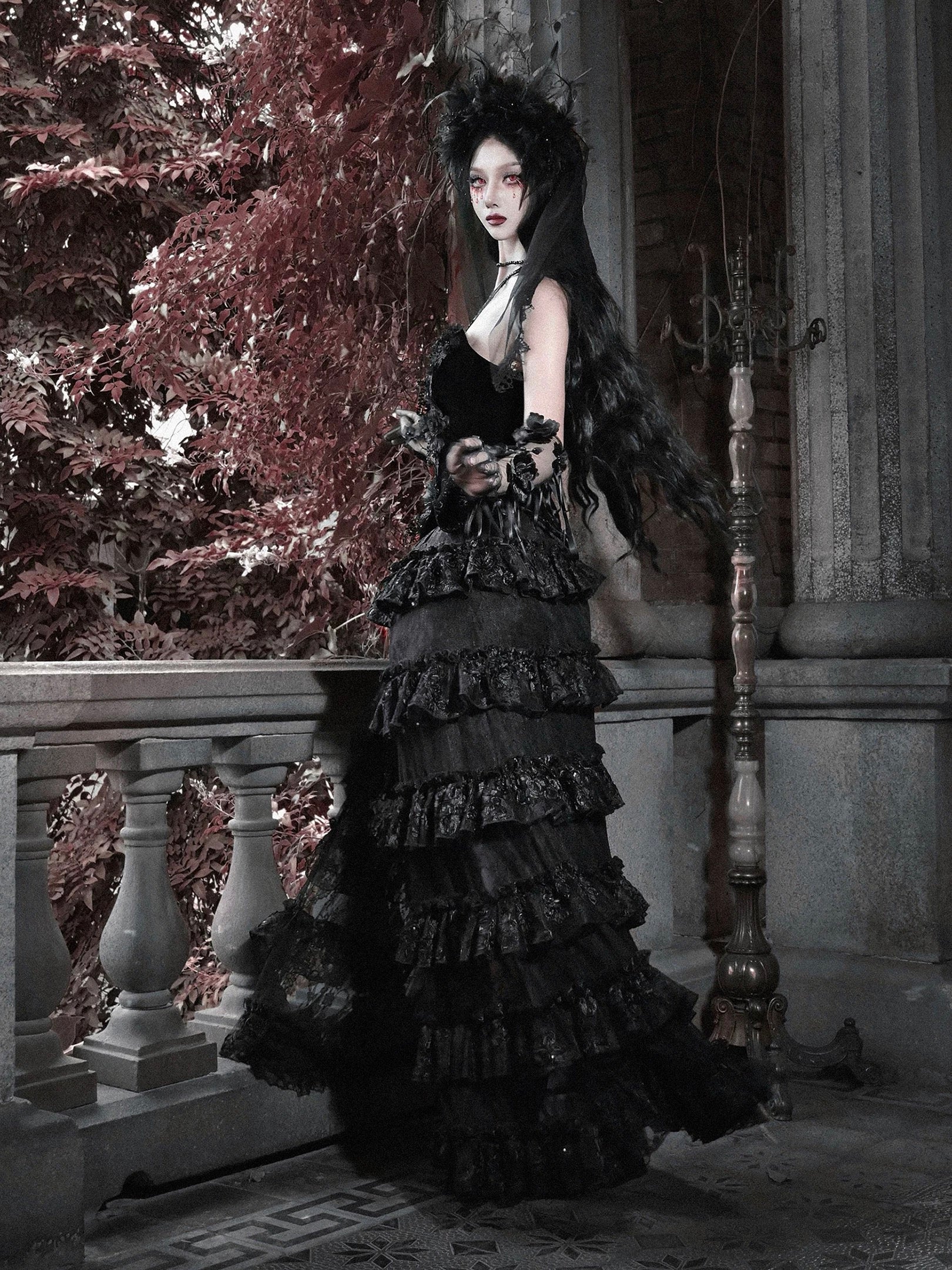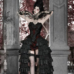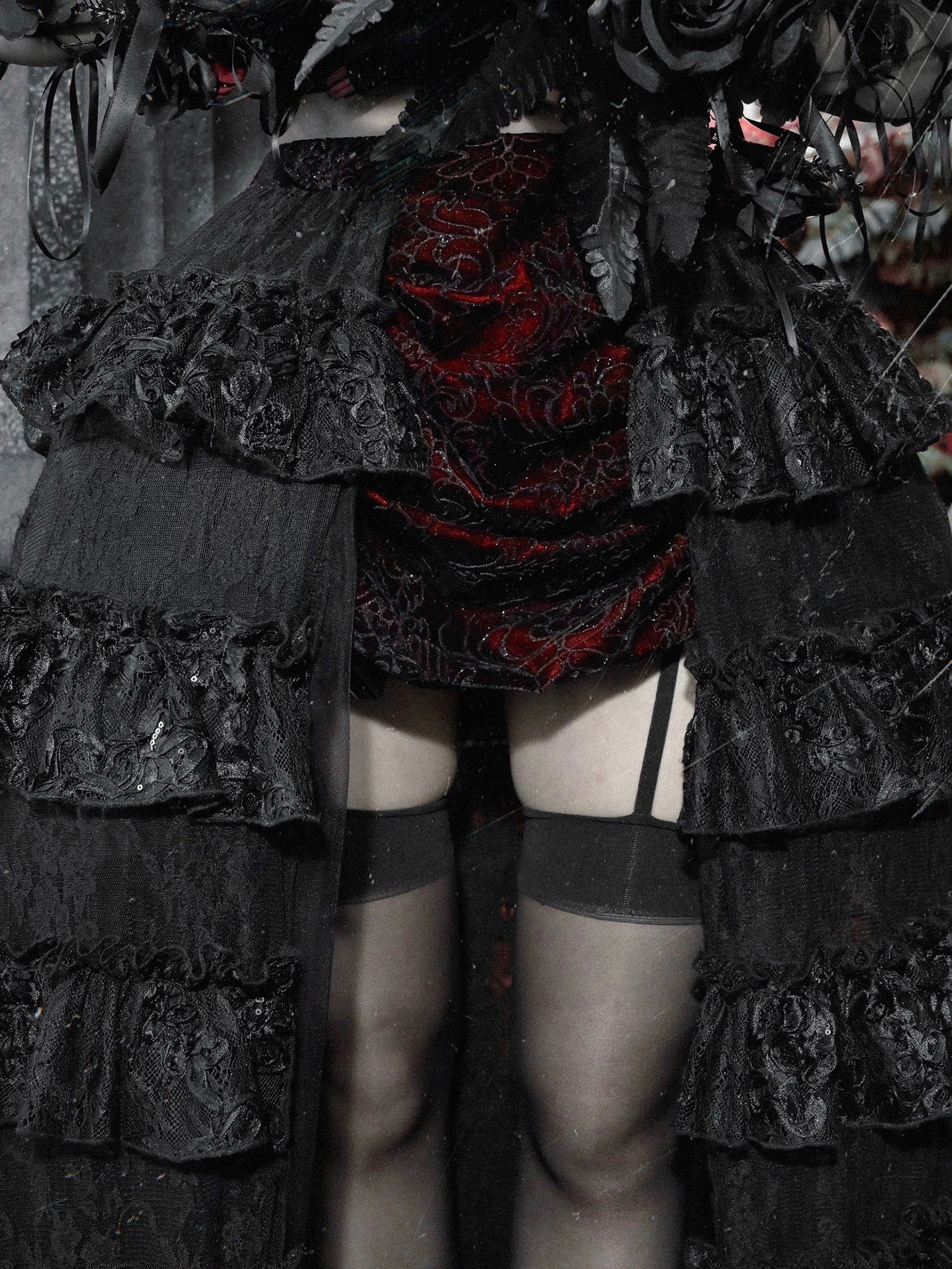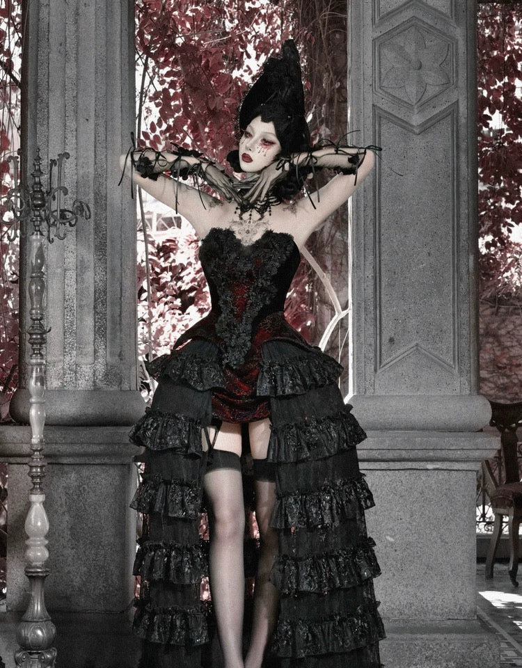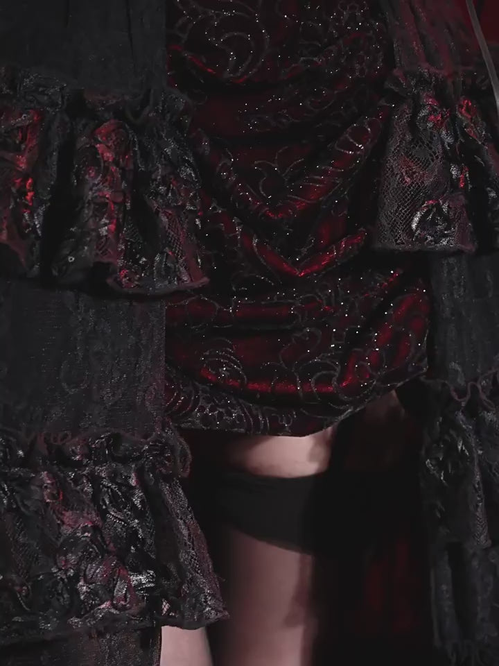 This piece features deep wine-red jacquard panels, contrasted by black layered lace ruffles cascading like shadows of velvet roses.