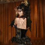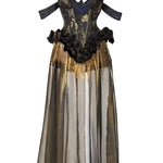 Step into a world of opulence with this baroque-inspired corset gown, crafted in gilded fabrics that shimmer like candlelight at dusk. The bodice is richly decorated with hand-stitched floral appliqués, cascading ruffles, and golden tassel fringes, creating a striking interplay of texture and light.