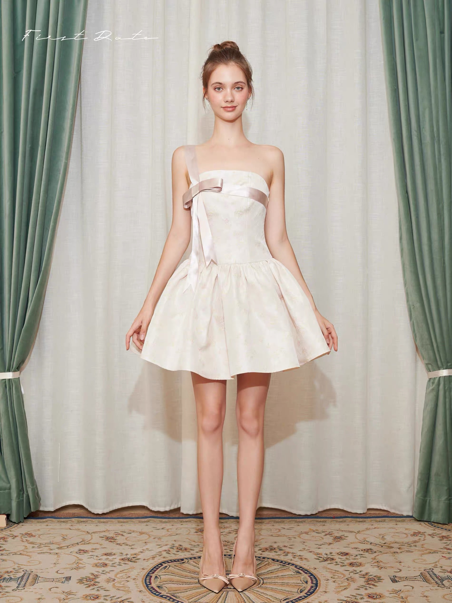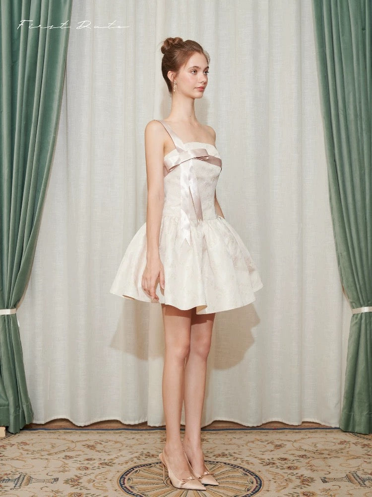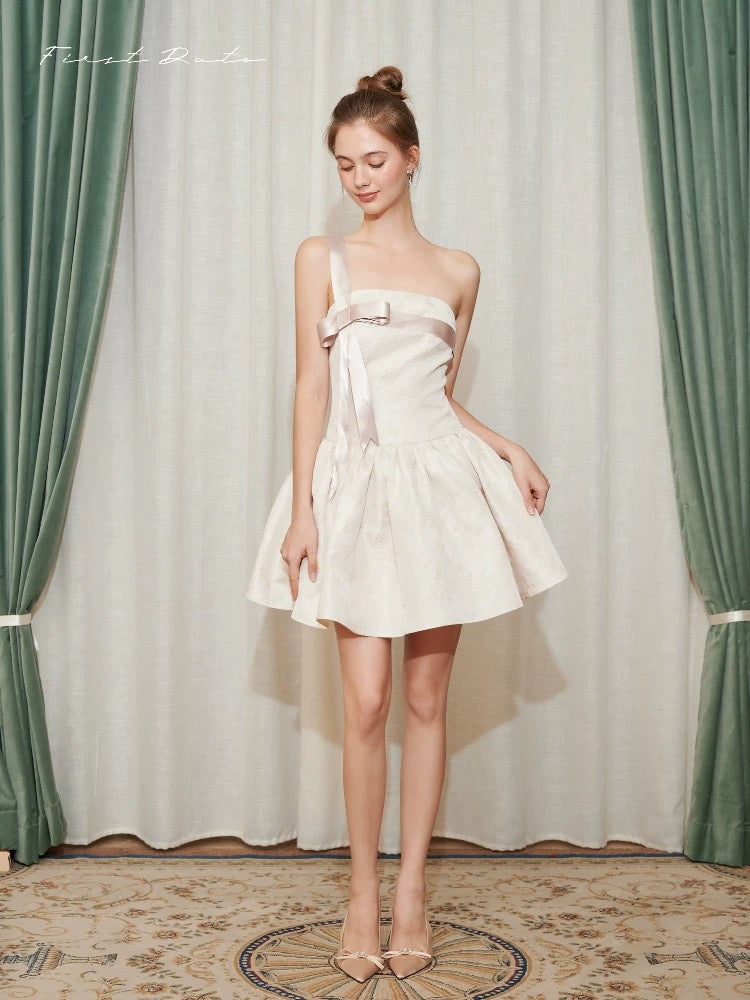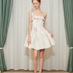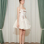This dress features an off-shoulder neckline with a charming bowknot bustier, capturing the essence of romantic styling. The wide A-line skirt cascades gracefully, offering a voluminous silhouette that emphasizes movement and grace. A distinctive inverted triangle design at the waist accentuates the slimmest part of the torso, enhancing the natural hourglass figure. Each element combines to craft a gown that's as breathtaking as it is wearable, perfect for special occasions where making a memorable impression is key.