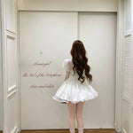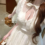 The neckline features a subtle cut-out design paired with a sweet Peter Pan collar and ribbon bow, creating a gentle doll-like silhouette. The puff sleeves add volume and softness, while the structured tuck pleats shape the waist beautifully.
