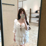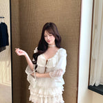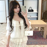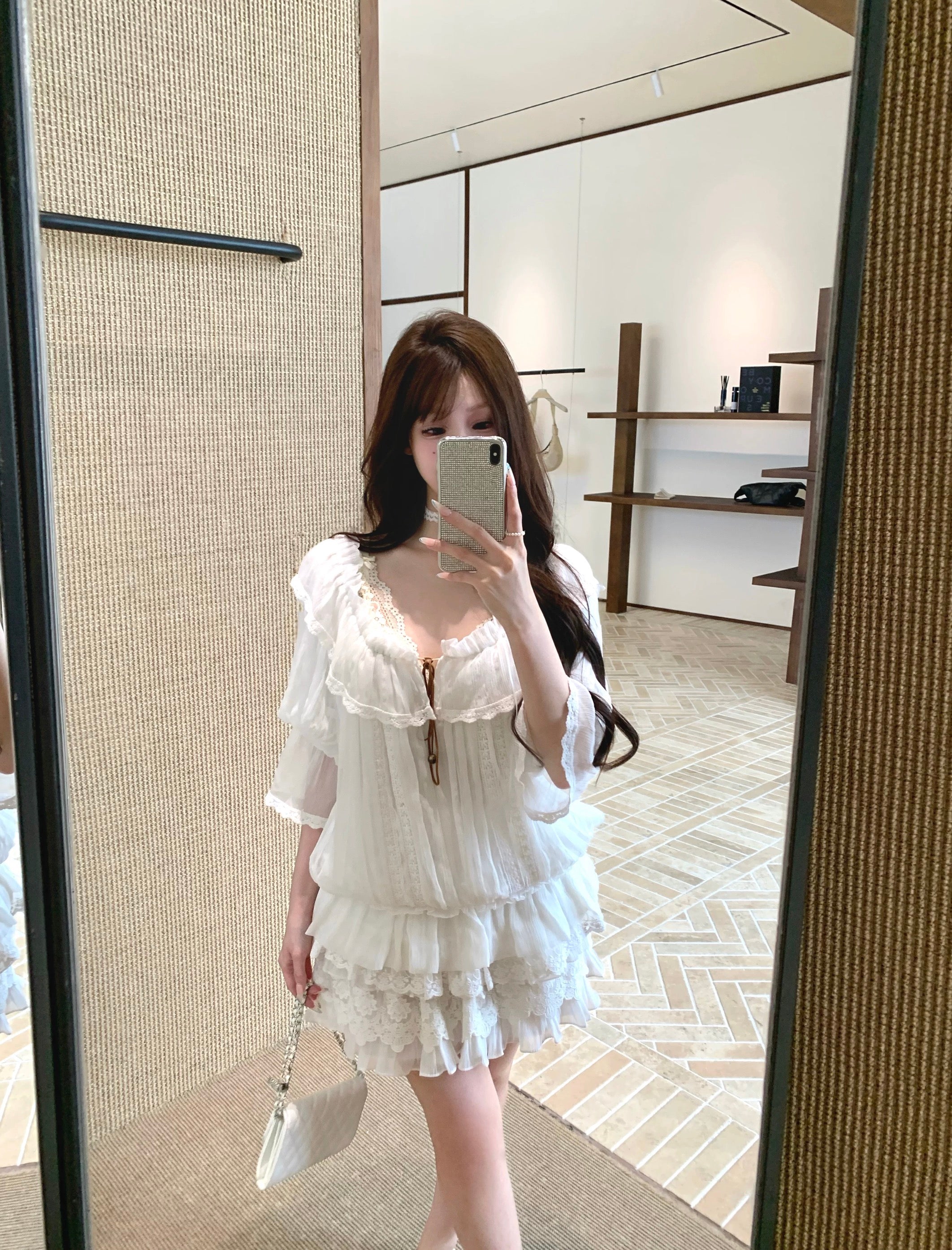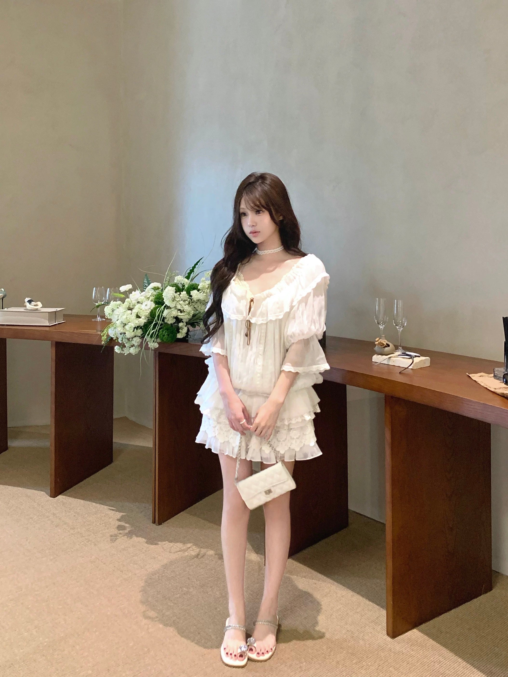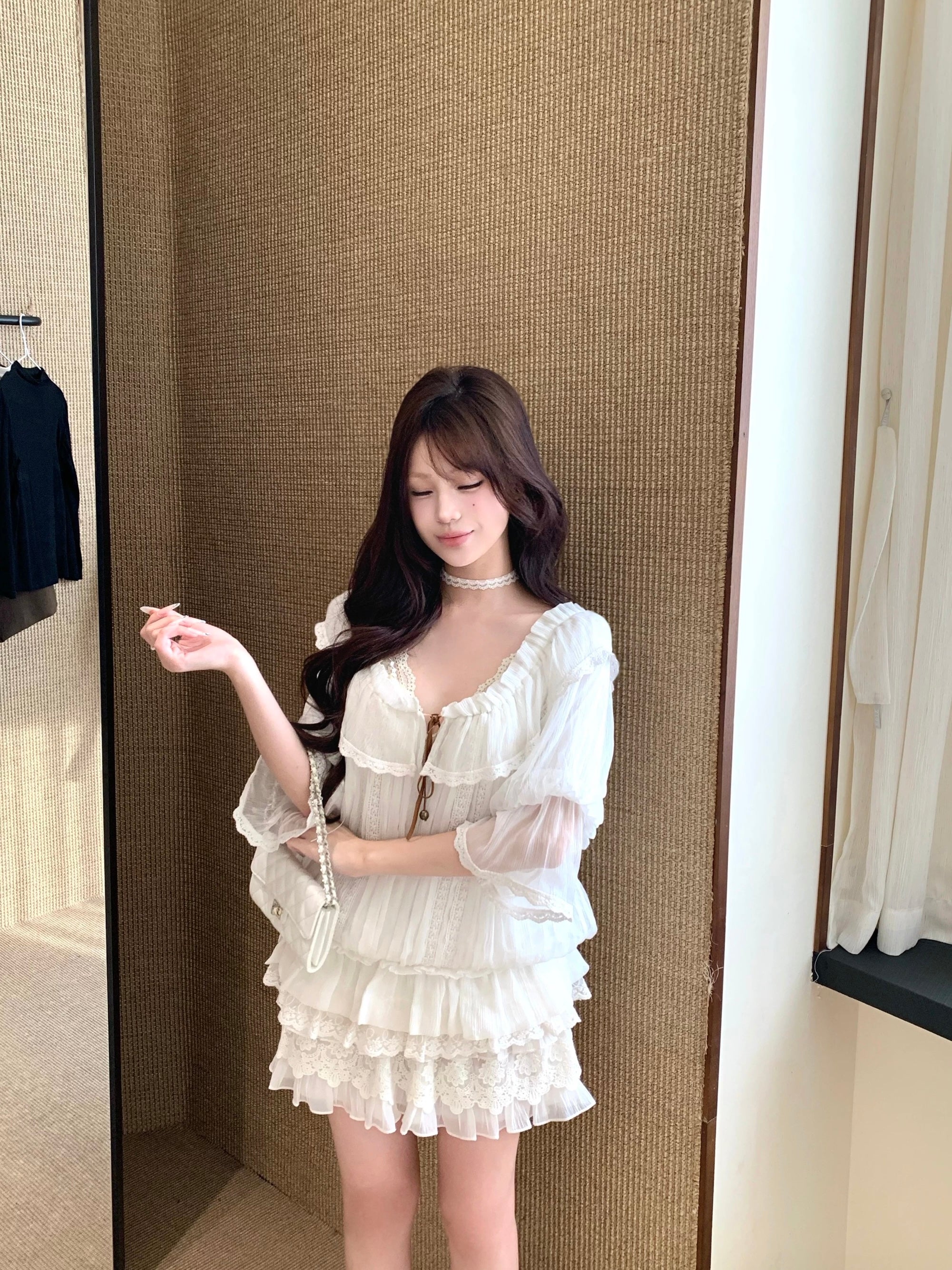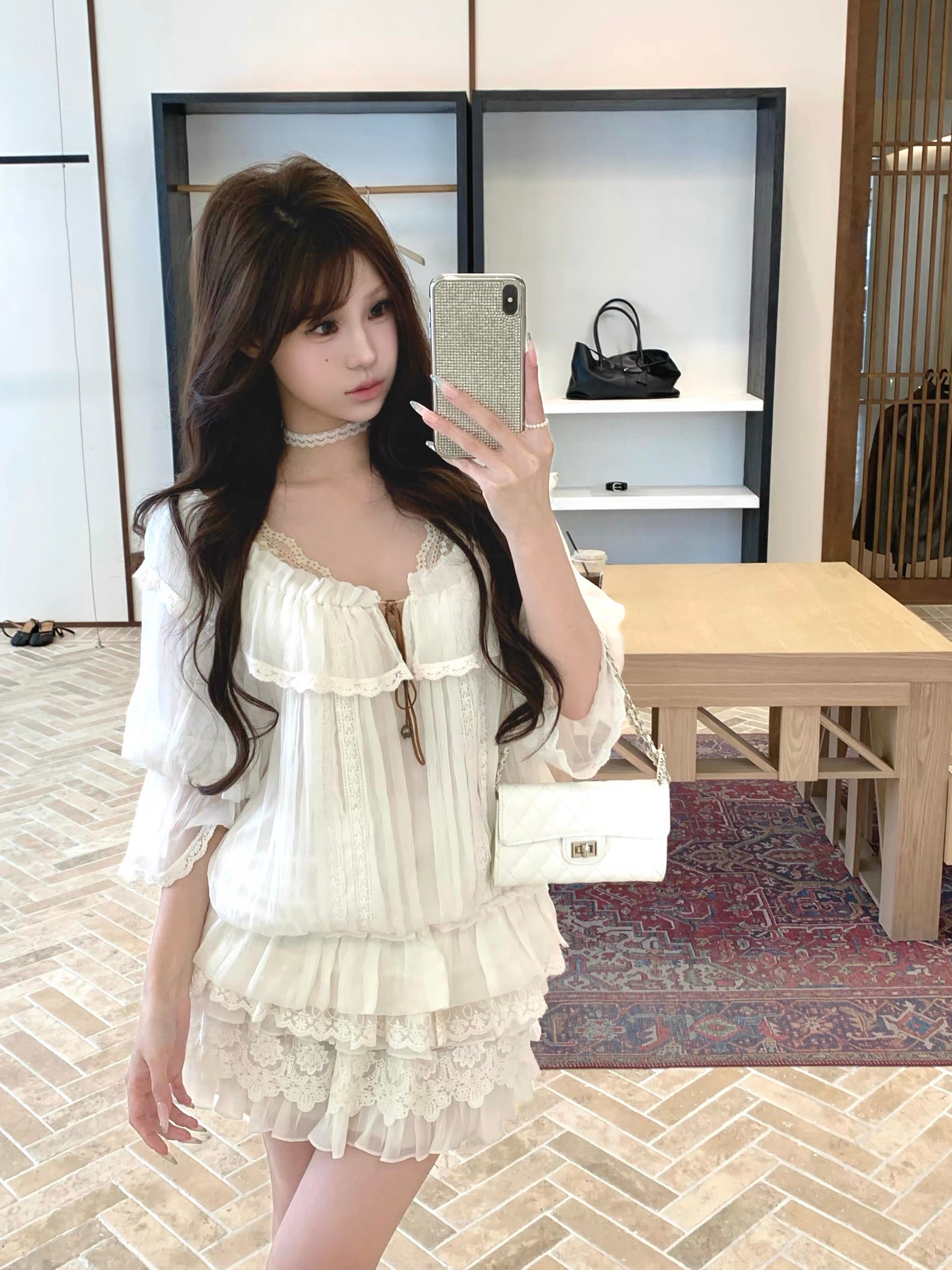 The matching skirt is designed with layered lace ruffles, forming a light cake-like shape that moves beautifully with every step. Together, the set creates a soft early-2000s sweet aesthetic with gentle Japanese vibes.