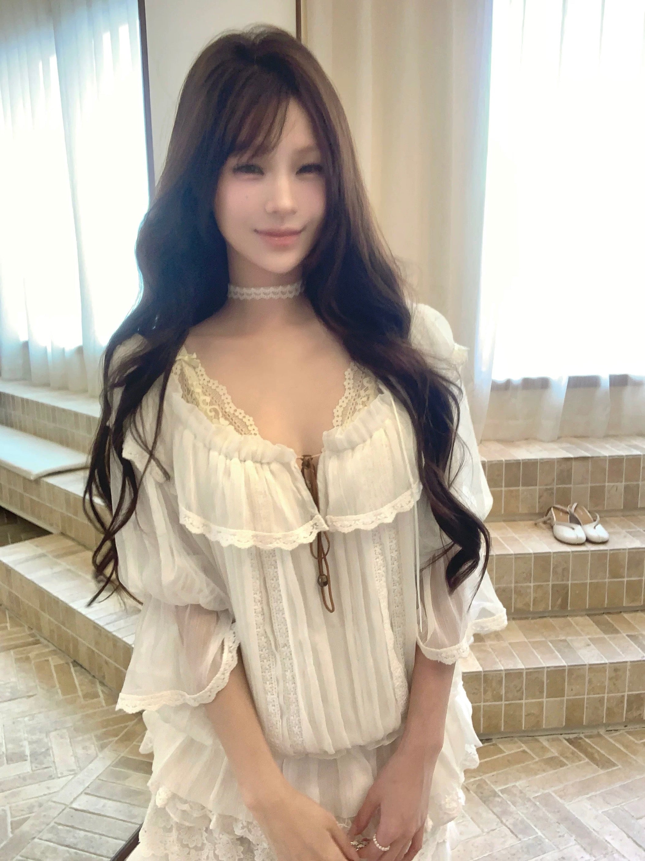 The blouse features soft sheer layers and gently voluminous lantern sleeves that create an airy, nostalgic silhouette. The neckline tie detail is adjustable, adding a subtle feminine charm.