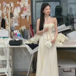 This intricately designed garment features a unique fish bones corset adorned with crafted pearl sewed on. Paired with high quality lustrous satin fabric in champagne beige color, it exudes elegance and sophistication, perfect for birthday parties or vacations.