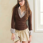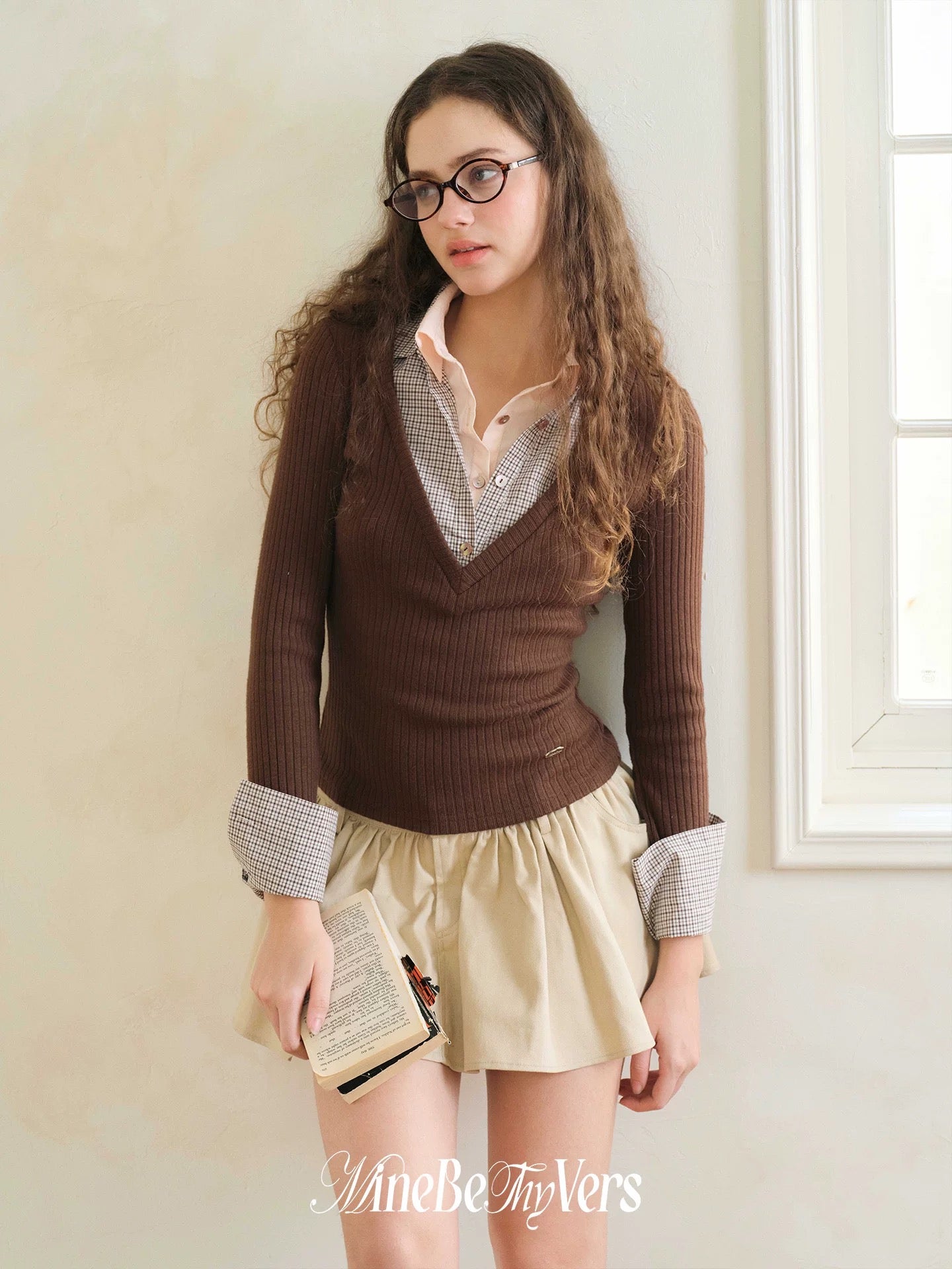 This knit top blends classic academic charm with modern layering aesthetics. Designed as a single-piece garment, it creates the illusion of a ribbed V-neck sweater layered over a checked shirt and inner blouse.