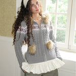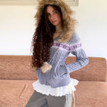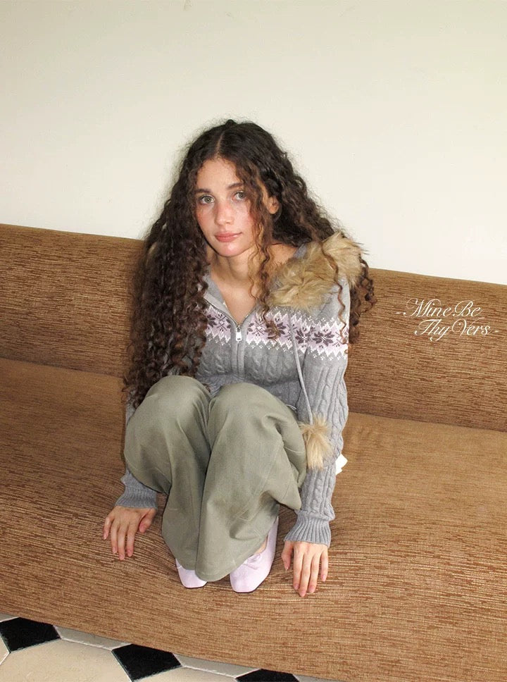 A cozy cottage dream with this soft cotton-knit hoodie cardigan. Featuring a delicate Fair Isle pattern in lilac and cream, fluffy faux-fur trim, and pom-pom ties, it’s the perfect blend of warmth and sweetness. Classic, elegant and little cute coquette core & vanilla girl vibe in styling while keeping you snug through autumn and winter days.