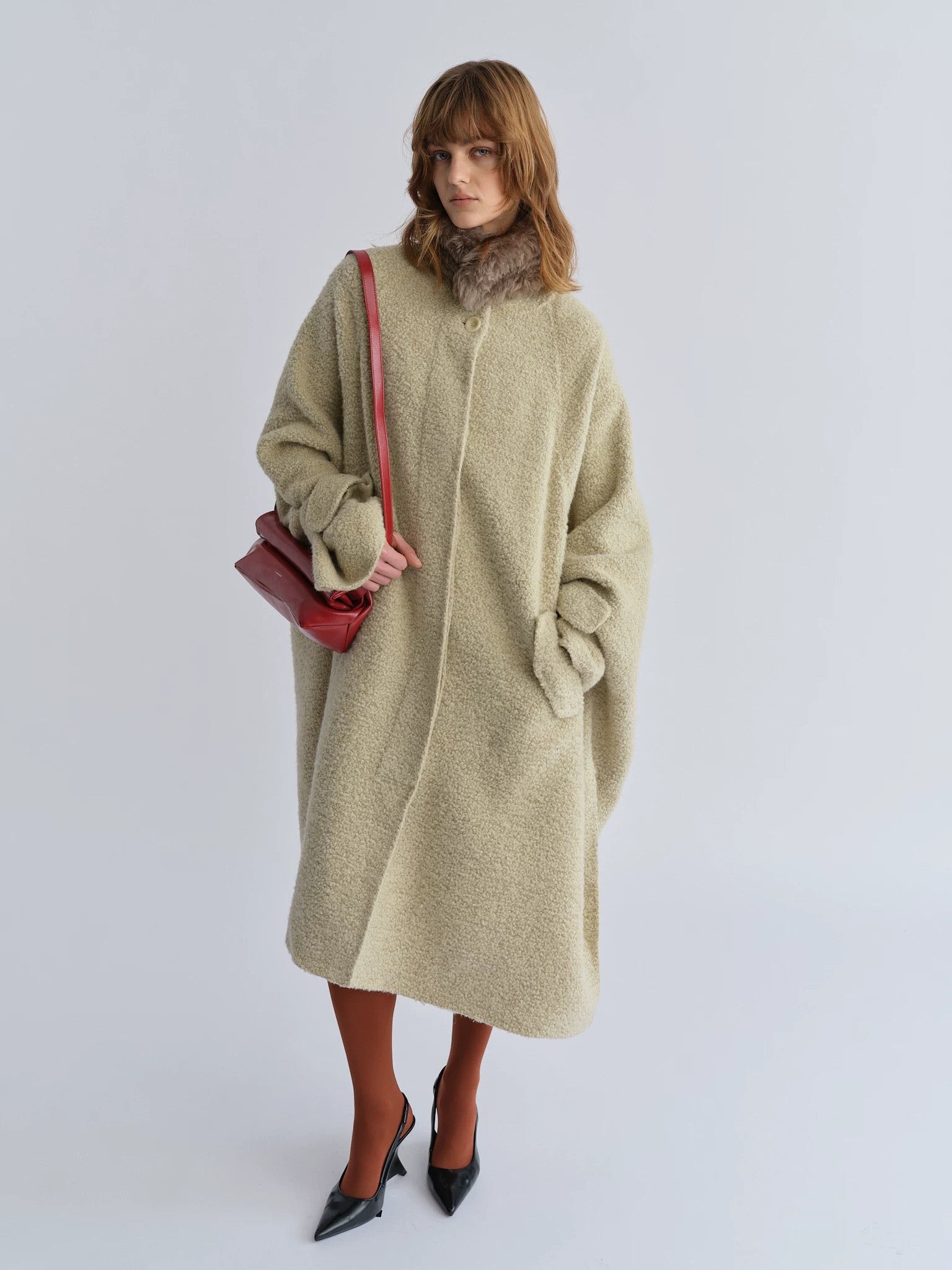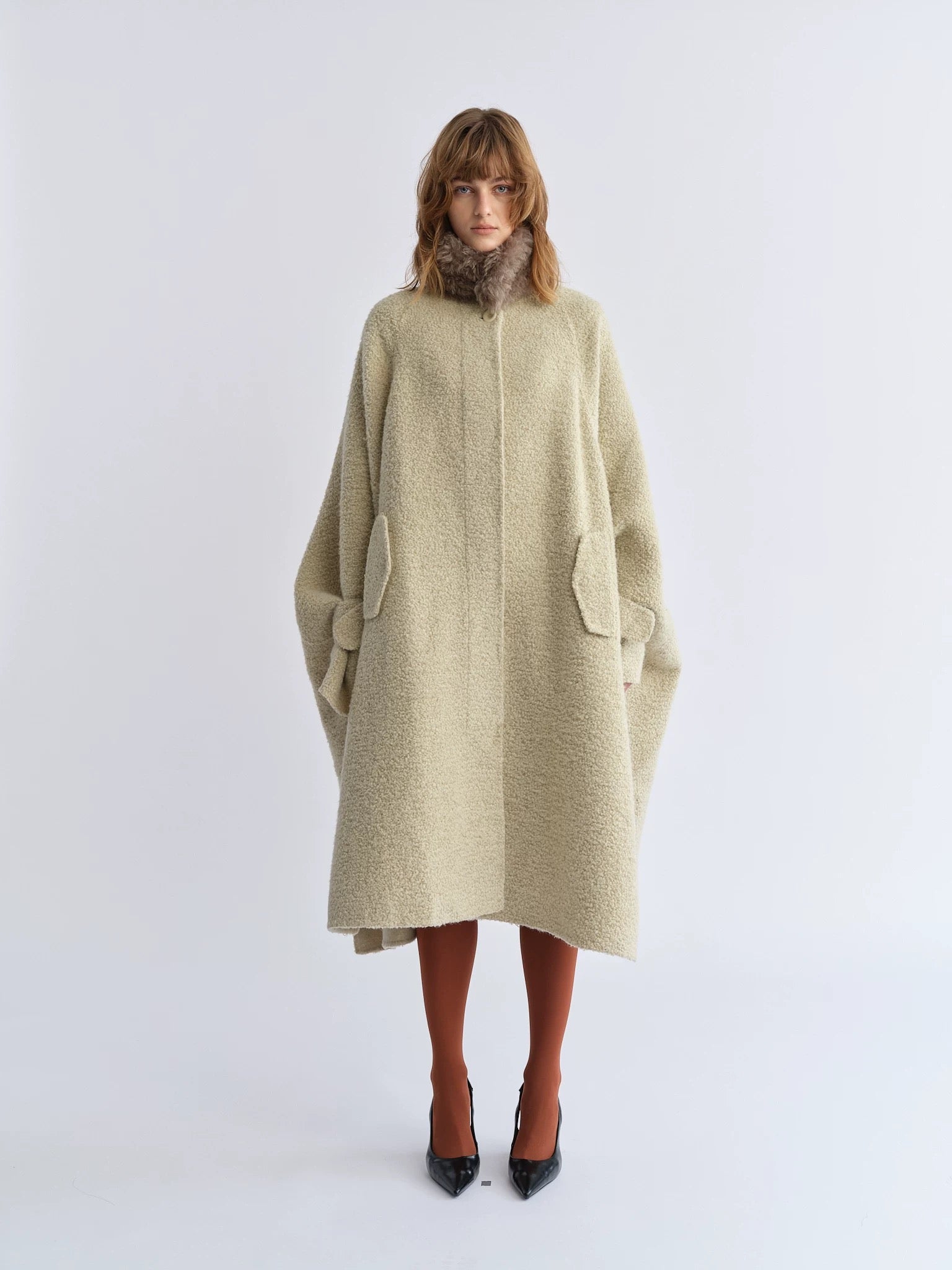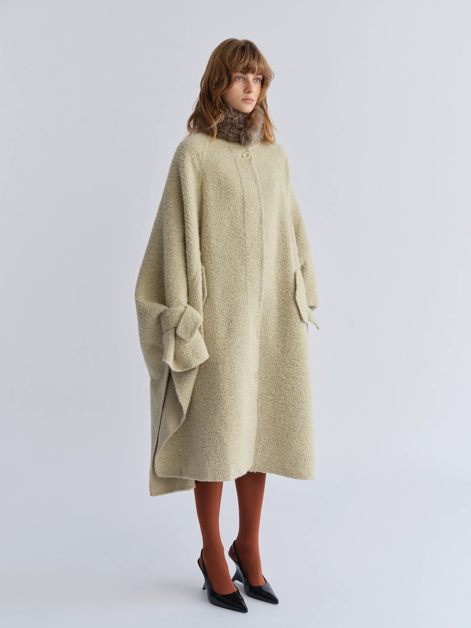 The detachable brown-grey faux-fur neck warmer adds warmth and a soft textural contrast, allowing two versatile looks: minimalist without the collar, or cozy and elevated with it. Extra-wide sleeves, generous volume, and asymmetric side openings create fluid movement and a modern architectural shape.