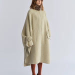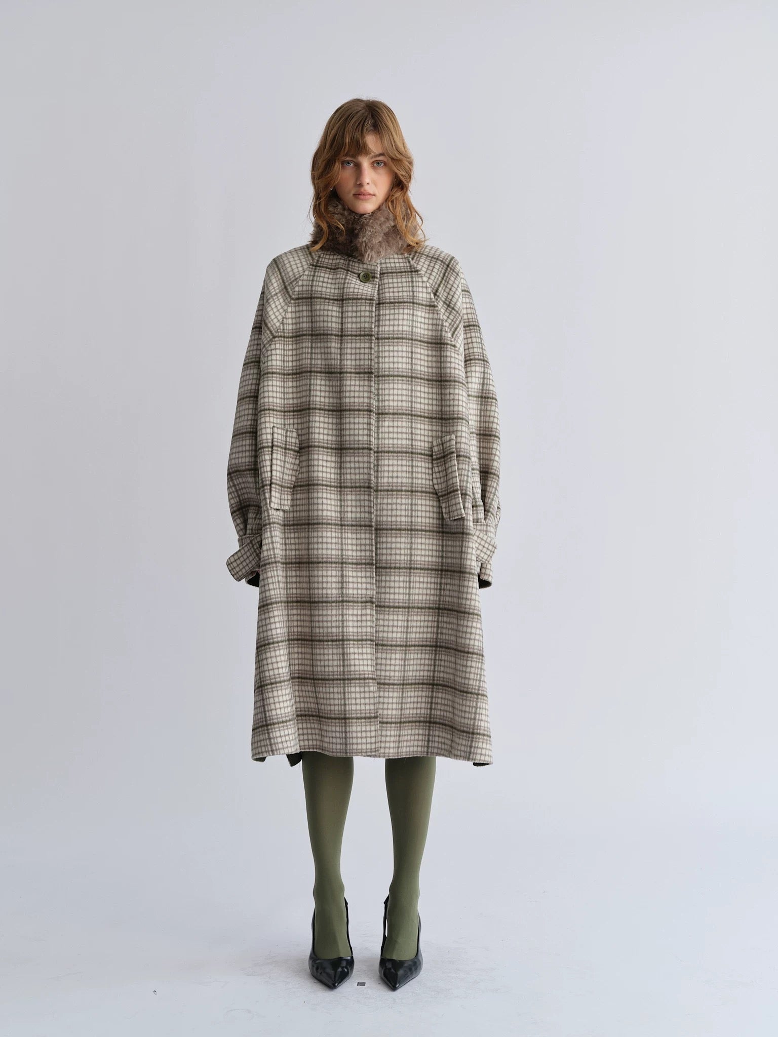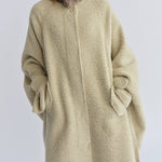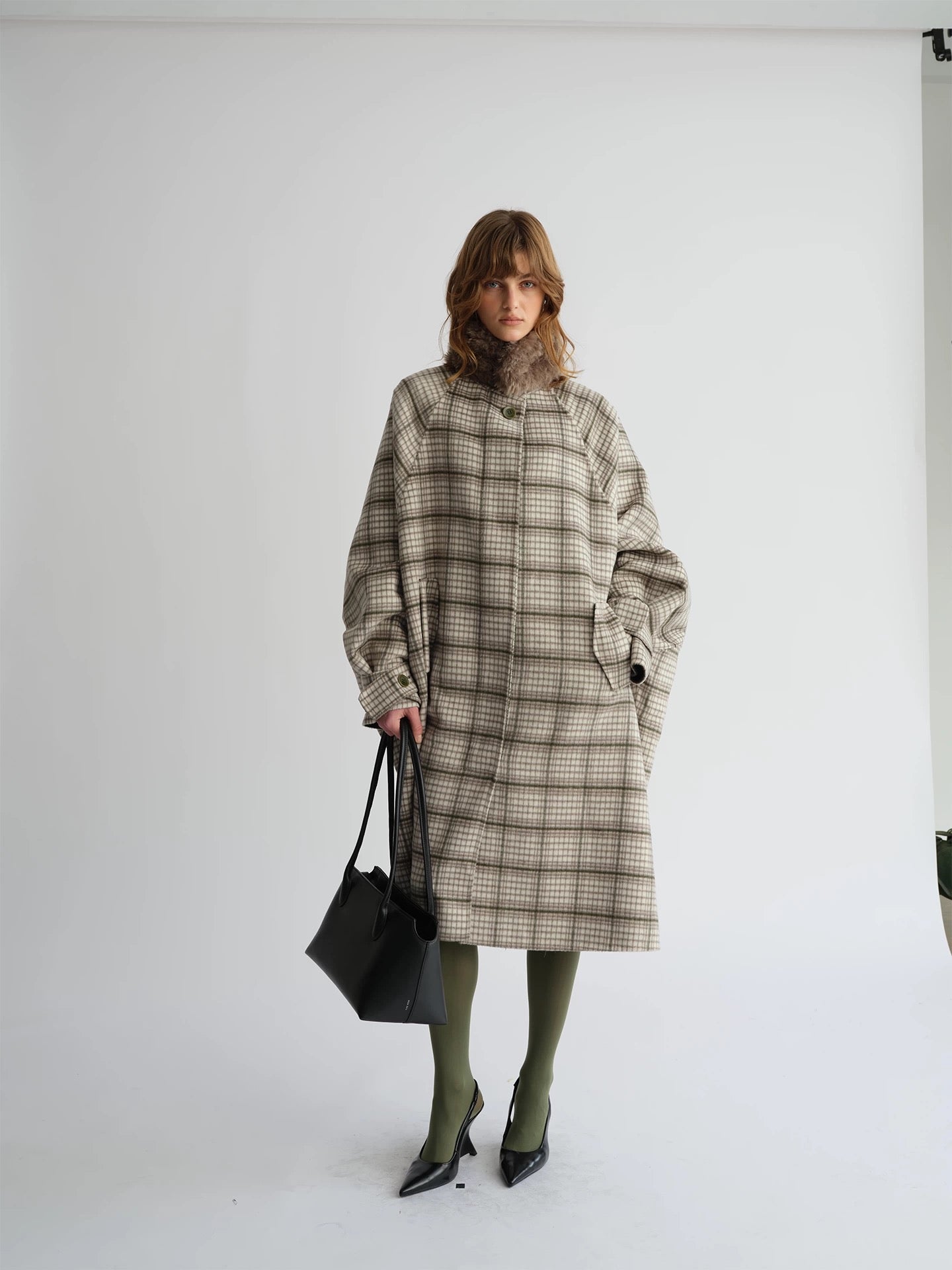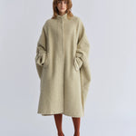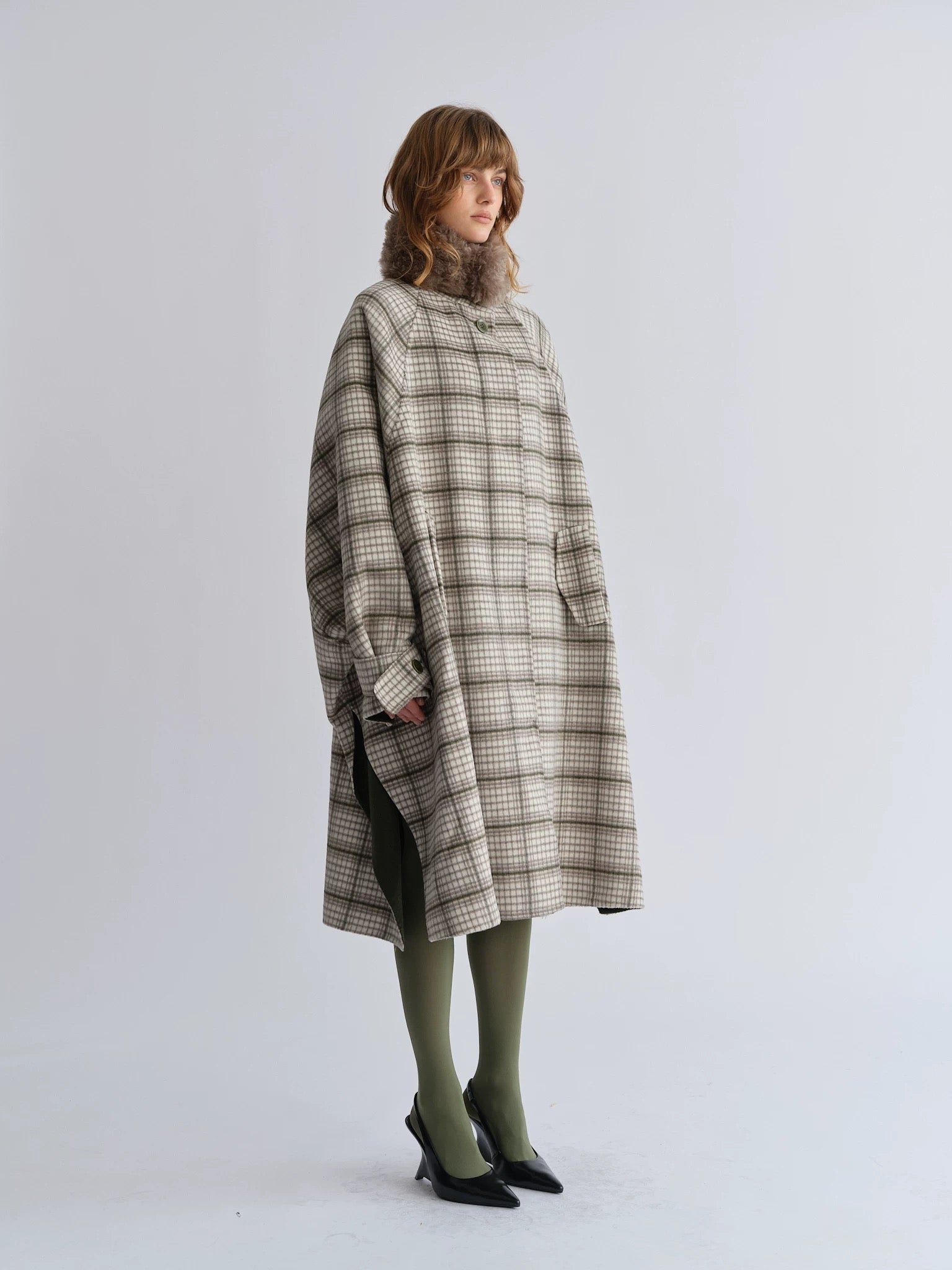 The detachable brown-grey faux-fur neck warmer adds warmth and a soft textural contrast, allowing two versatile looks: minimalist without the collar, or cozy and elevated with it. Extra-wide sleeves, generous volume, and asymmetric side openings create fluid movement and a modern architectural shape.