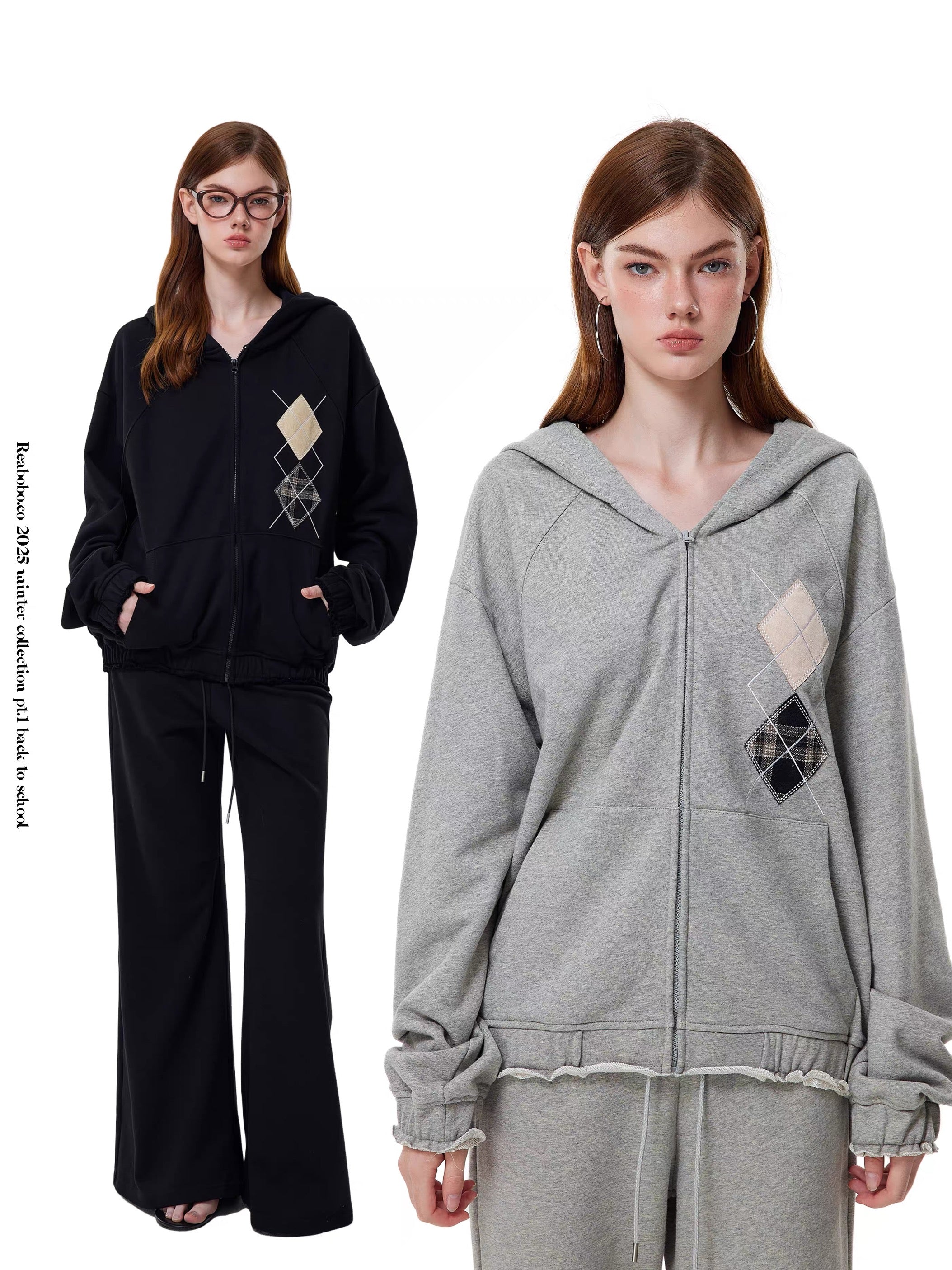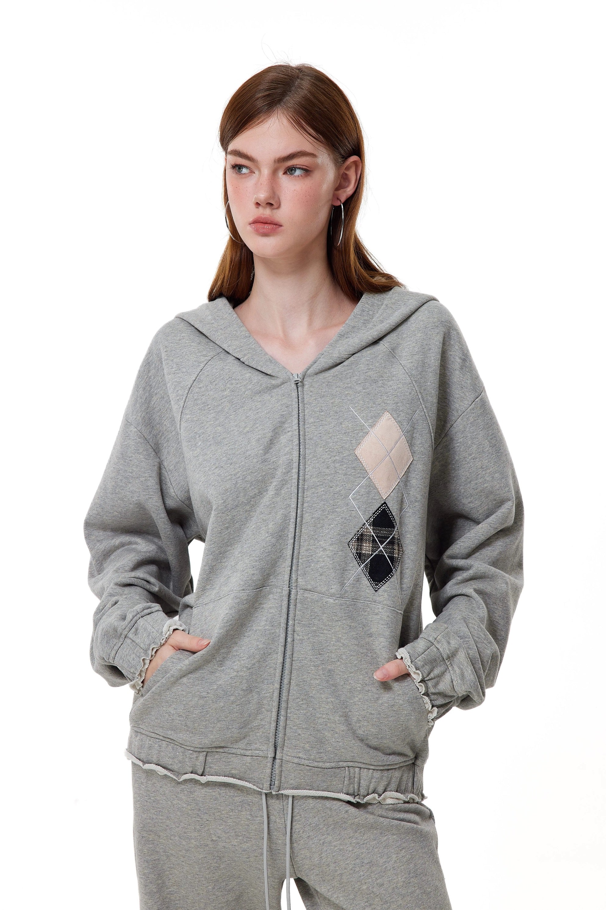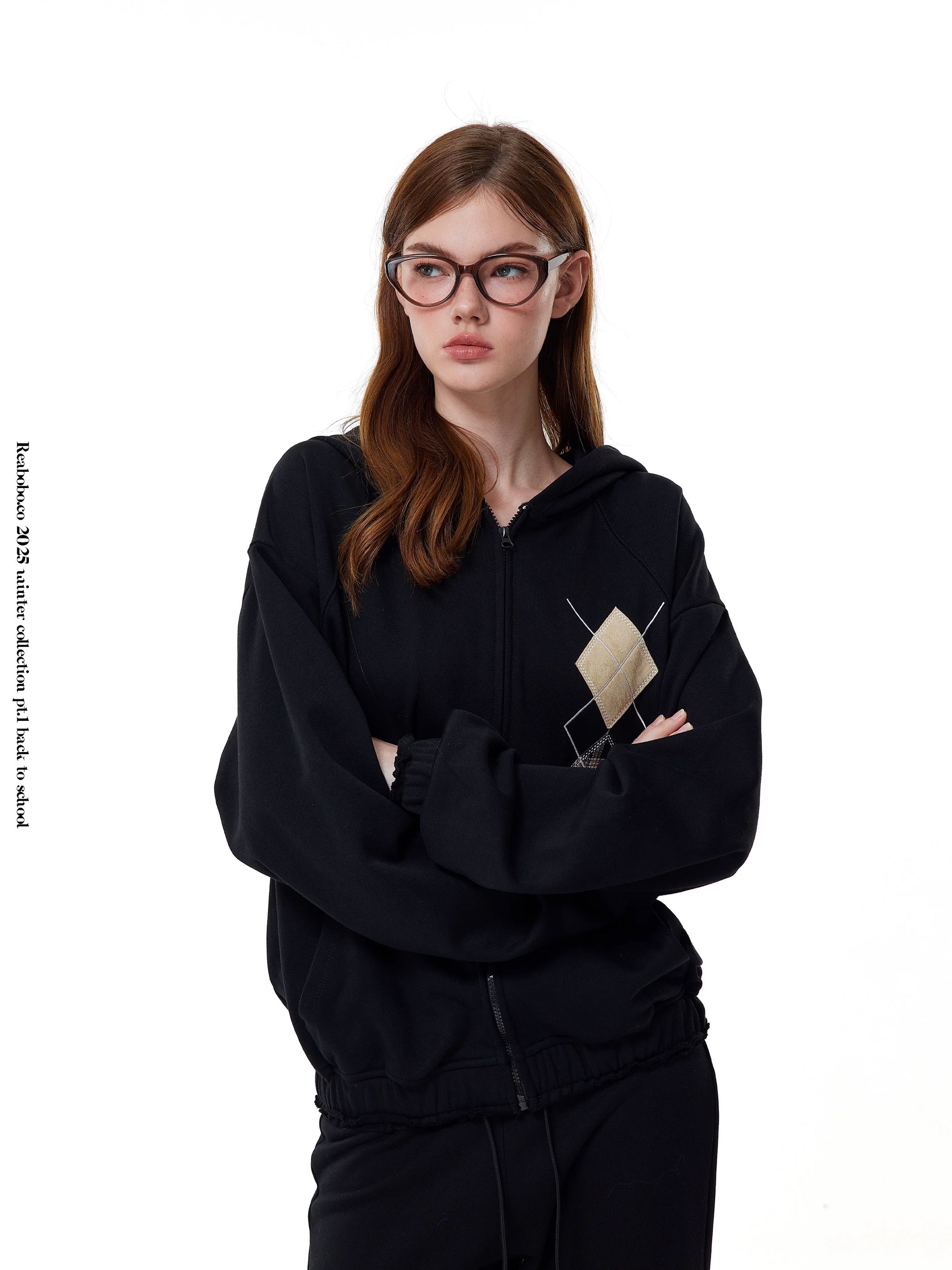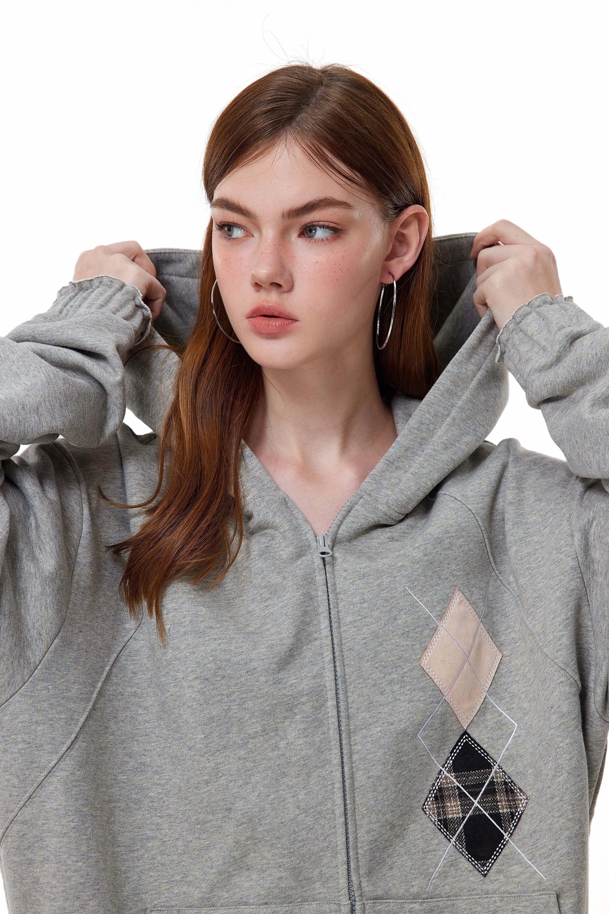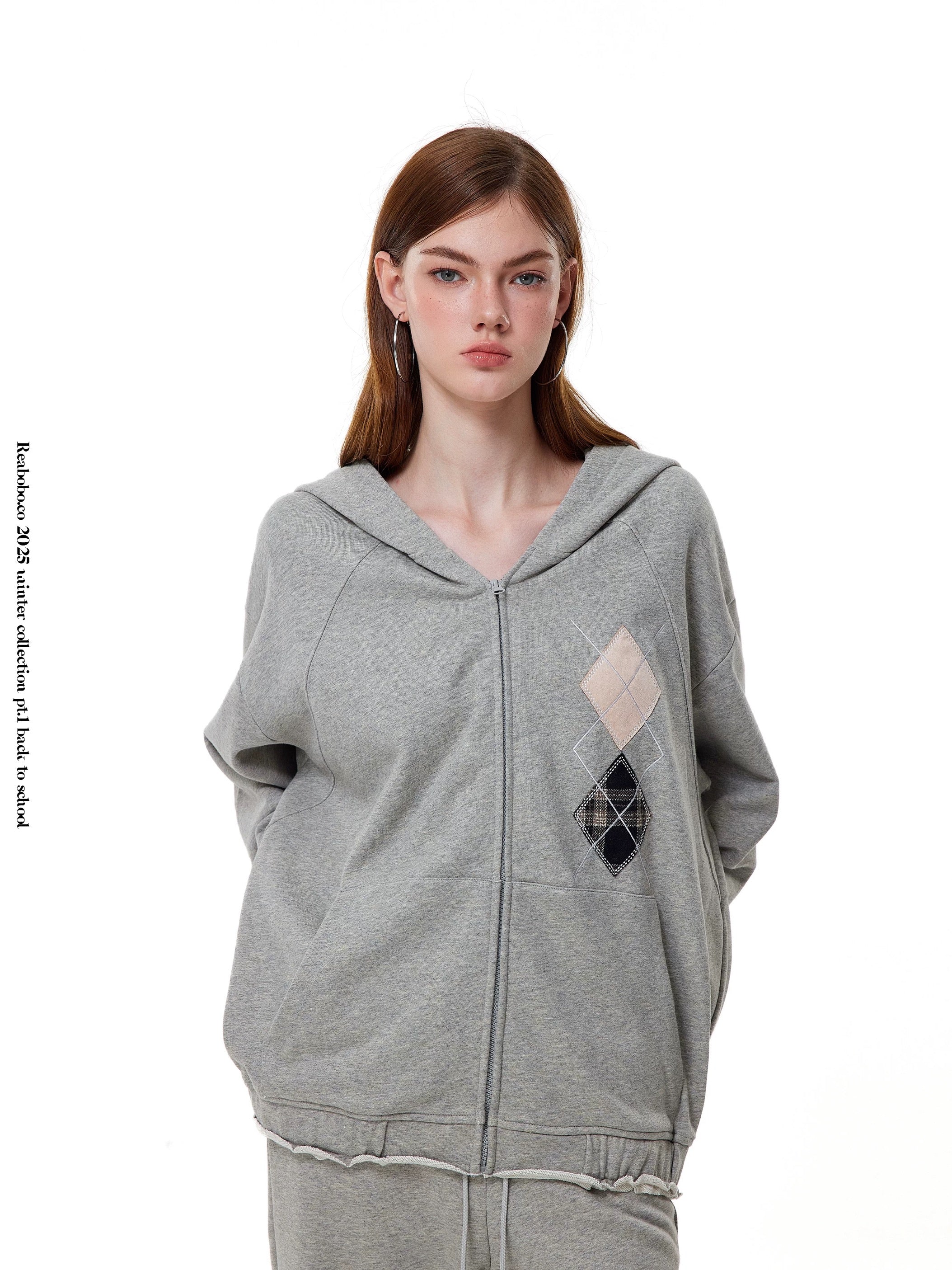 The oversized zip-up hoodie features Reabobo’s signature argyle patch embroidery and frayed hem detail.
