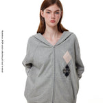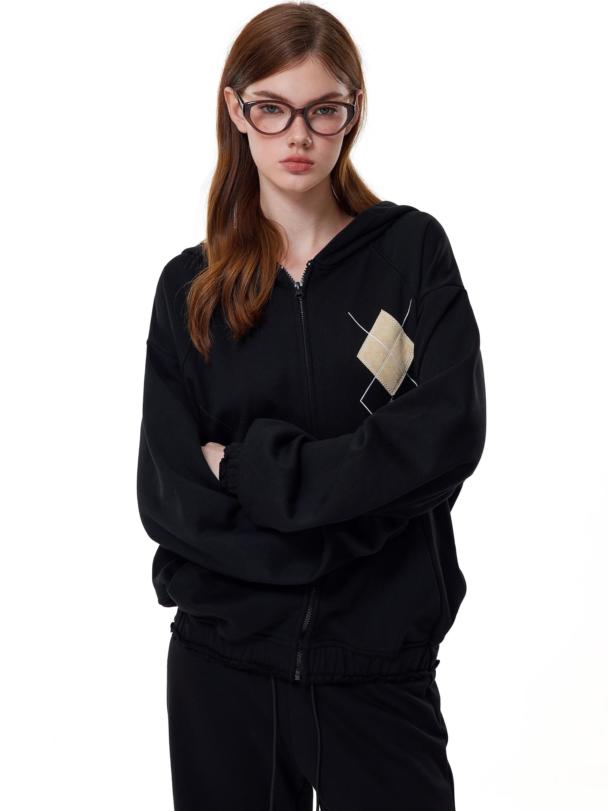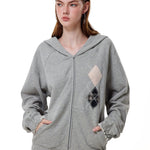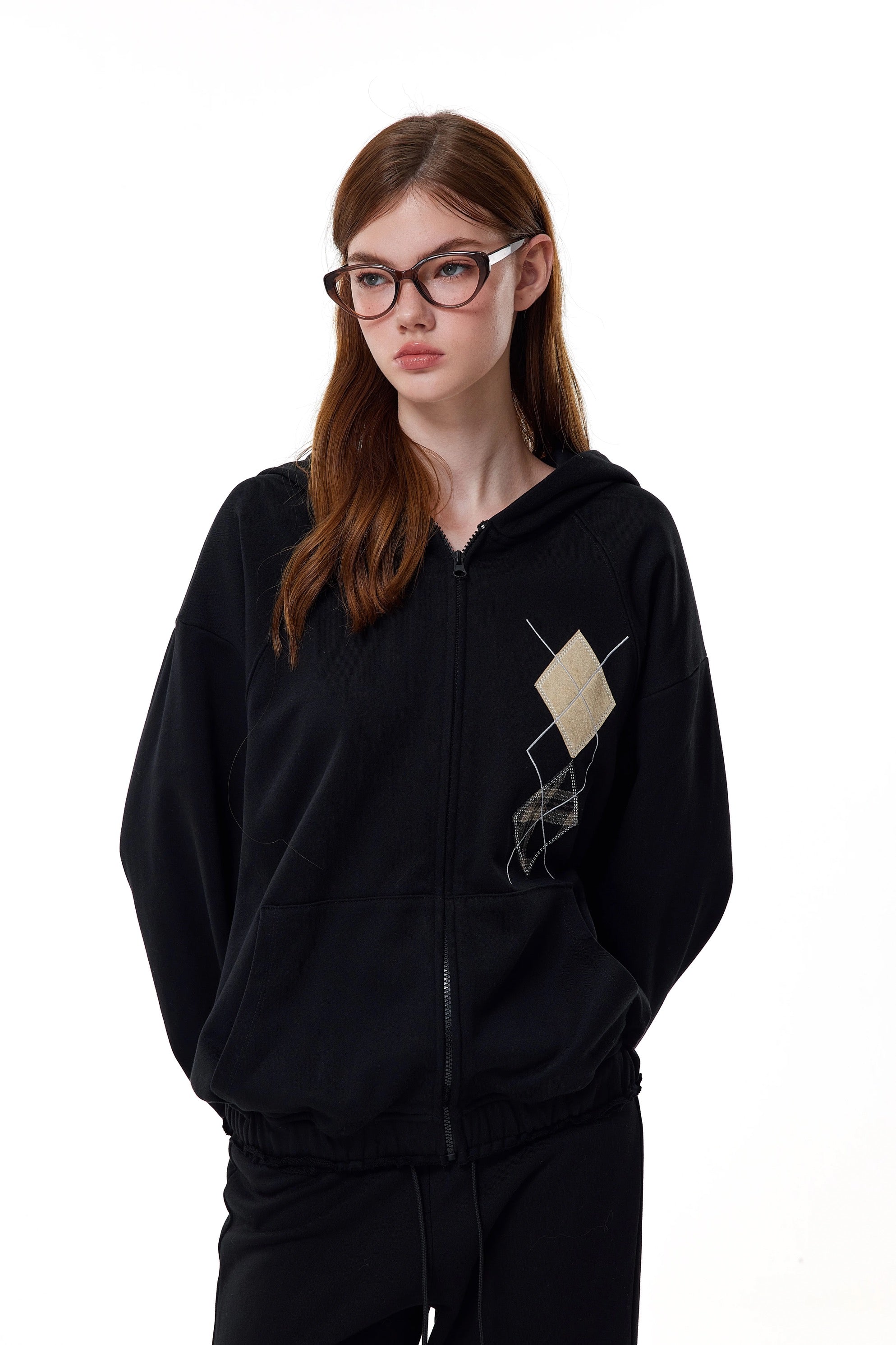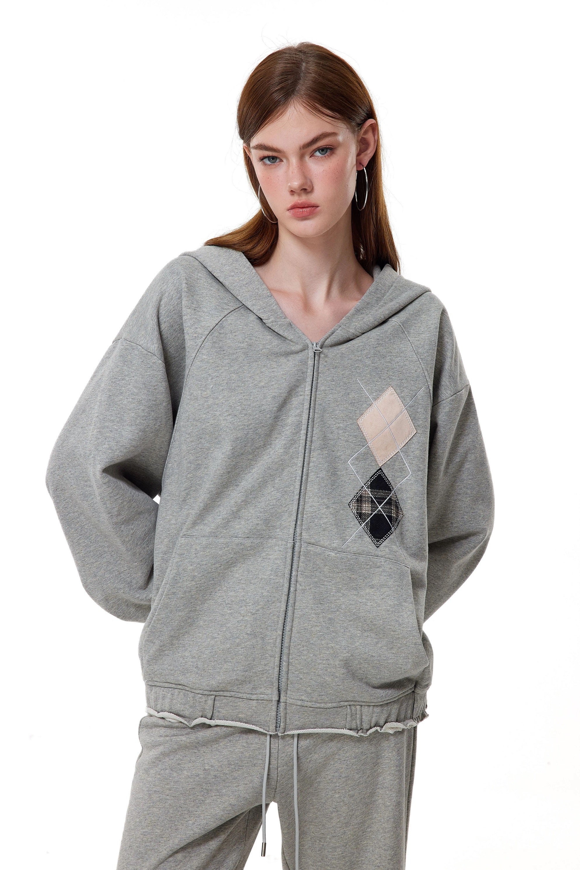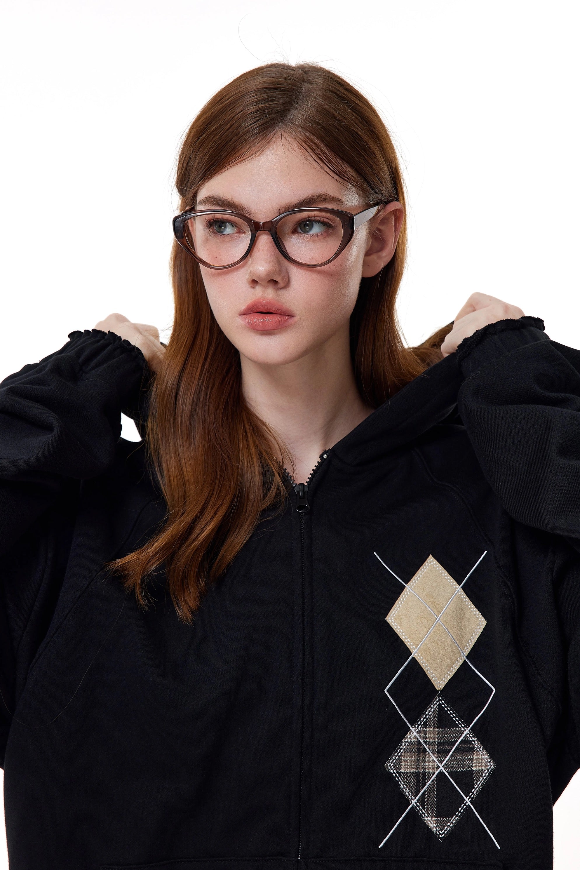 The oversized zip-up hoodie features Reabobo’s signature argyle patch embroidery and frayed hem detail.