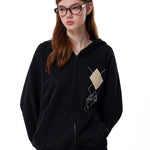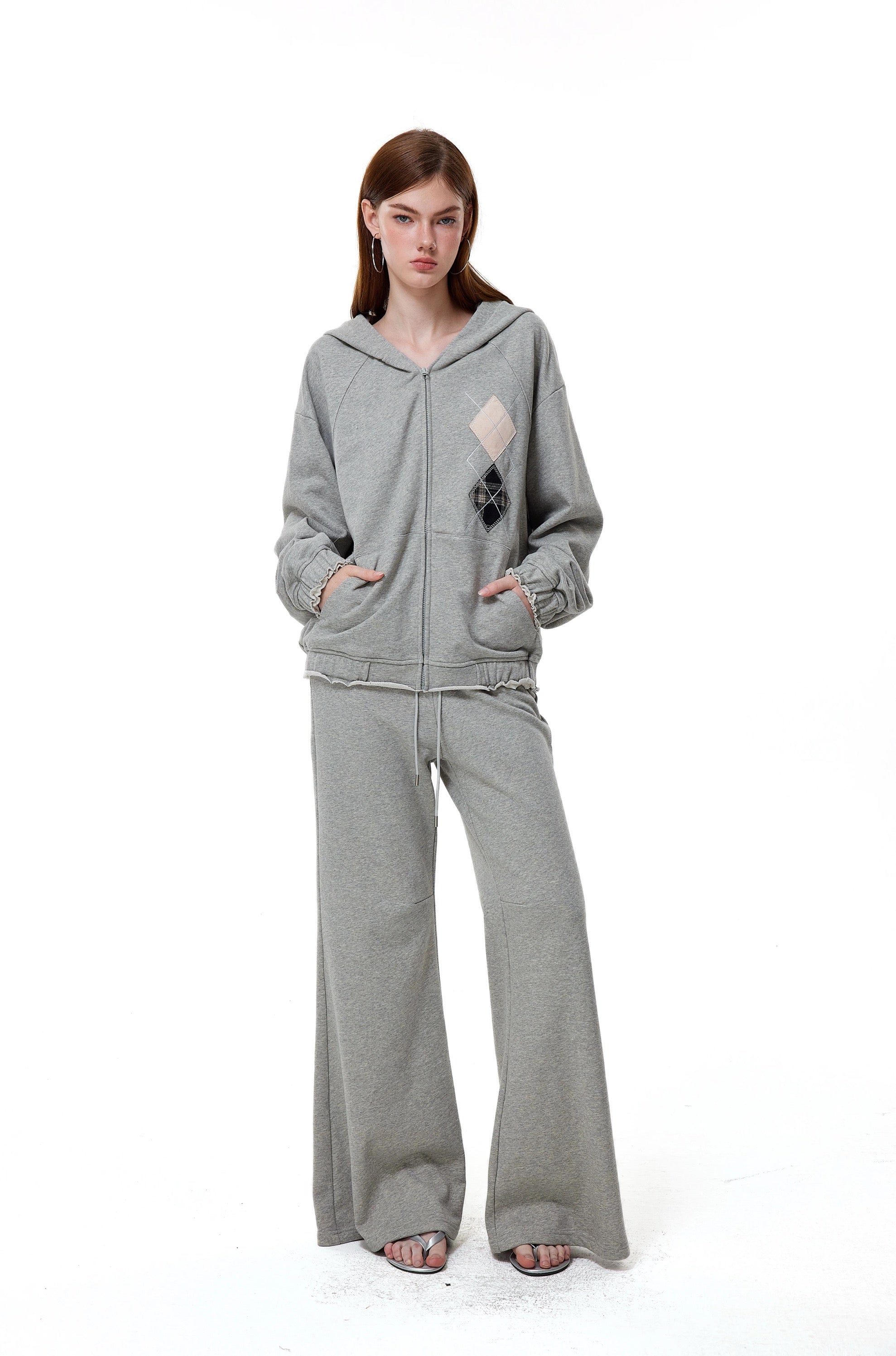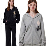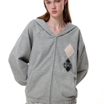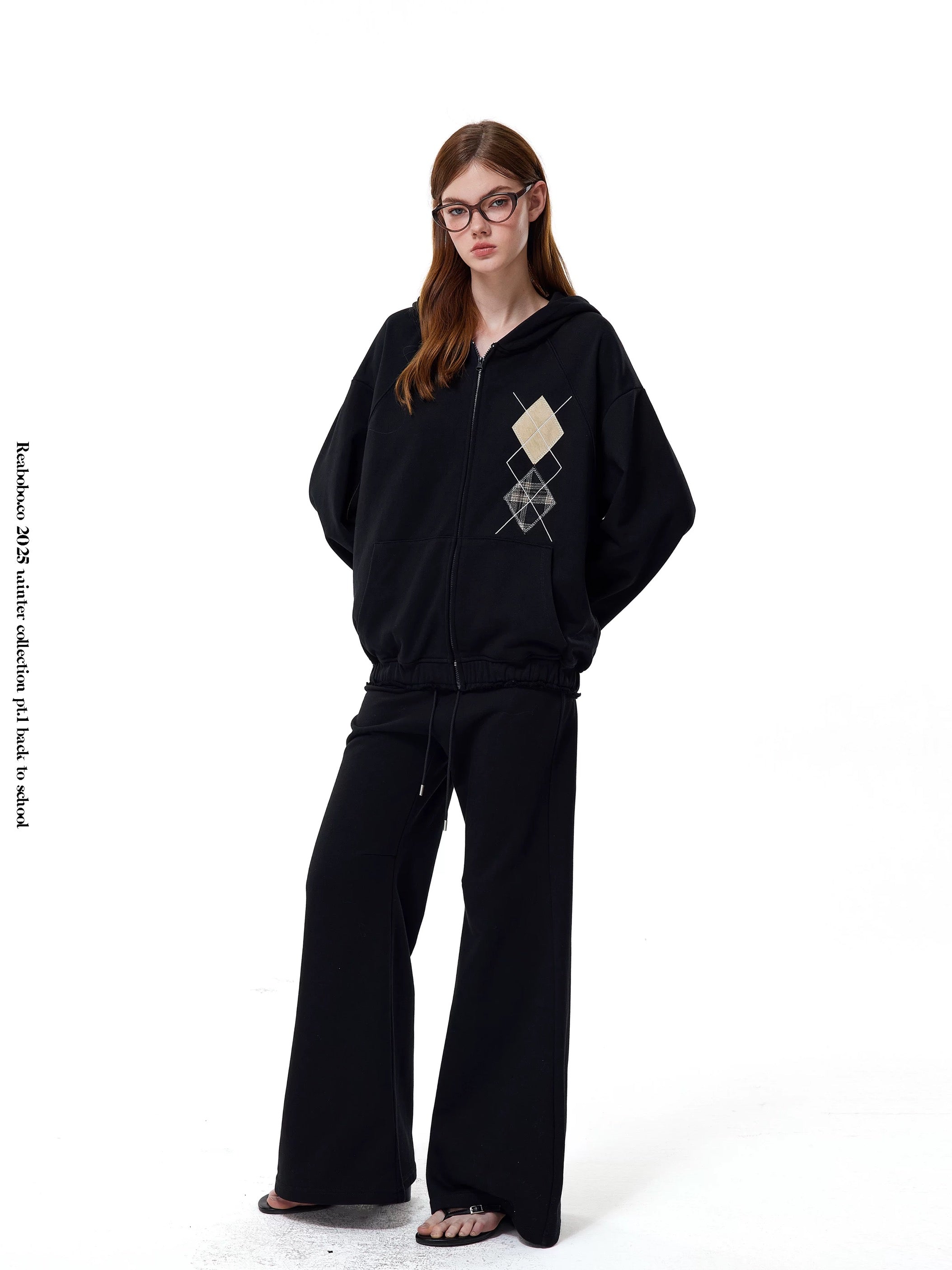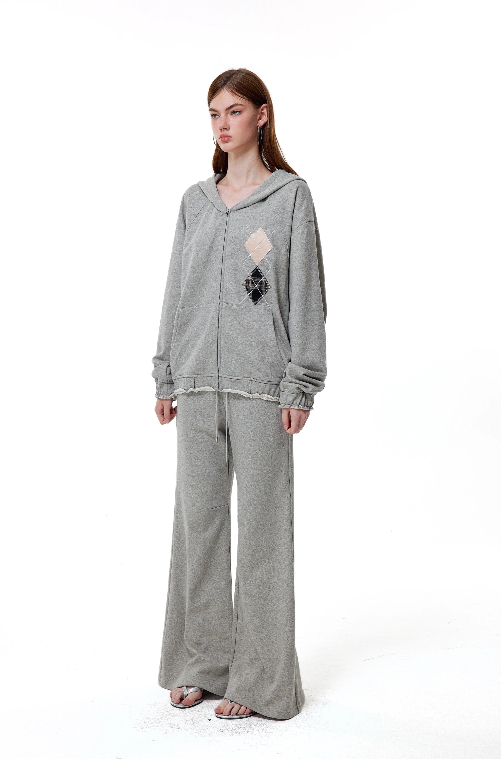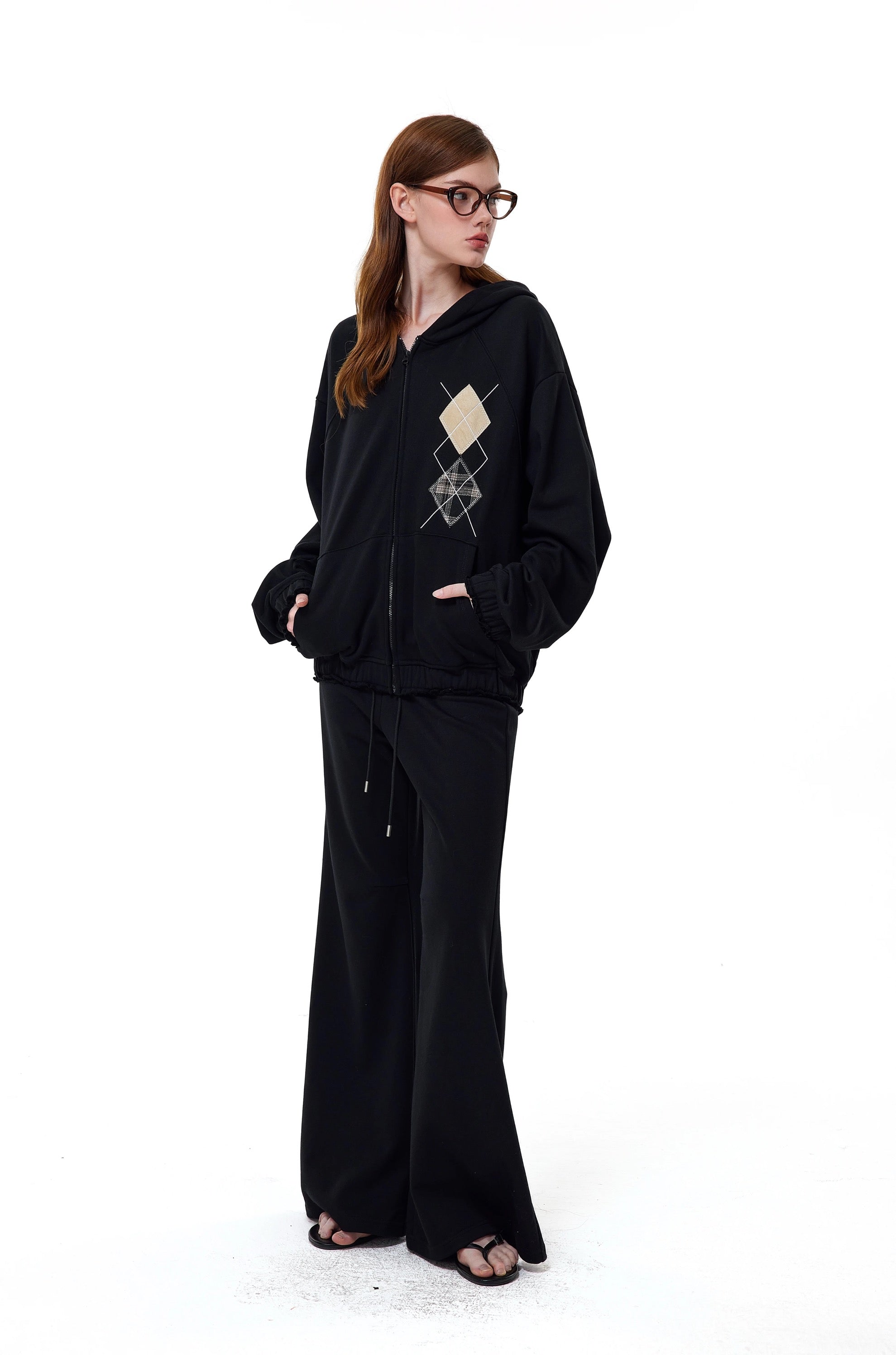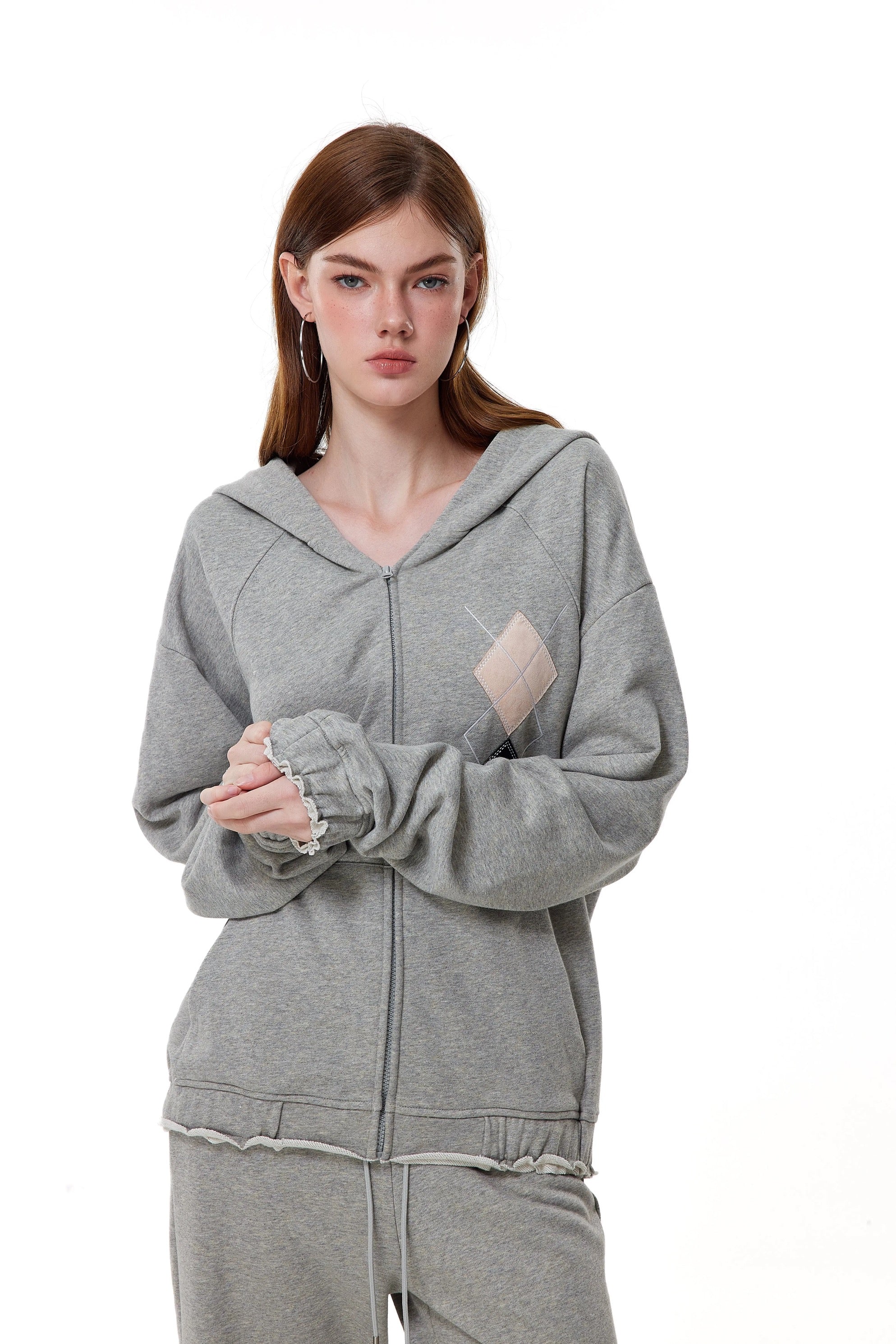 The oversized zip-up hoodie features Reabobo’s signature argyle patch embroidery and frayed hem detail.