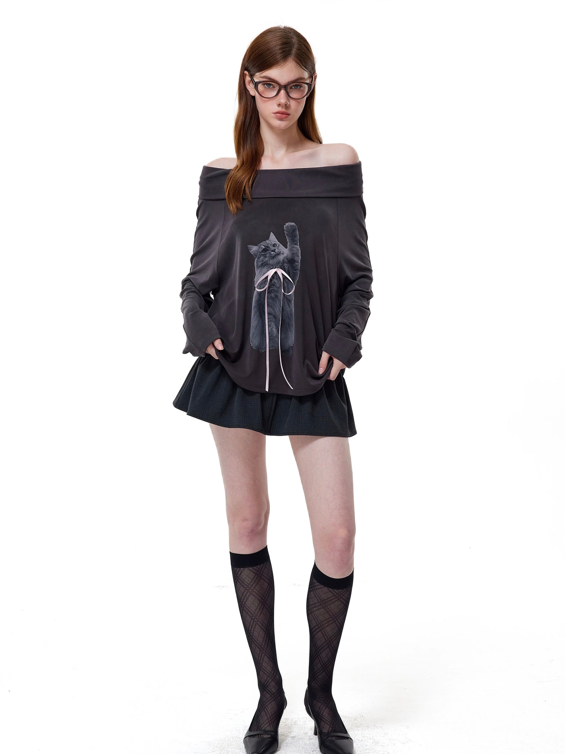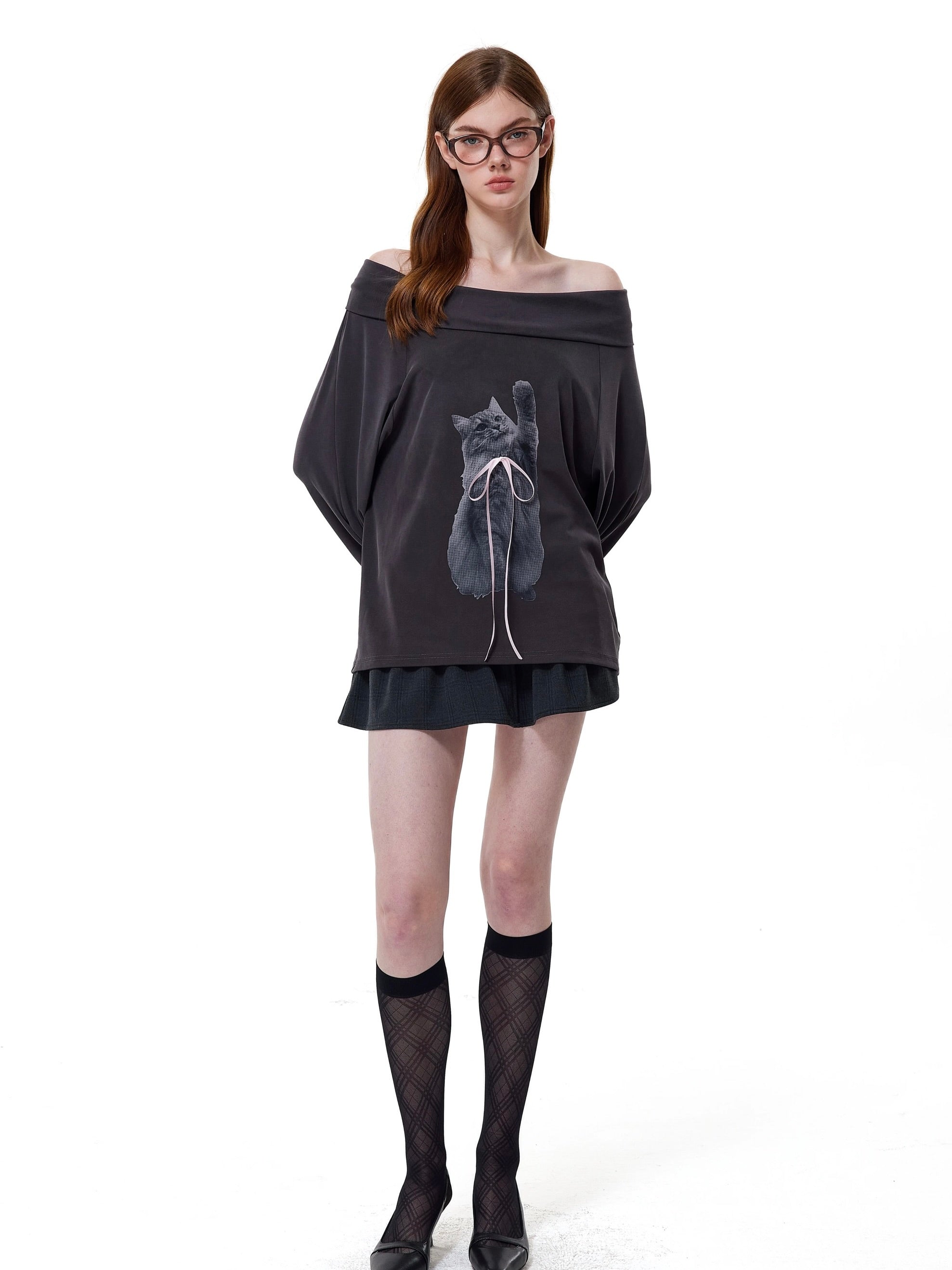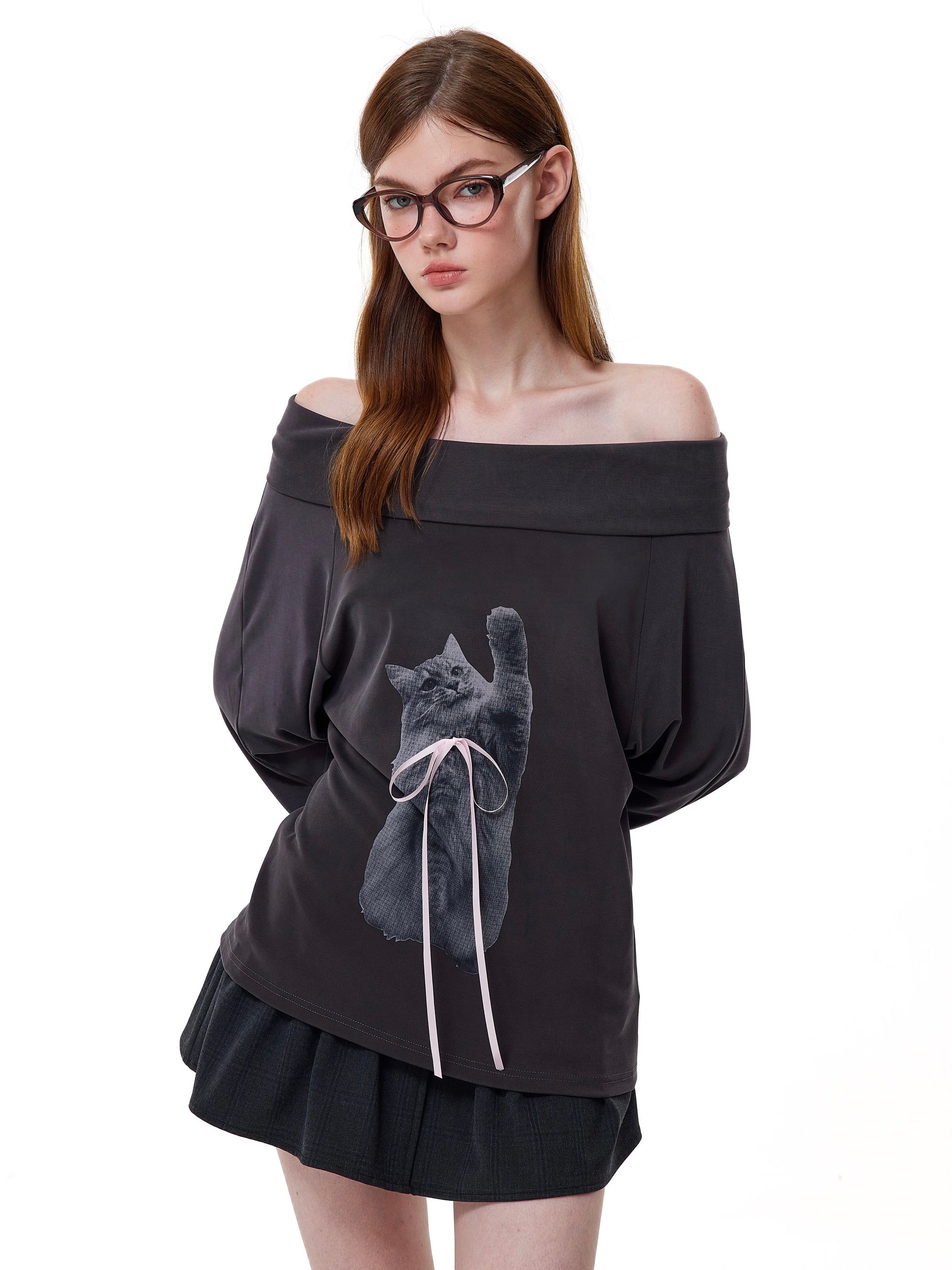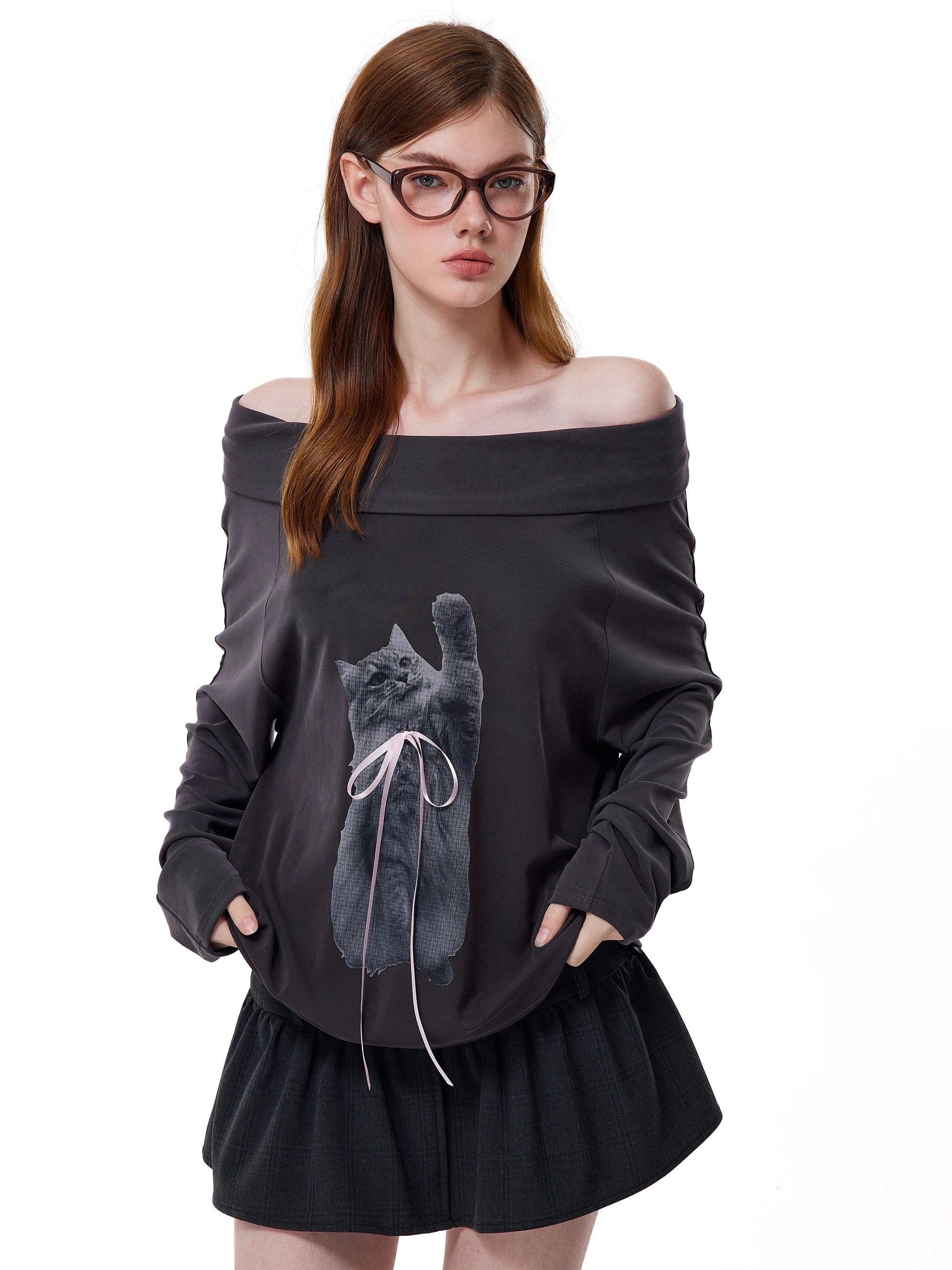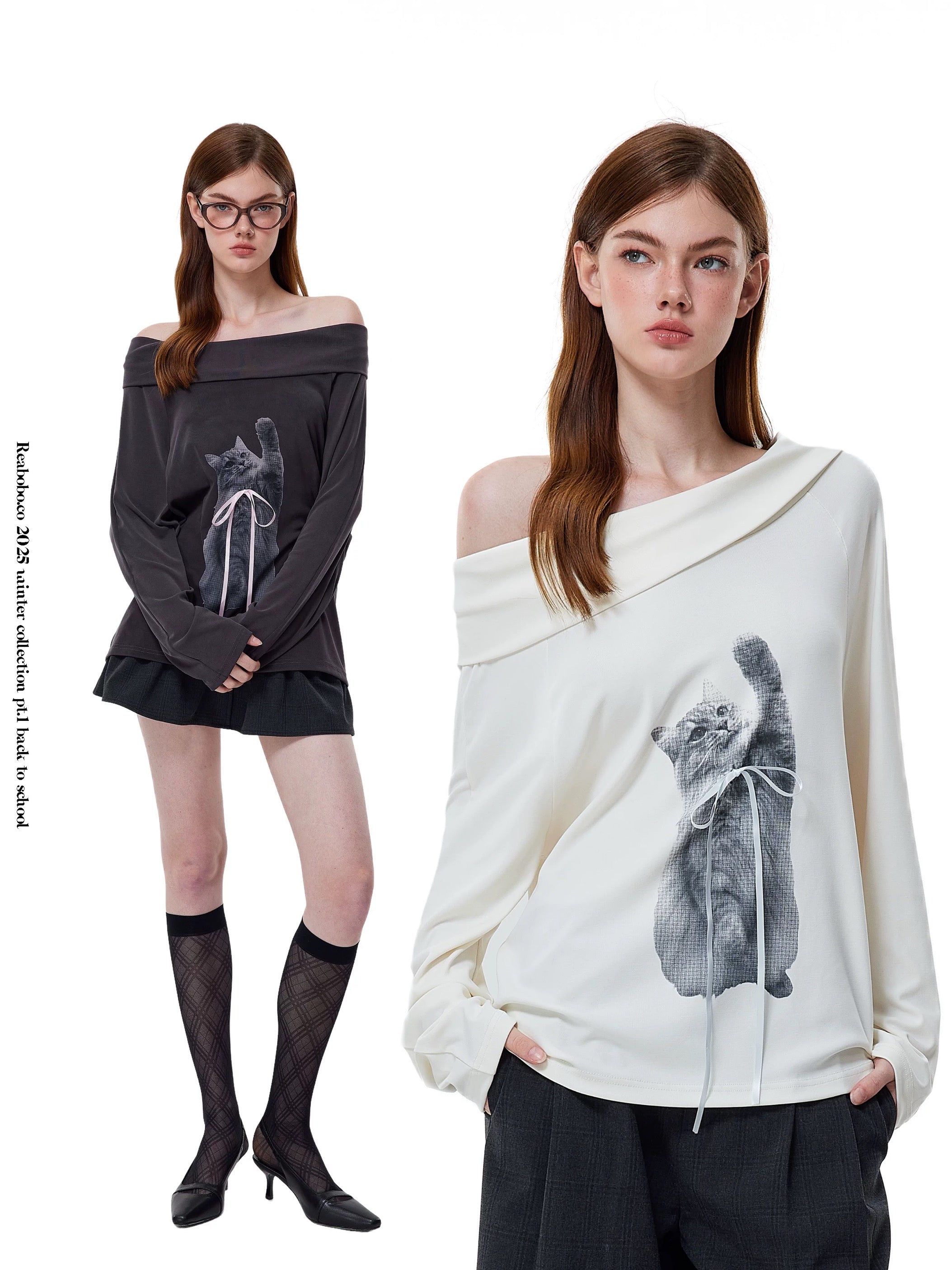 A playful twist on classic comfort — this off-shoulder top by Reabobo.co features a vintage cat print adorned with a soft pink ribbon bow, creating a perfect mix of cute and urban styling.