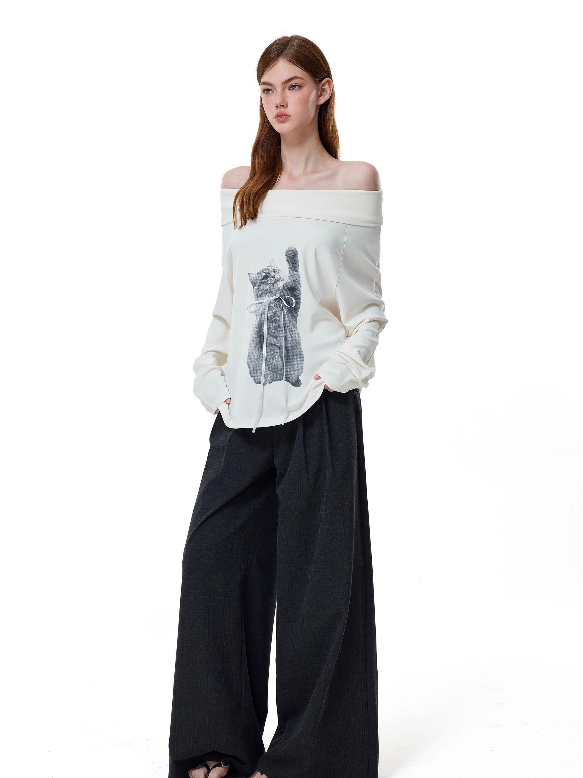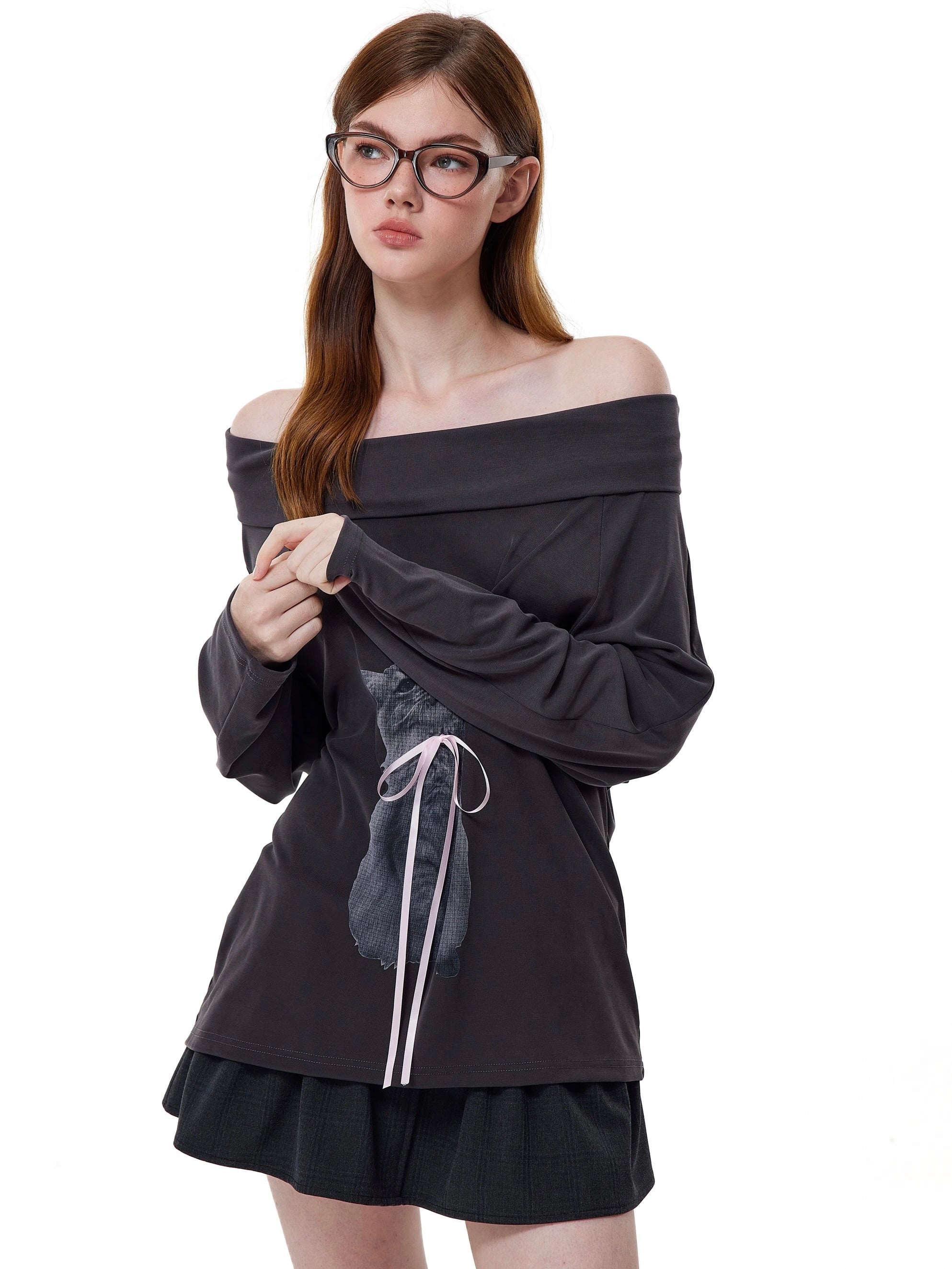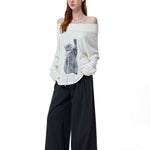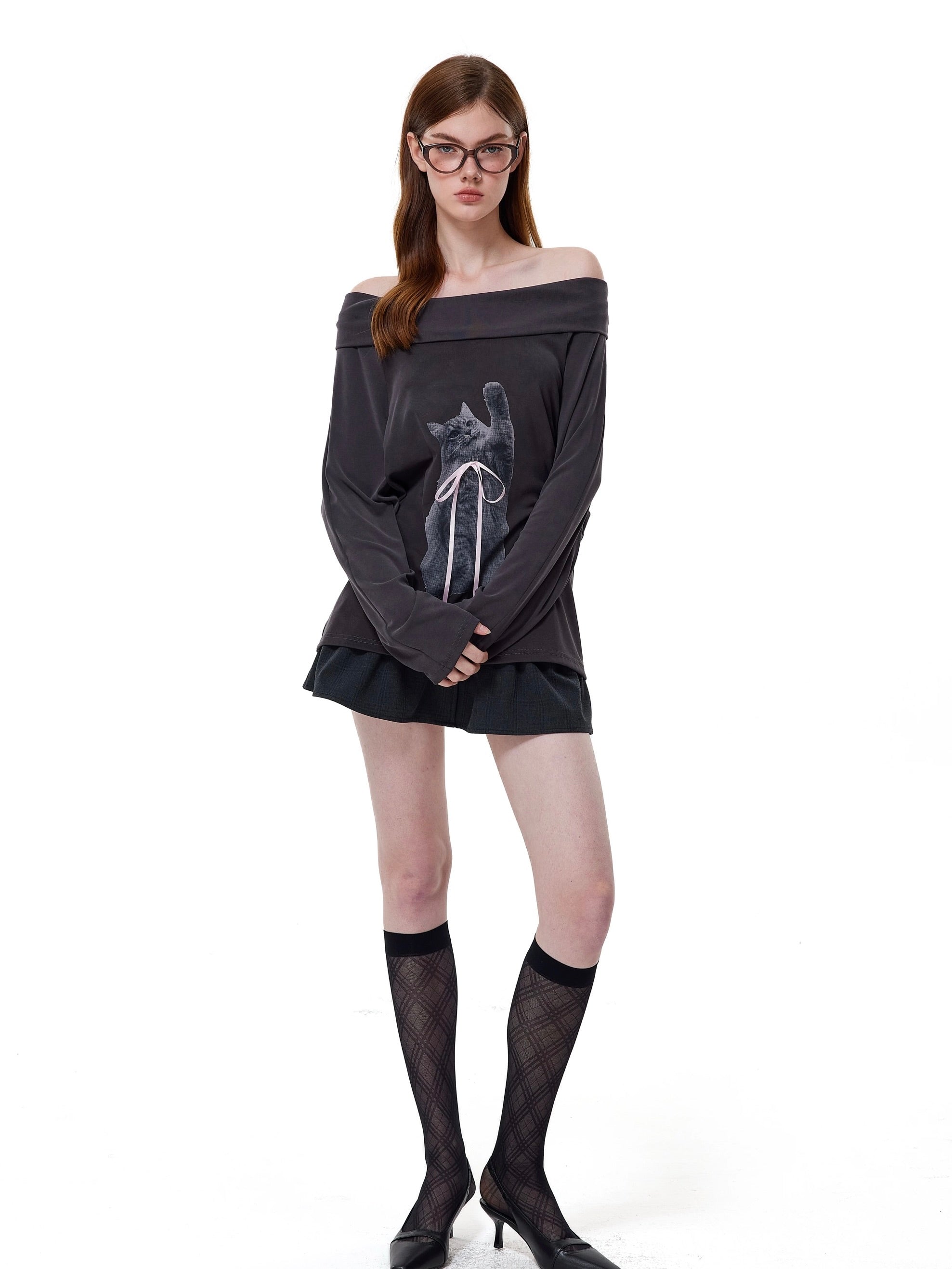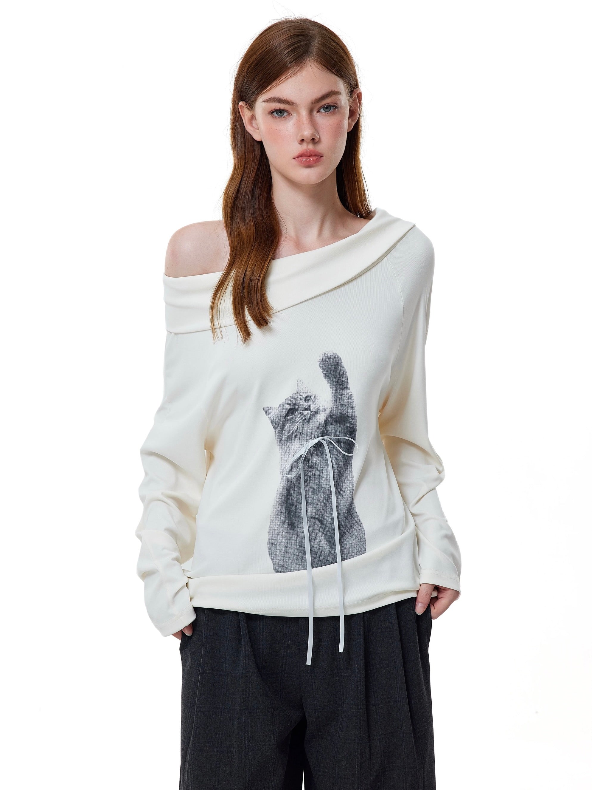 A playful twist on classic comfort — this off-shoulder top by Reabobo.co features a vintage cat print adorned with a soft pink ribbon bow, creating a perfect mix of cute and urban styling.