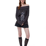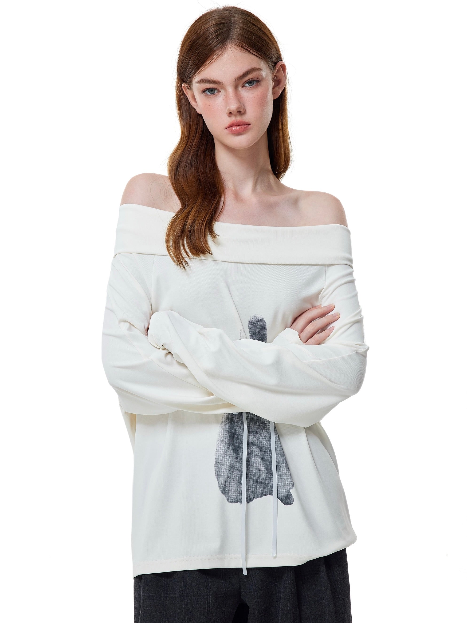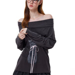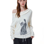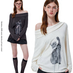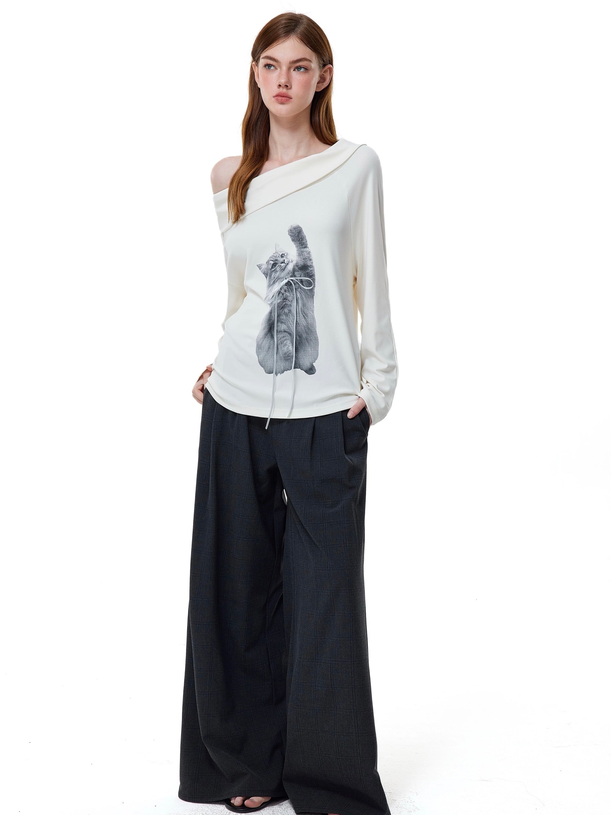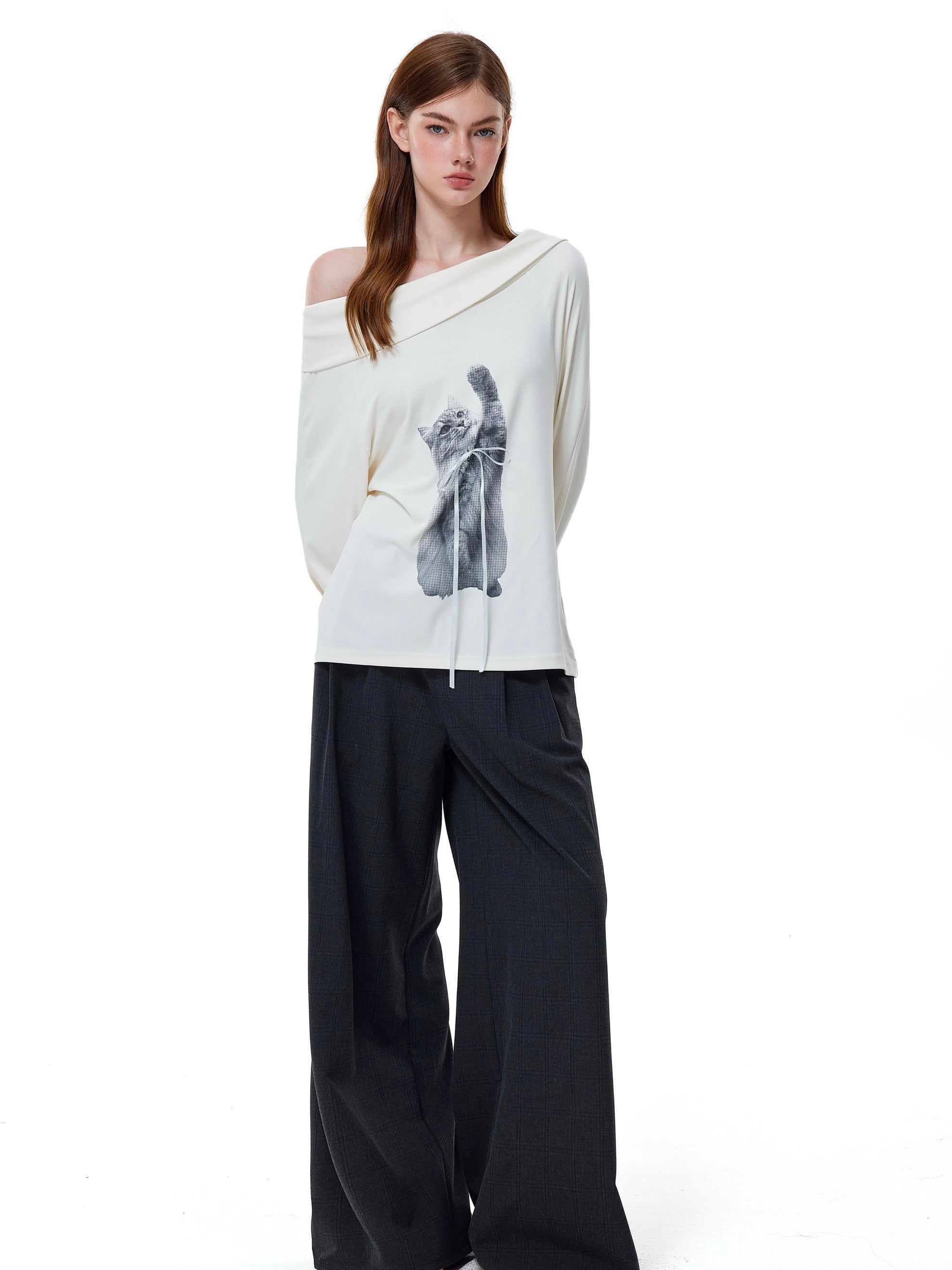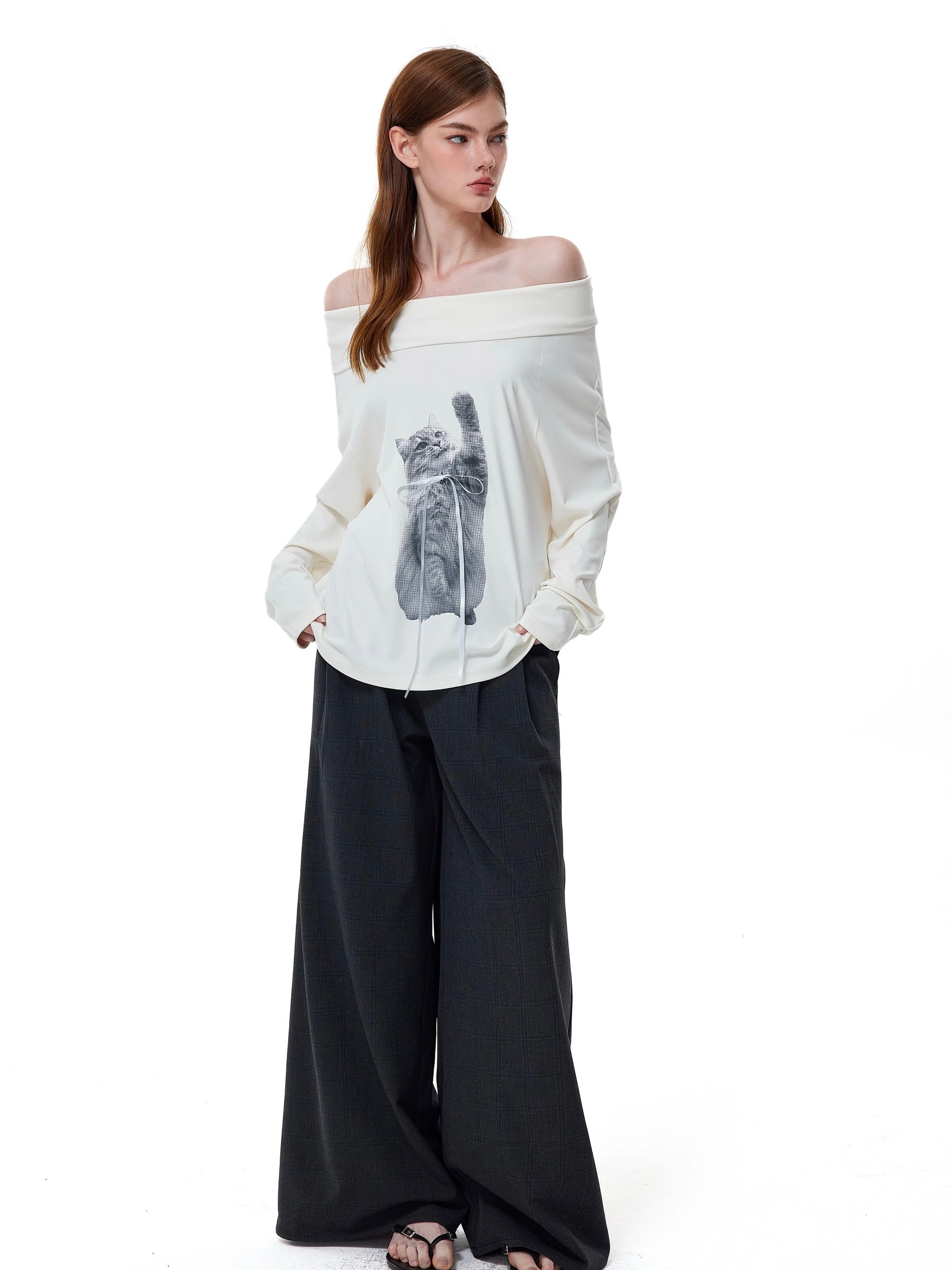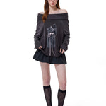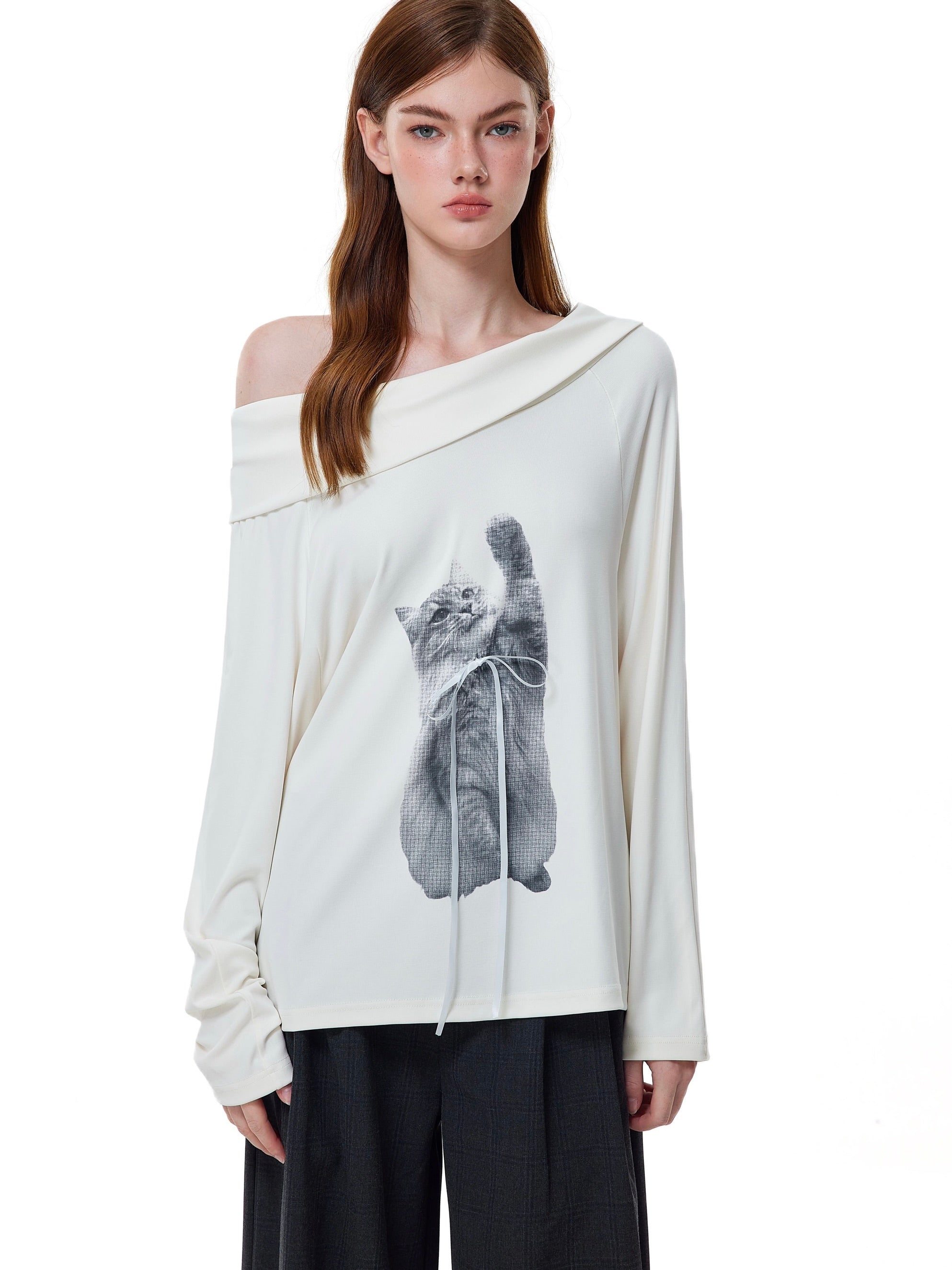 A playful twist on classic comfort — this off-shoulder top by Reabobo.co features a vintage cat print adorned with a soft pink ribbon bow, creating a perfect mix of cute and urban styling.