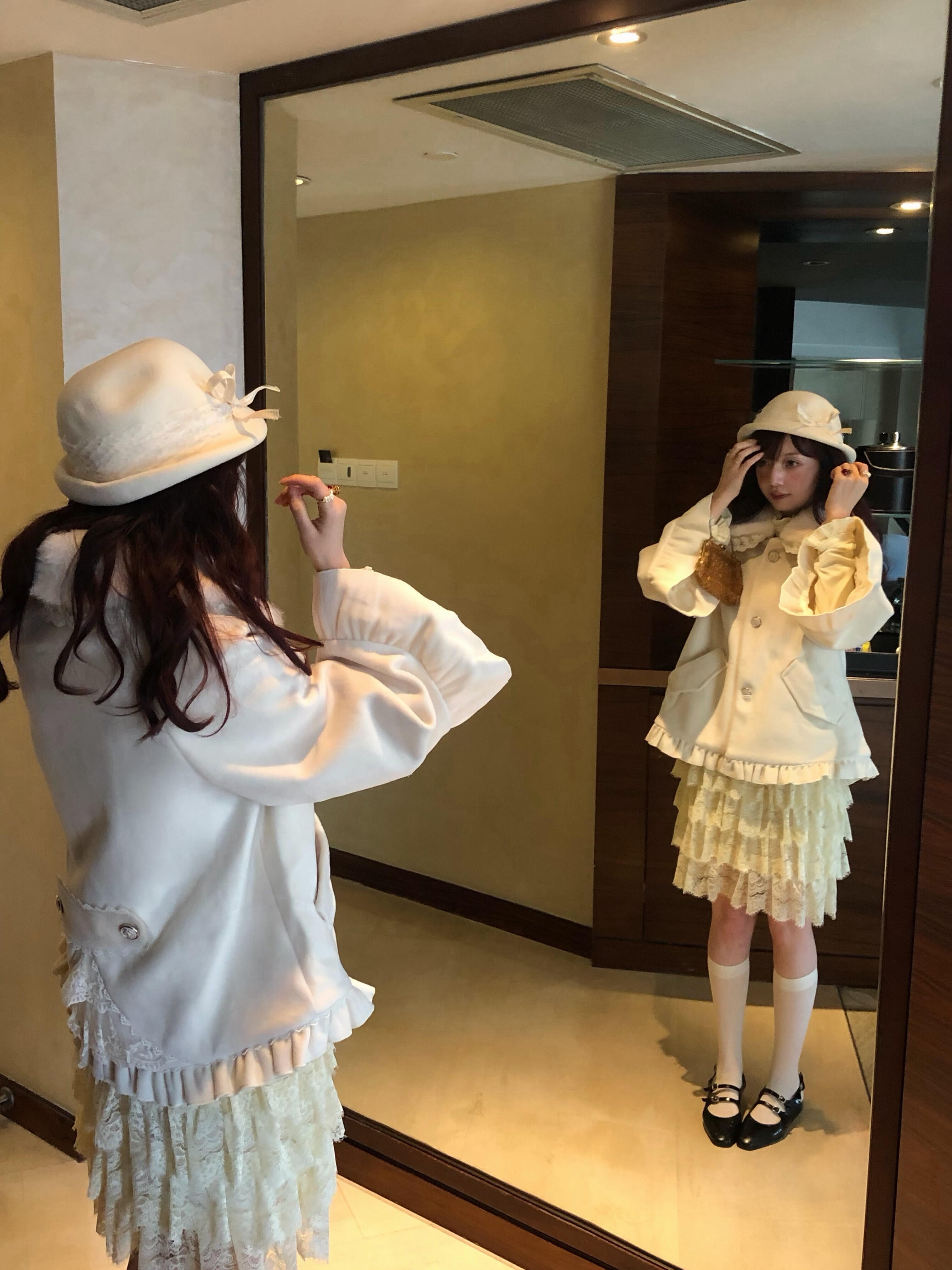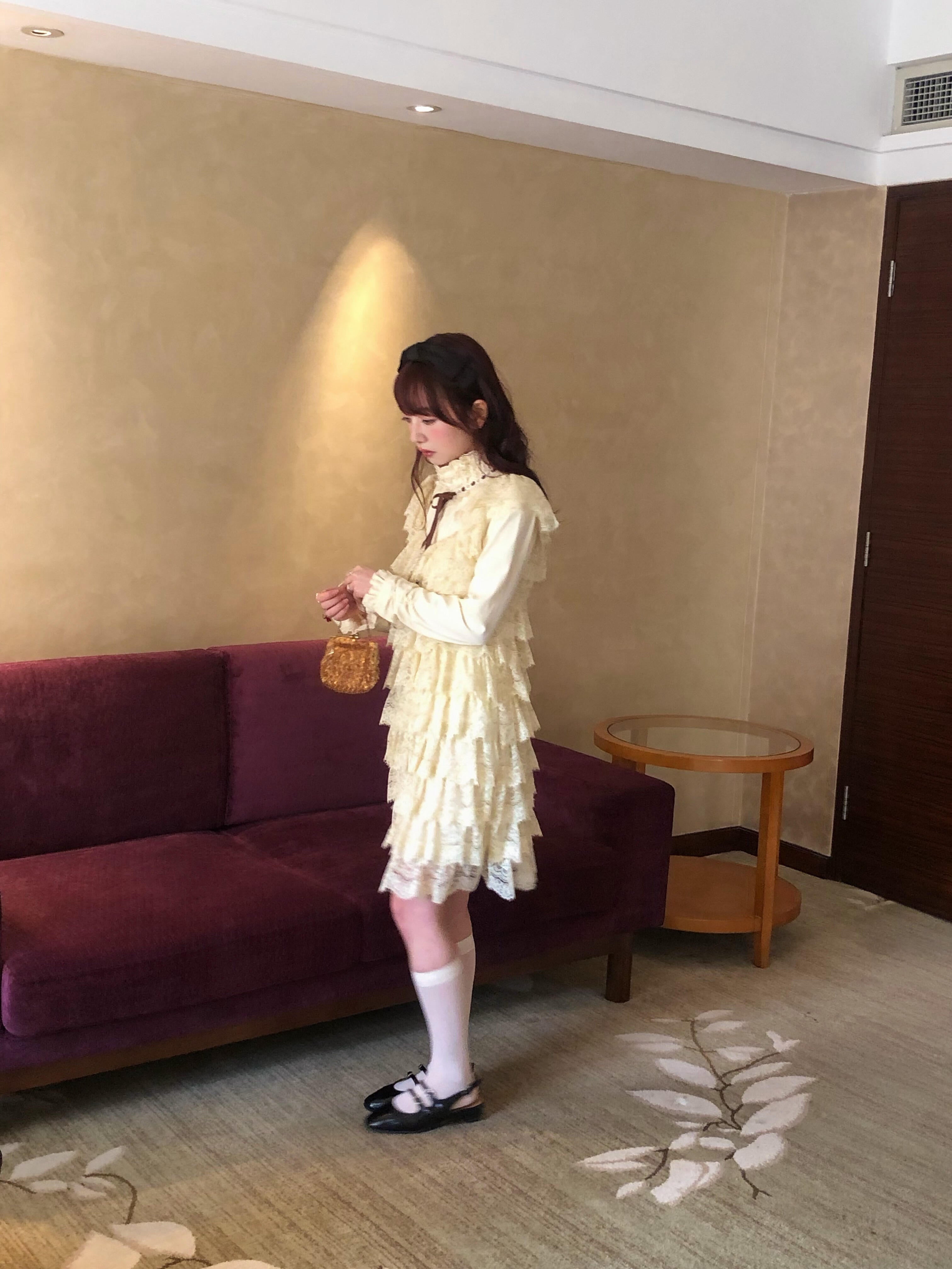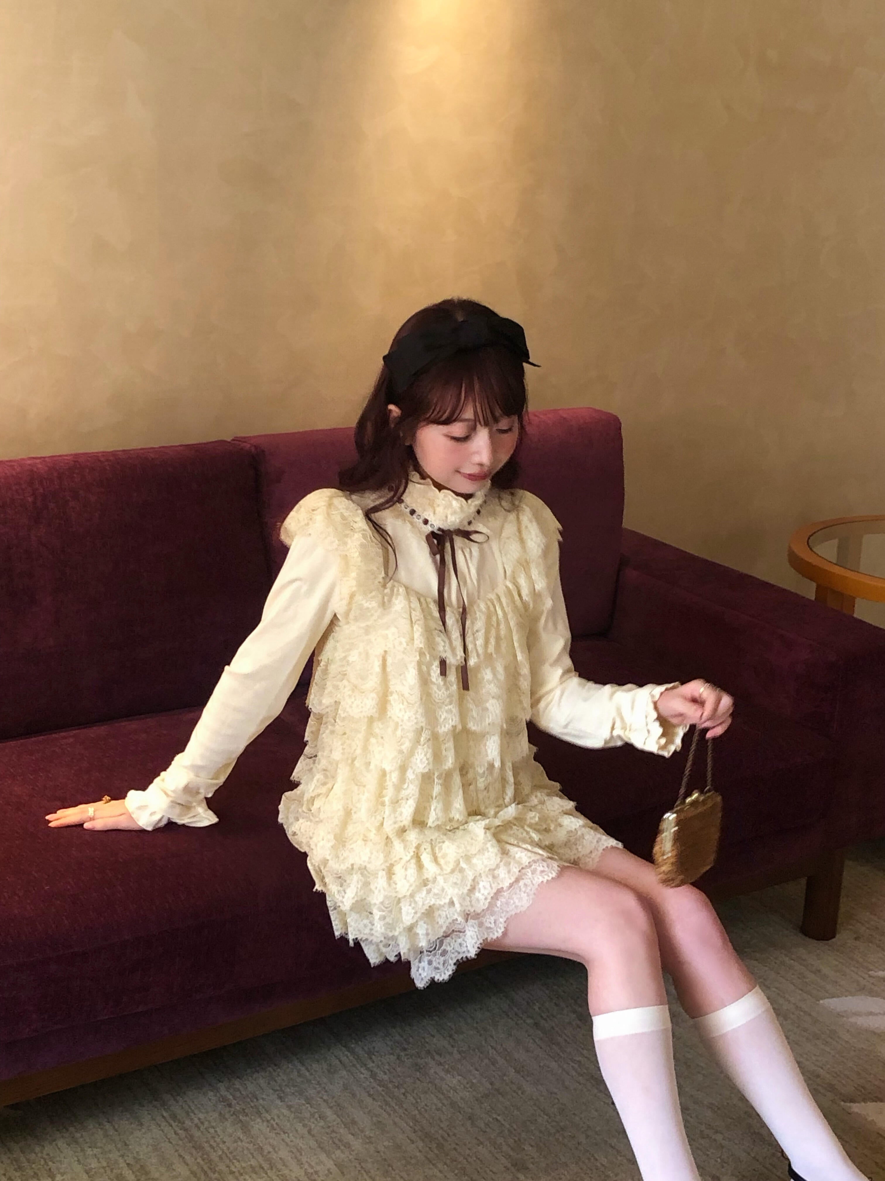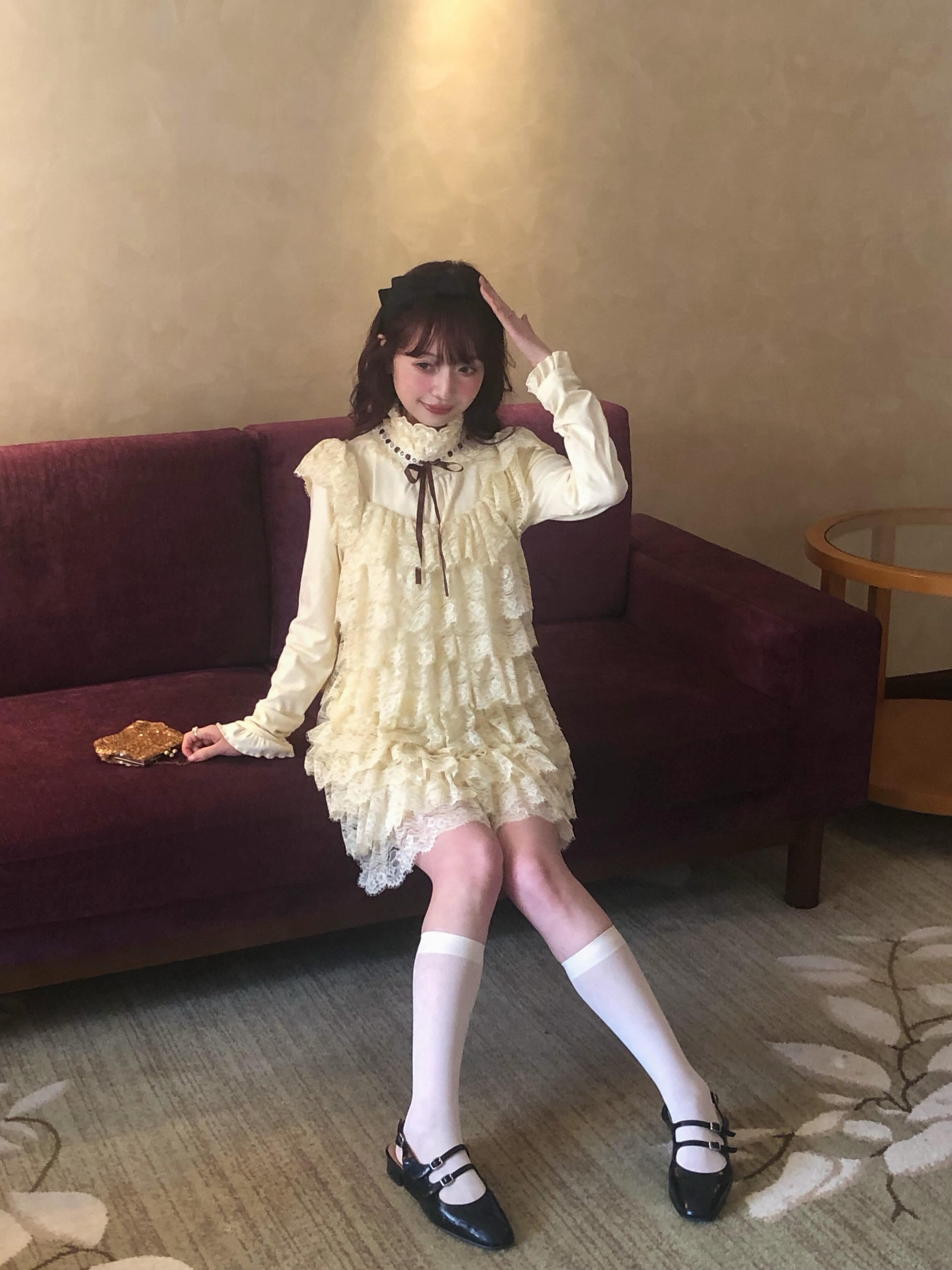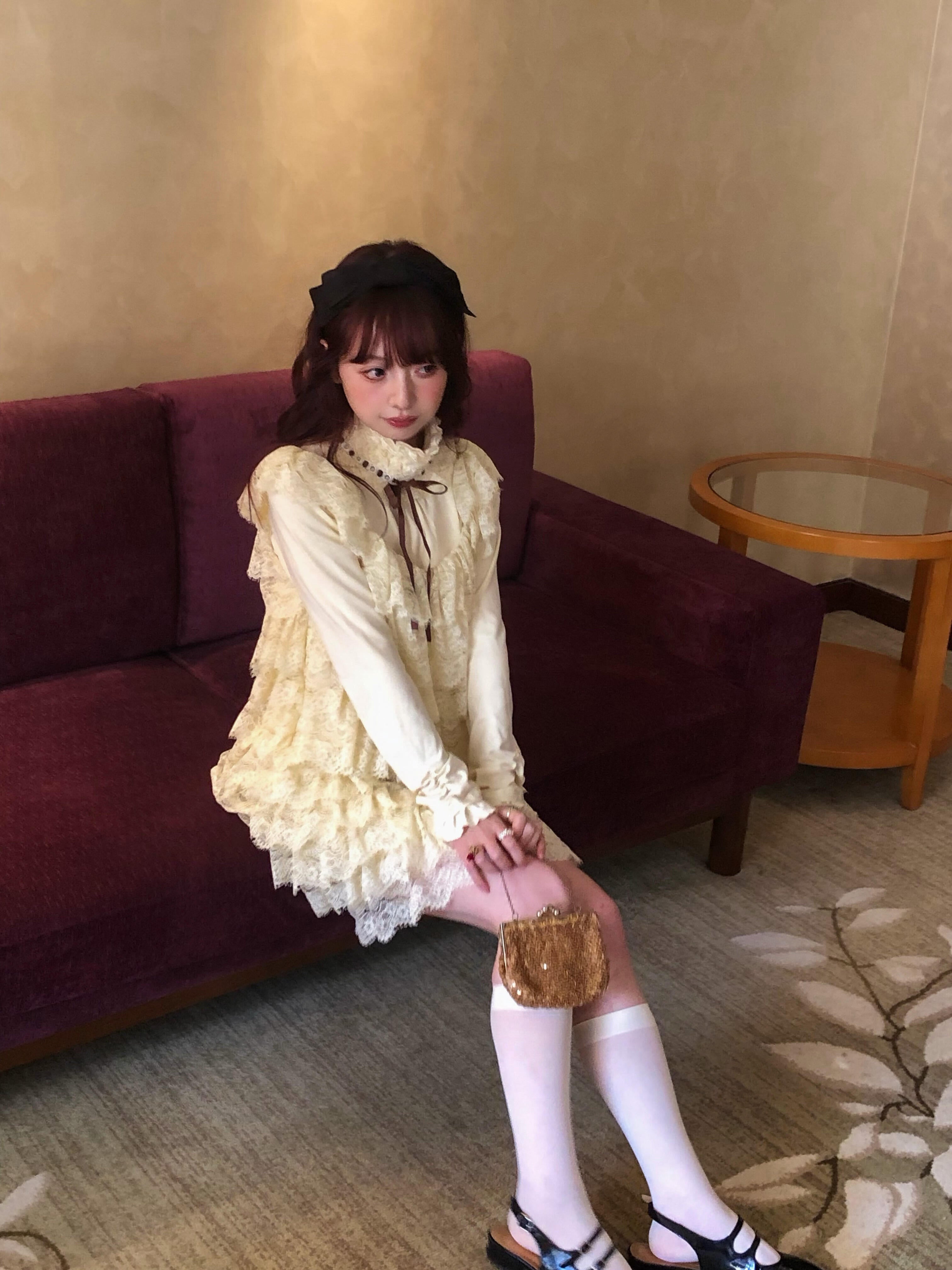 Made with delicate layered lace and silky-soft fabric. The gentle apricot tone brings warmth and softness. Perfect for layering over a blouse or knit top — or wearing alone for a dreamy, coquette-core look.