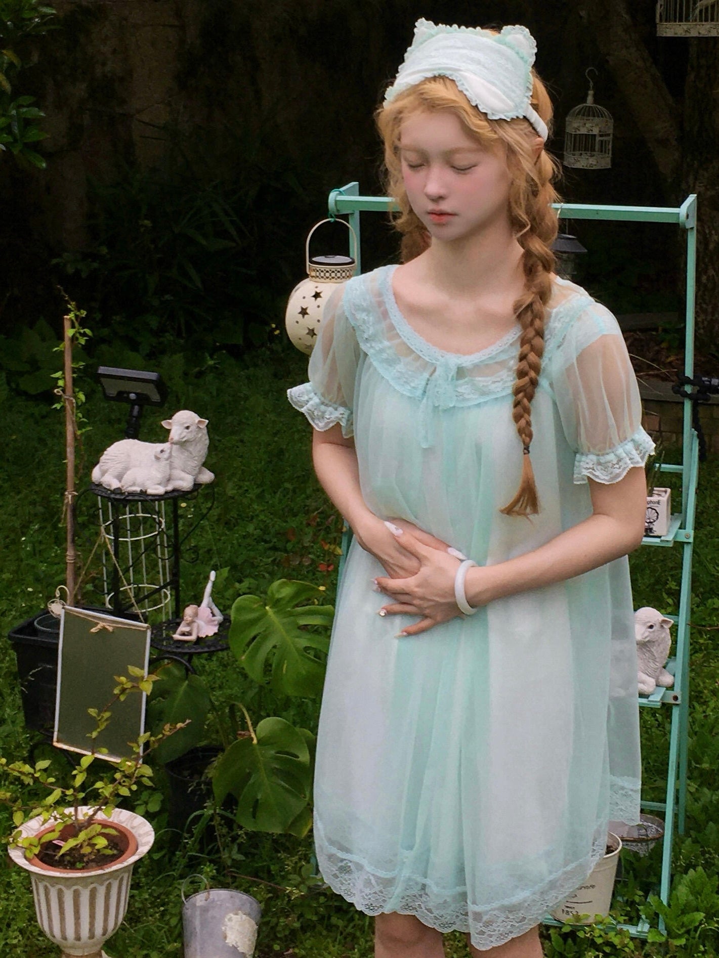 Paired with the airy tulle overlay, the look feels like a vintage doll stepping out of a dream.