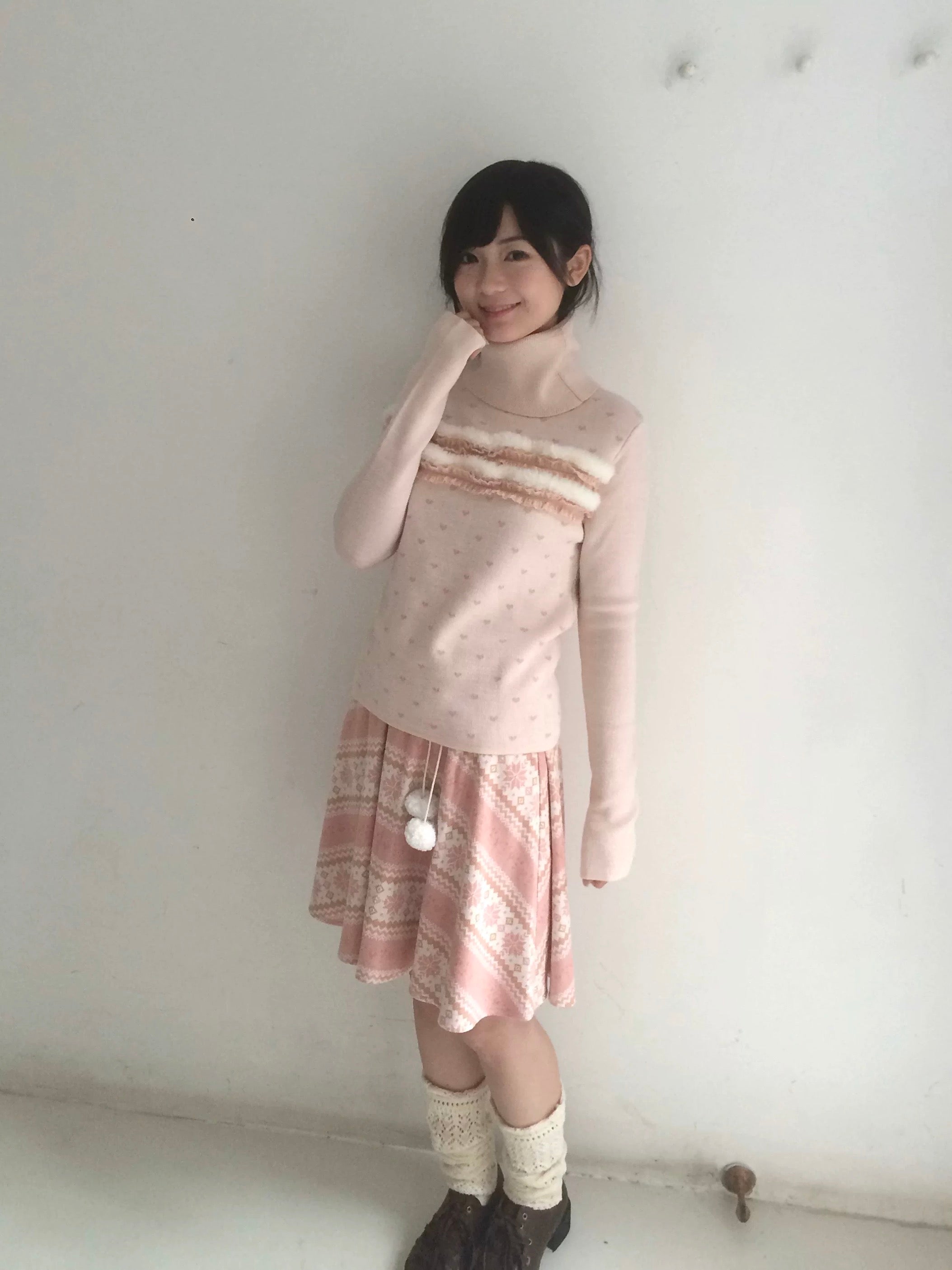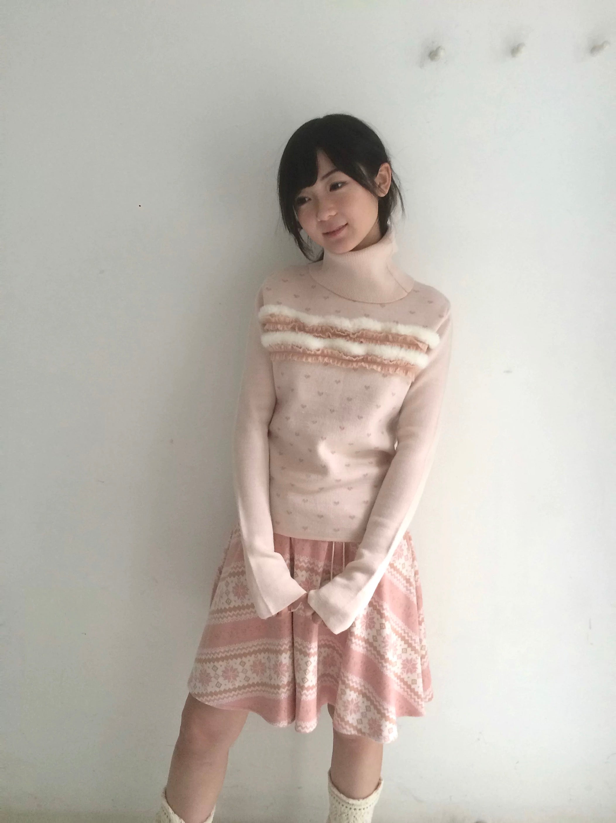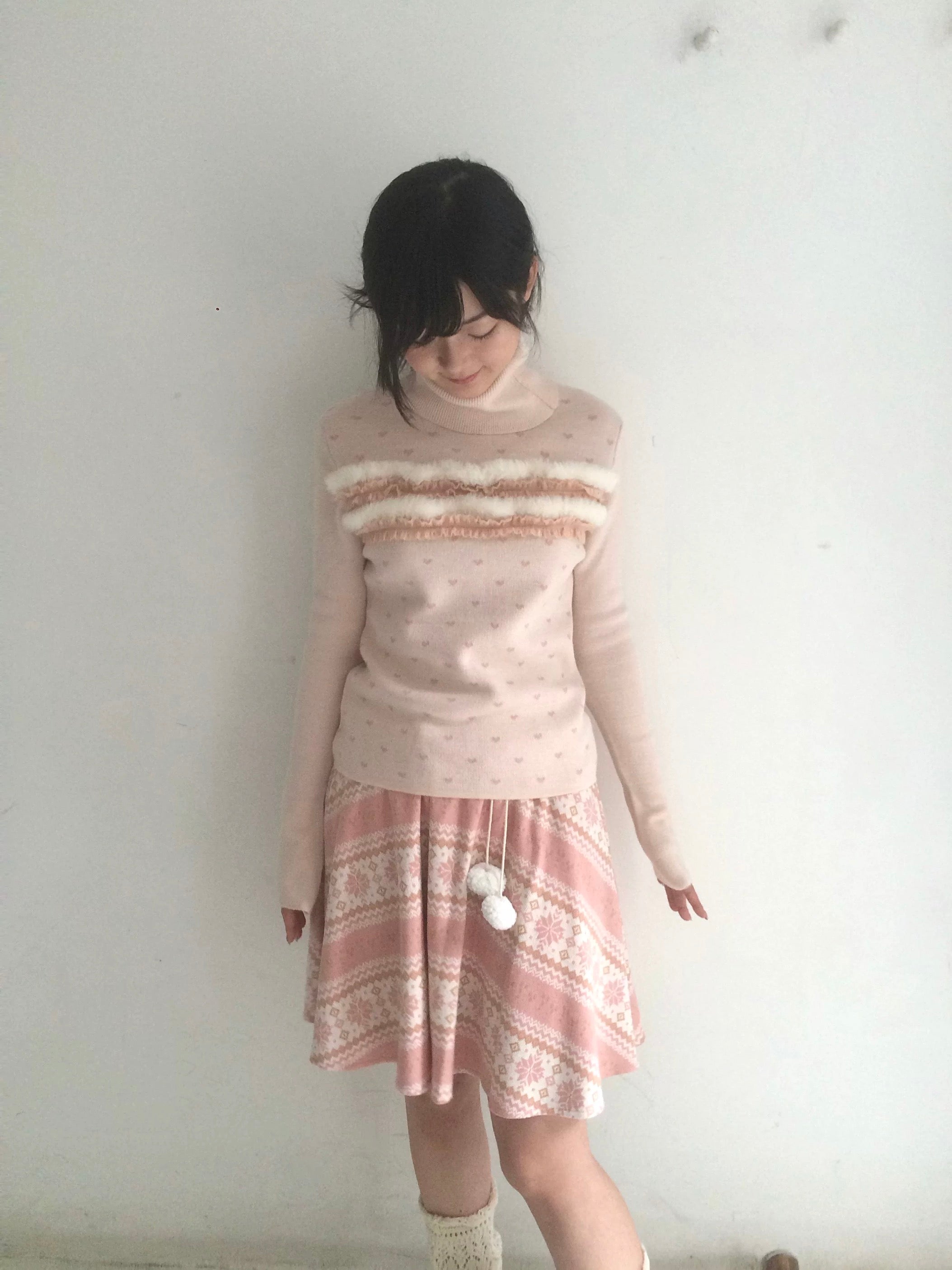 A soft blush-pink turtleneck sweater adorned with tiny heart jacquard motifs across the entire body, creating a gentle and romantic winter look.