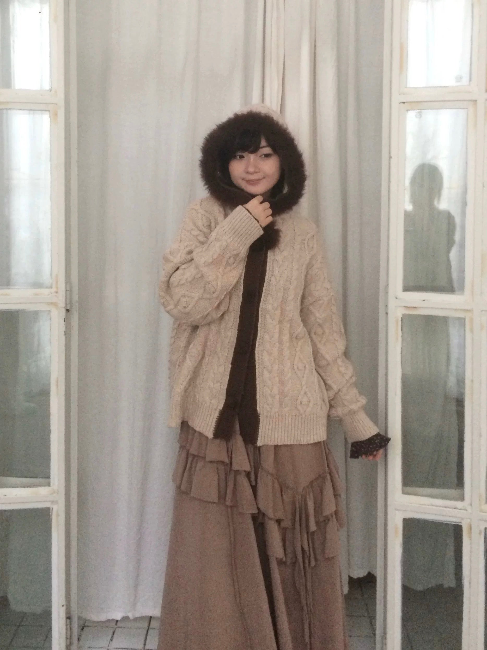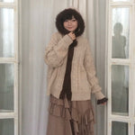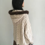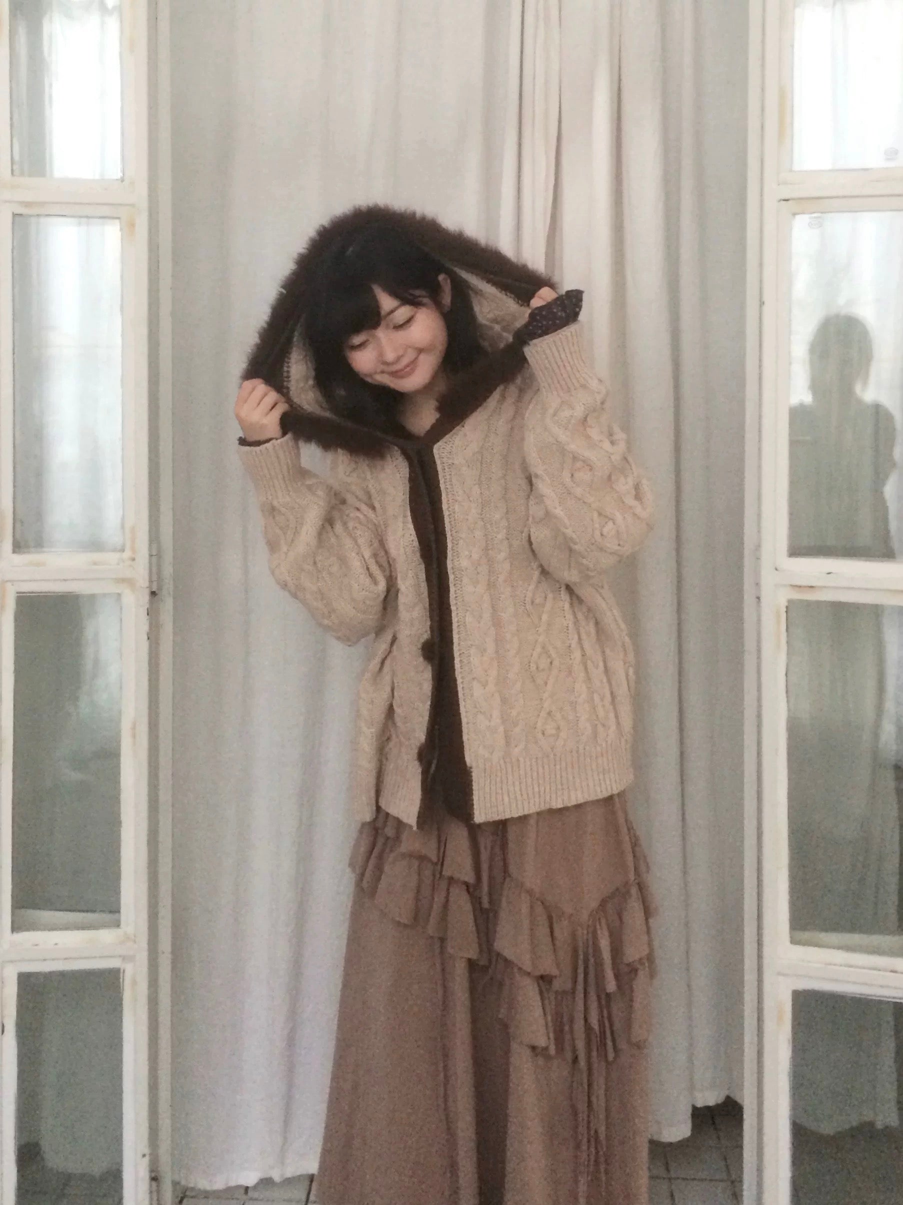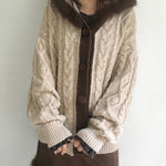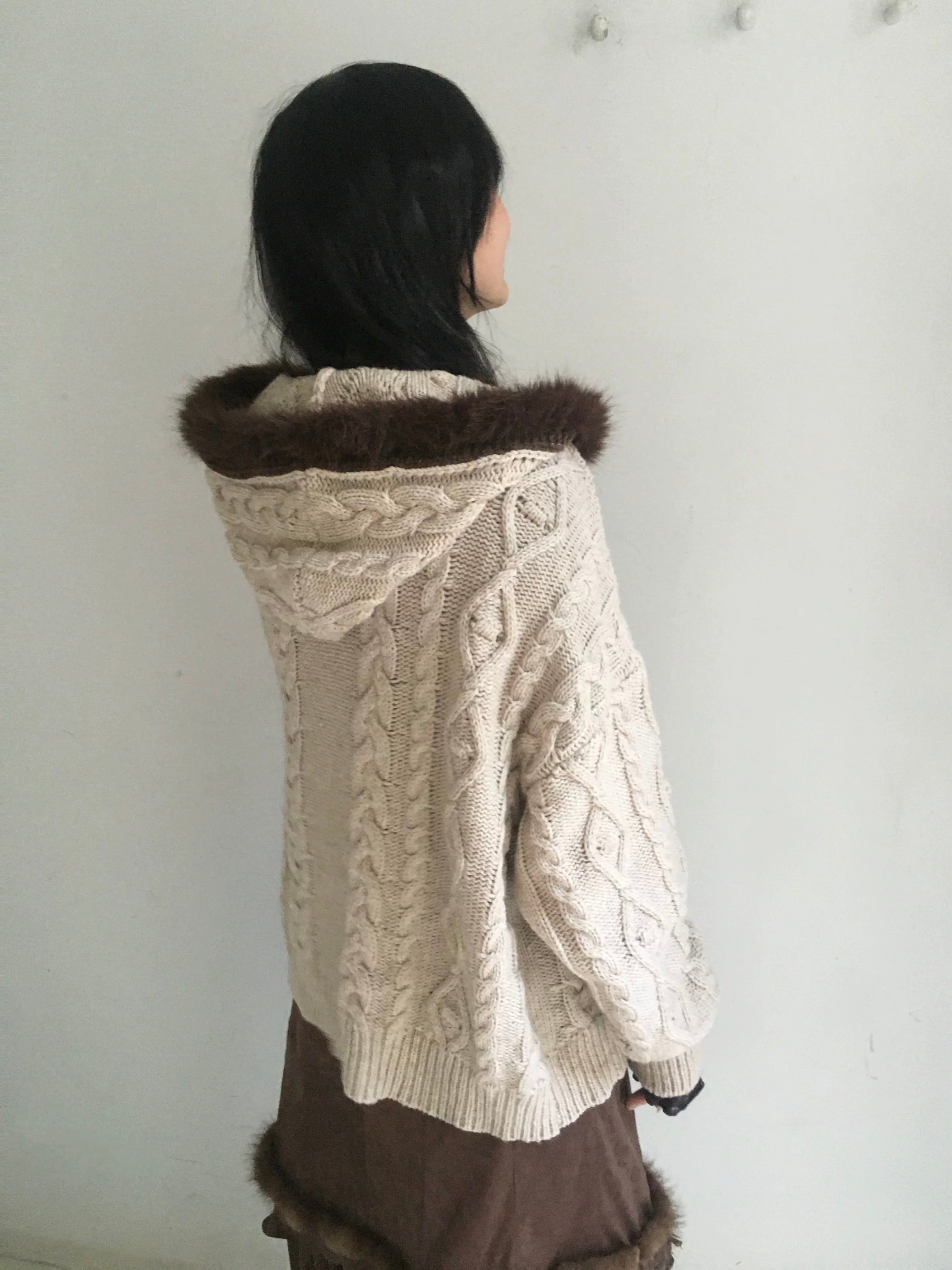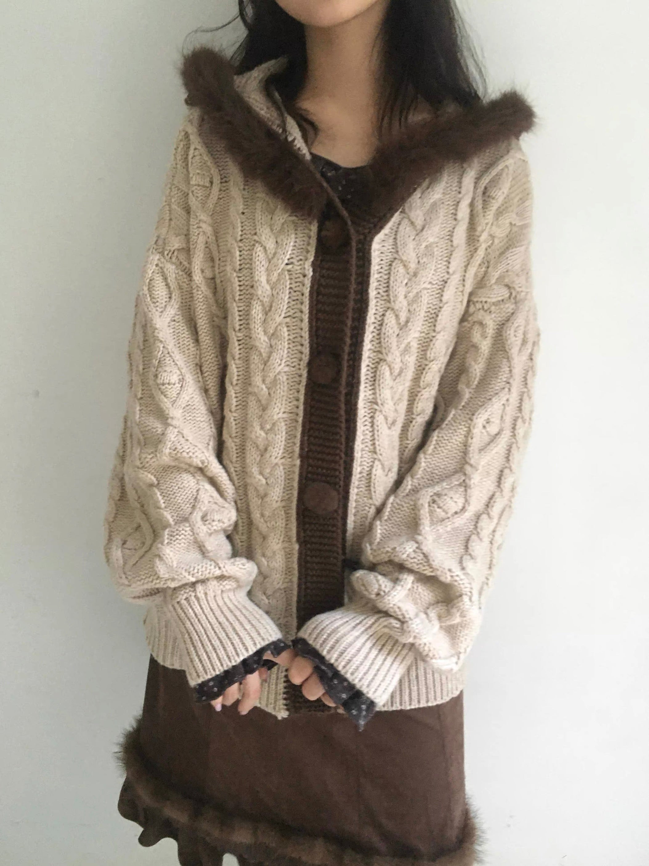 A warm and vintage knit cardigan designed in a soft almond tone, paired with a plush faux-fur trim along the hood and placket.
